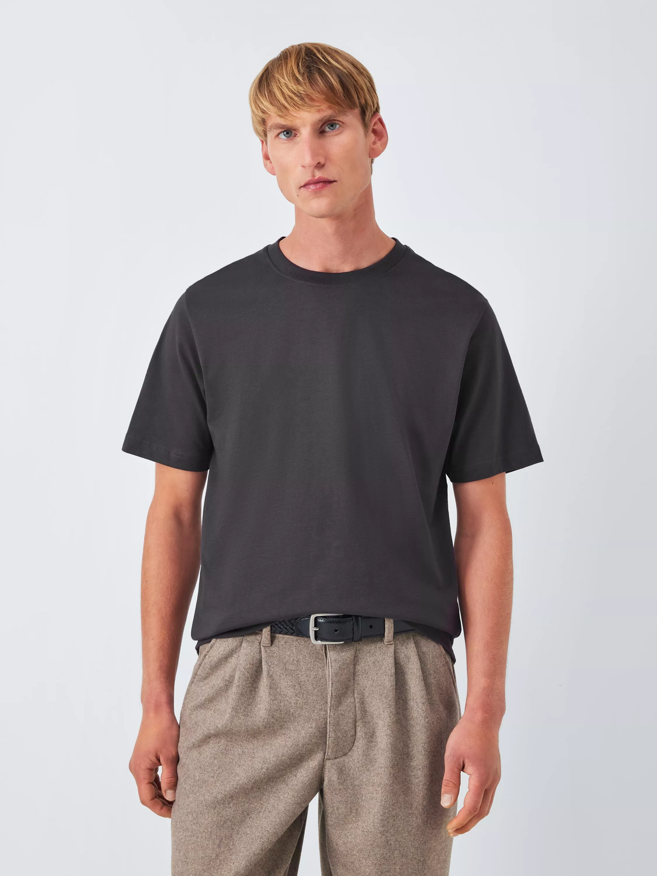 A plain cotton crew-neck T-shirt with ribbed detailing at the neckline and short sleeves.