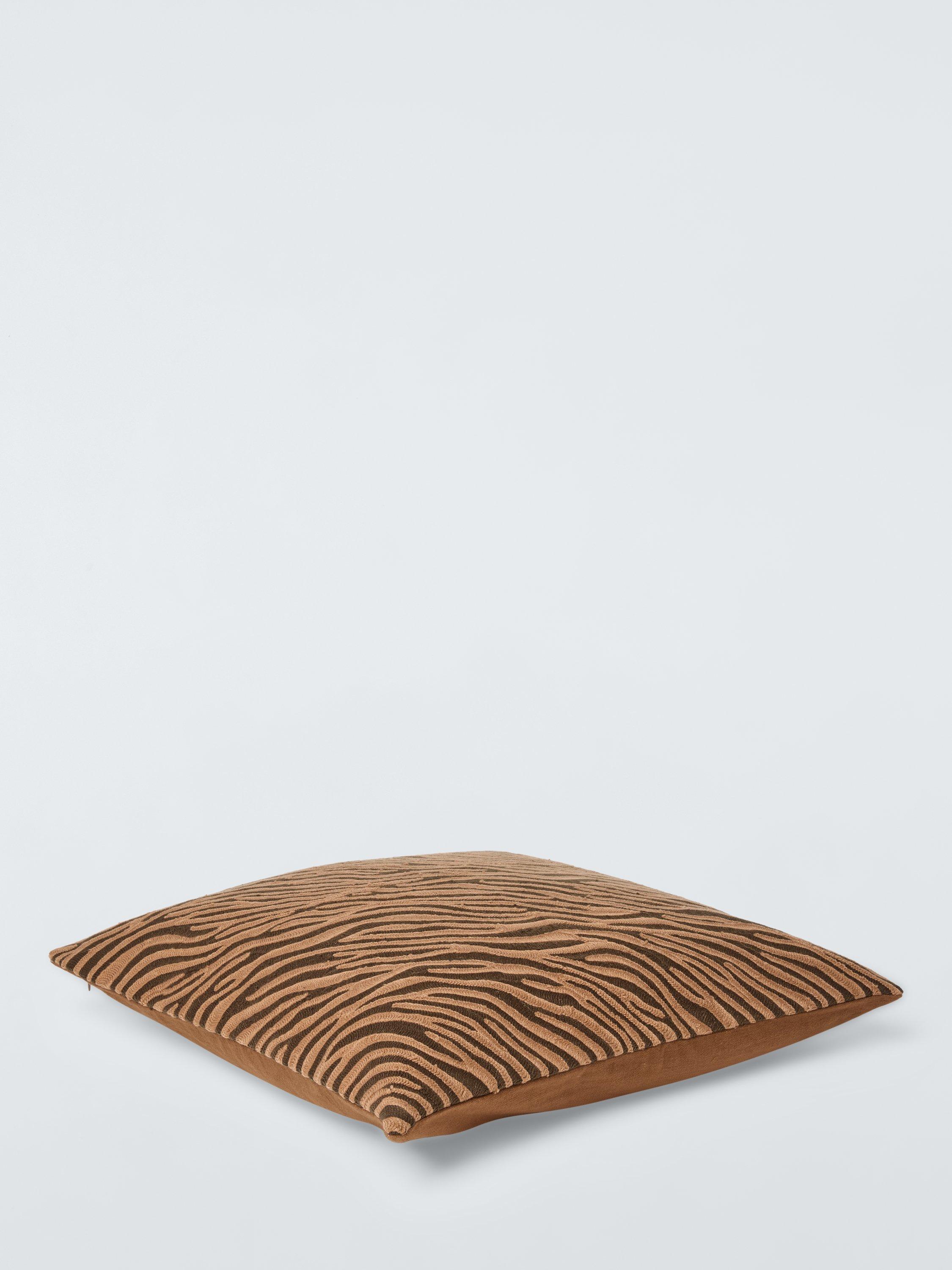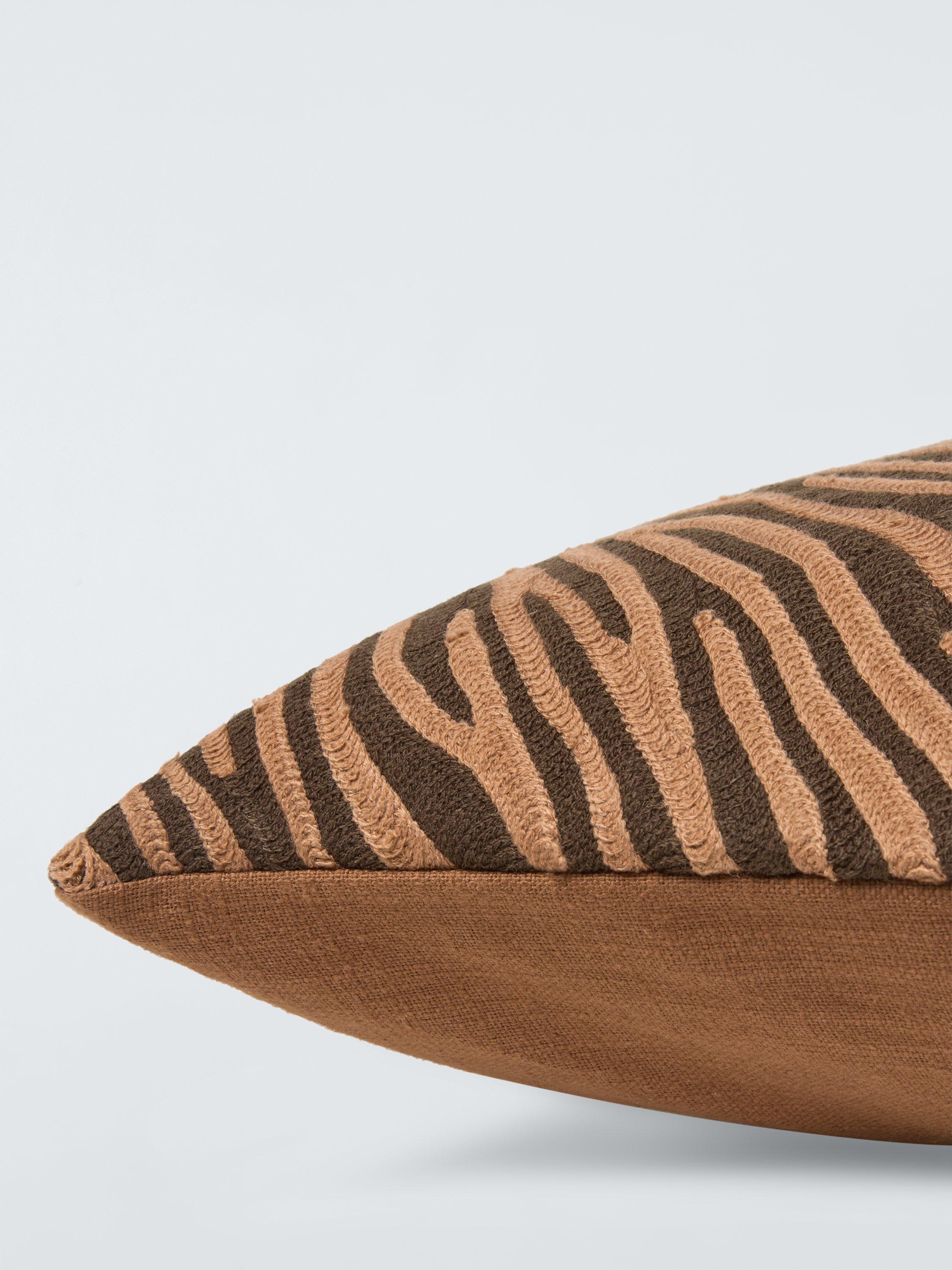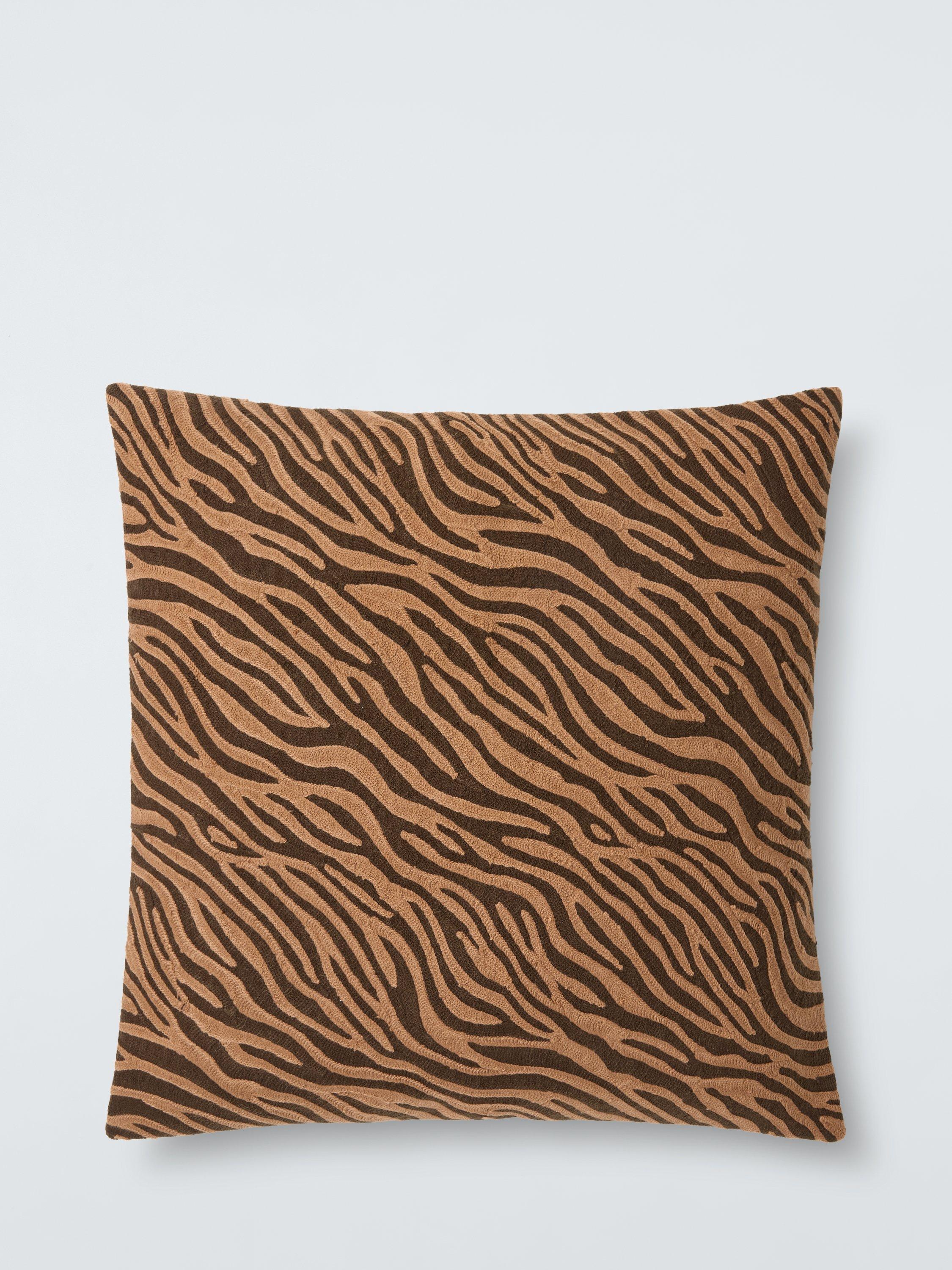 Machine embroidered crewel work makes up the tiger skin pattern on this feather-filled cushion.