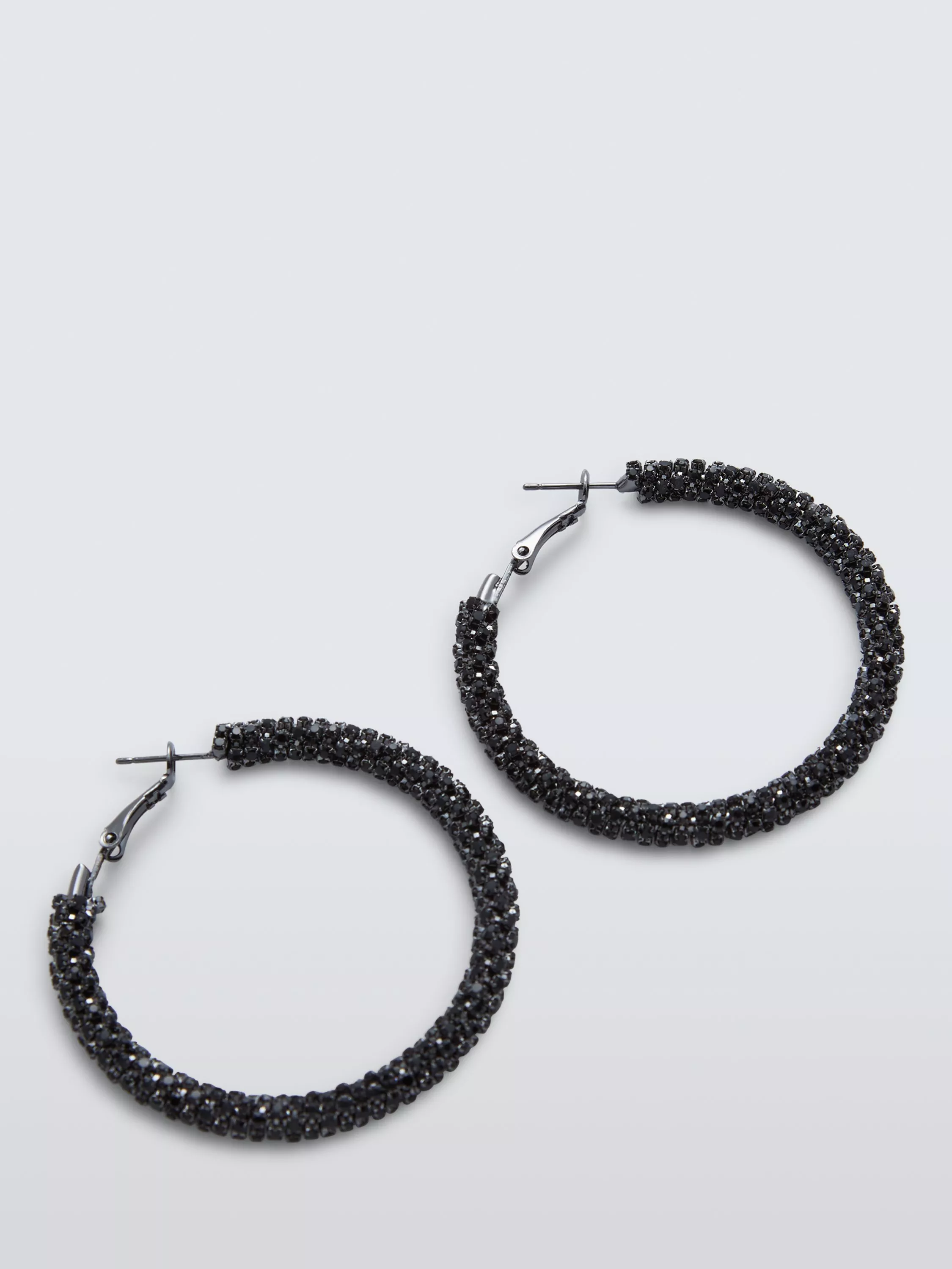 These striking statement earrings are designed to elevate any look instantly. Showcasing gunmetal crystals set on pewter-plated hoops, these earrings fasten with a through hinge and are suitable for pierced ears only.