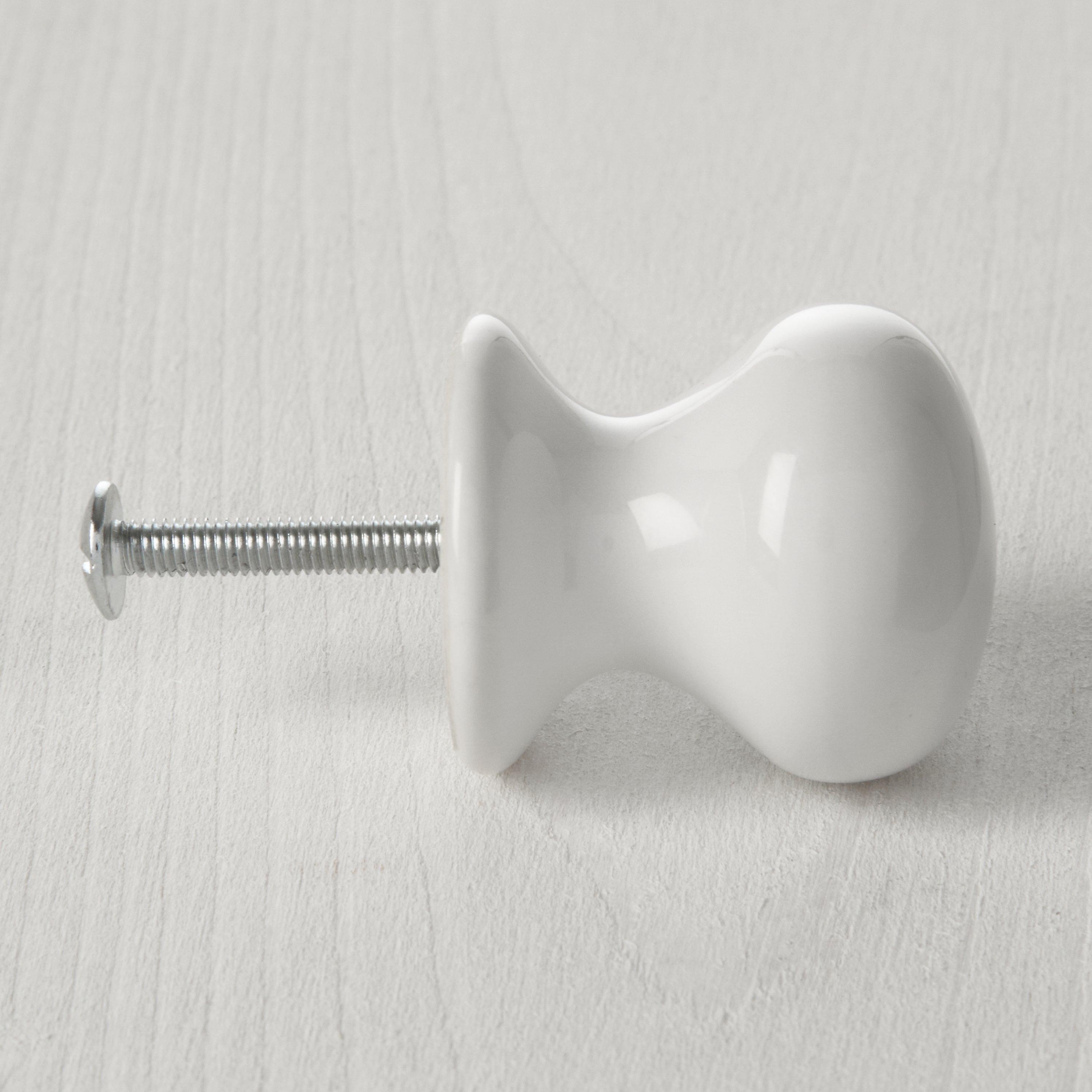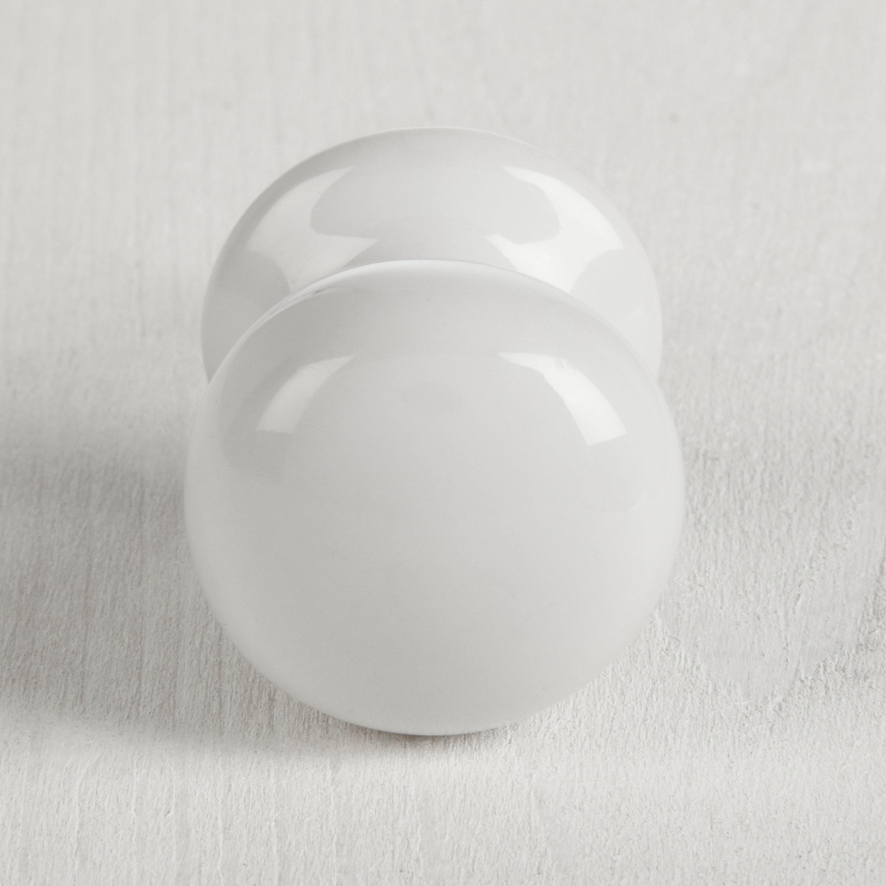 A plain white porcelain cupboard knob.