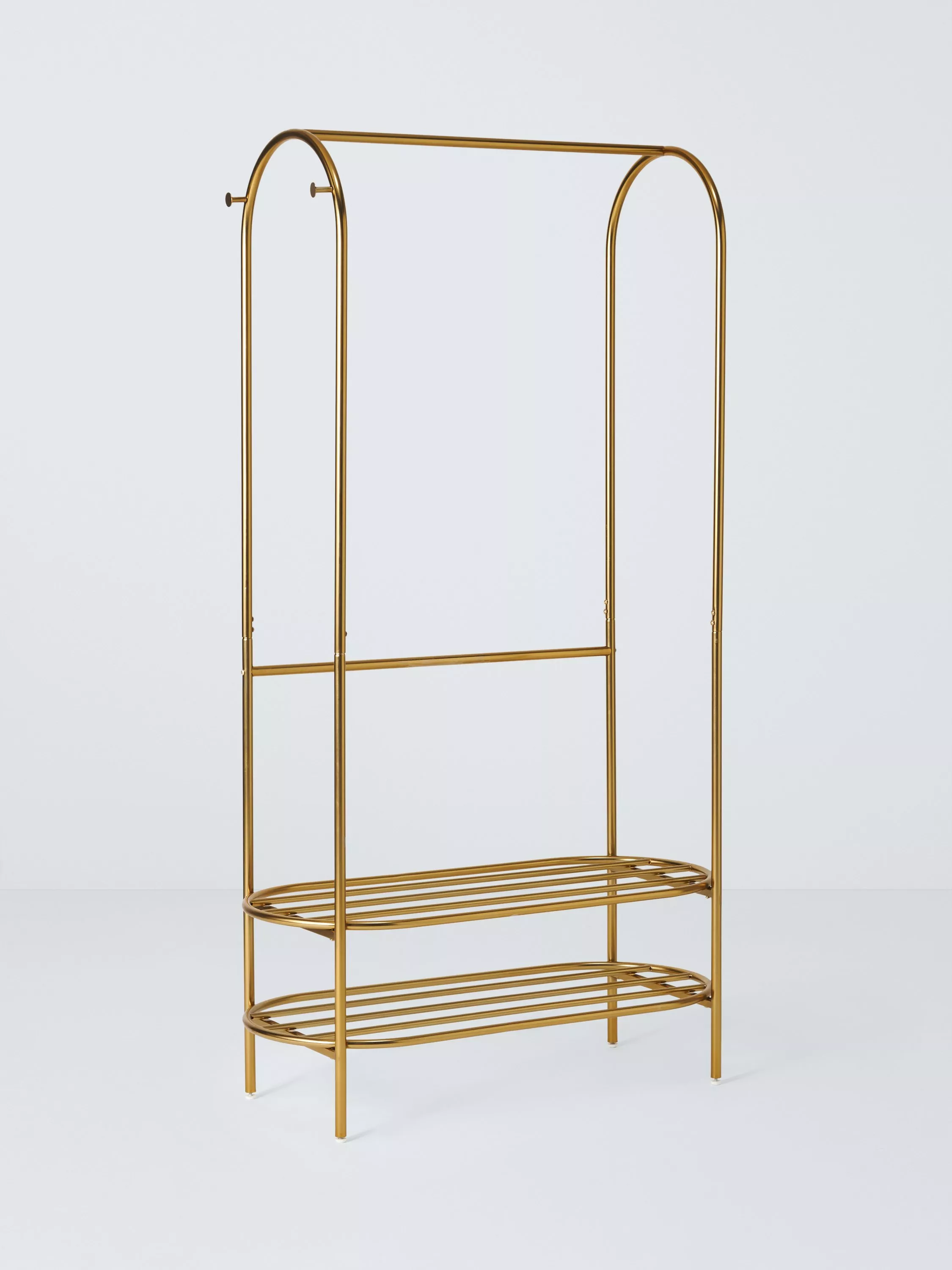 Raise your guest room game with this gold metal clothes rail. Delightfully curvy, it features two bottom racks for shoes, plenty of hanging space and two metal knobs for hanging scarves, hats or bags.
