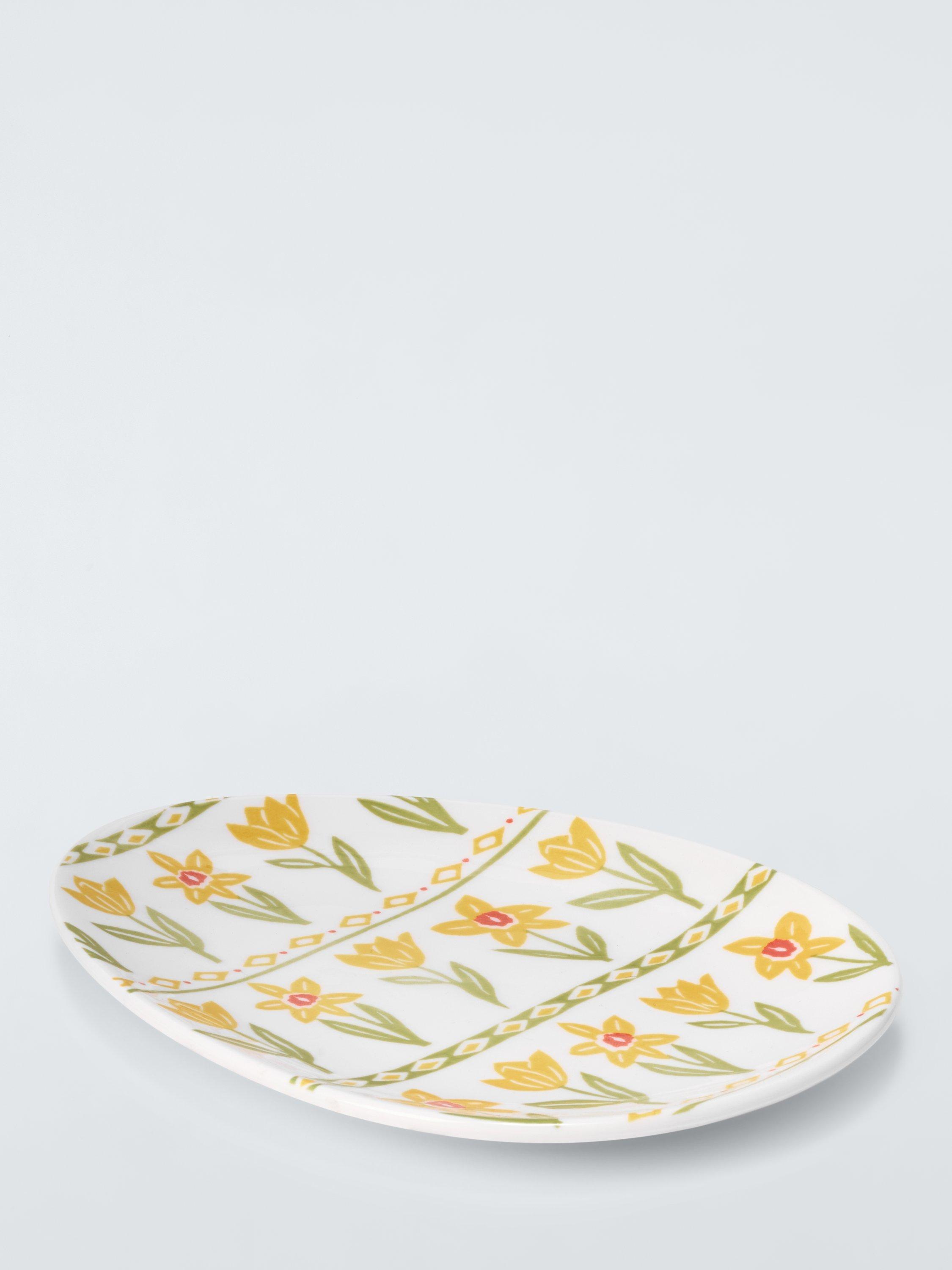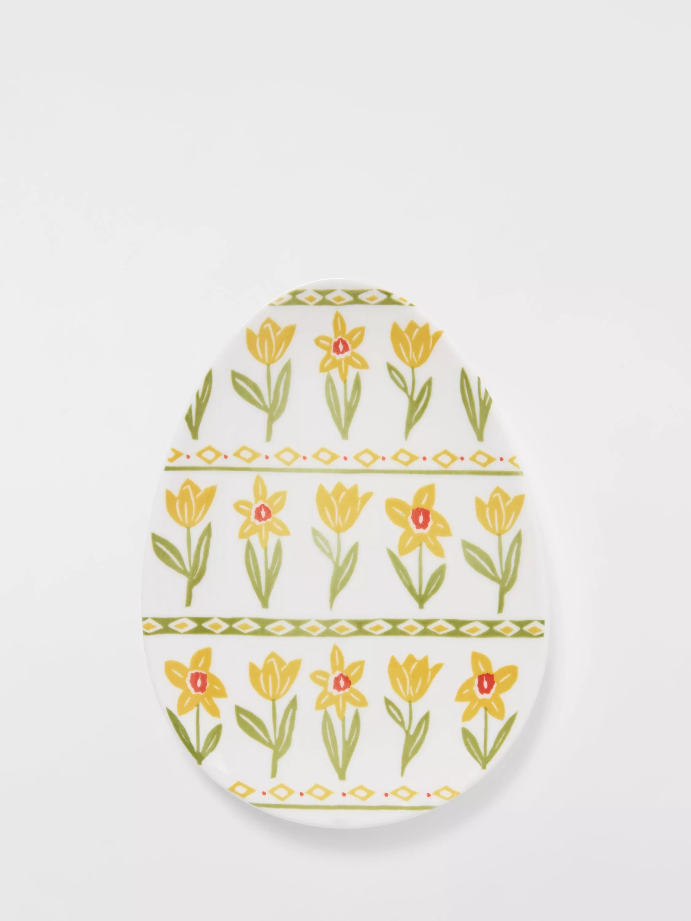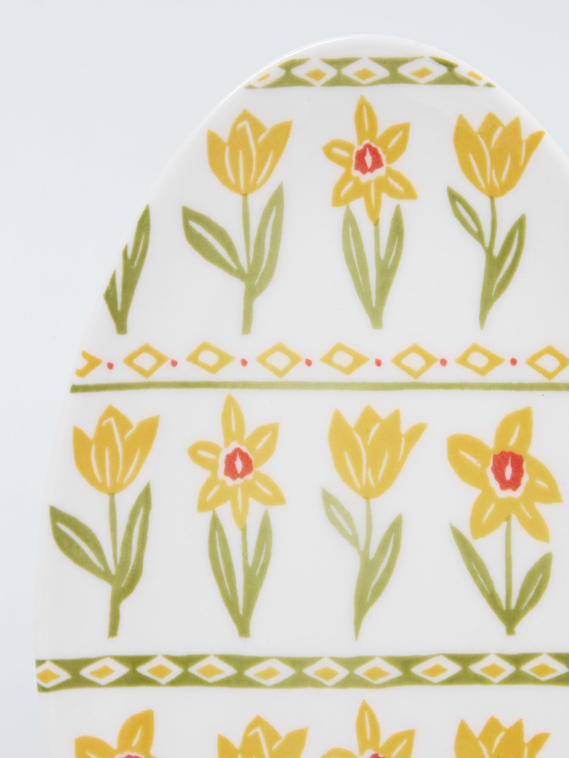 Easter egg-shaped plate with a colourful daffodil design. Made of fine china, it's dishwasher and microwave-safe.