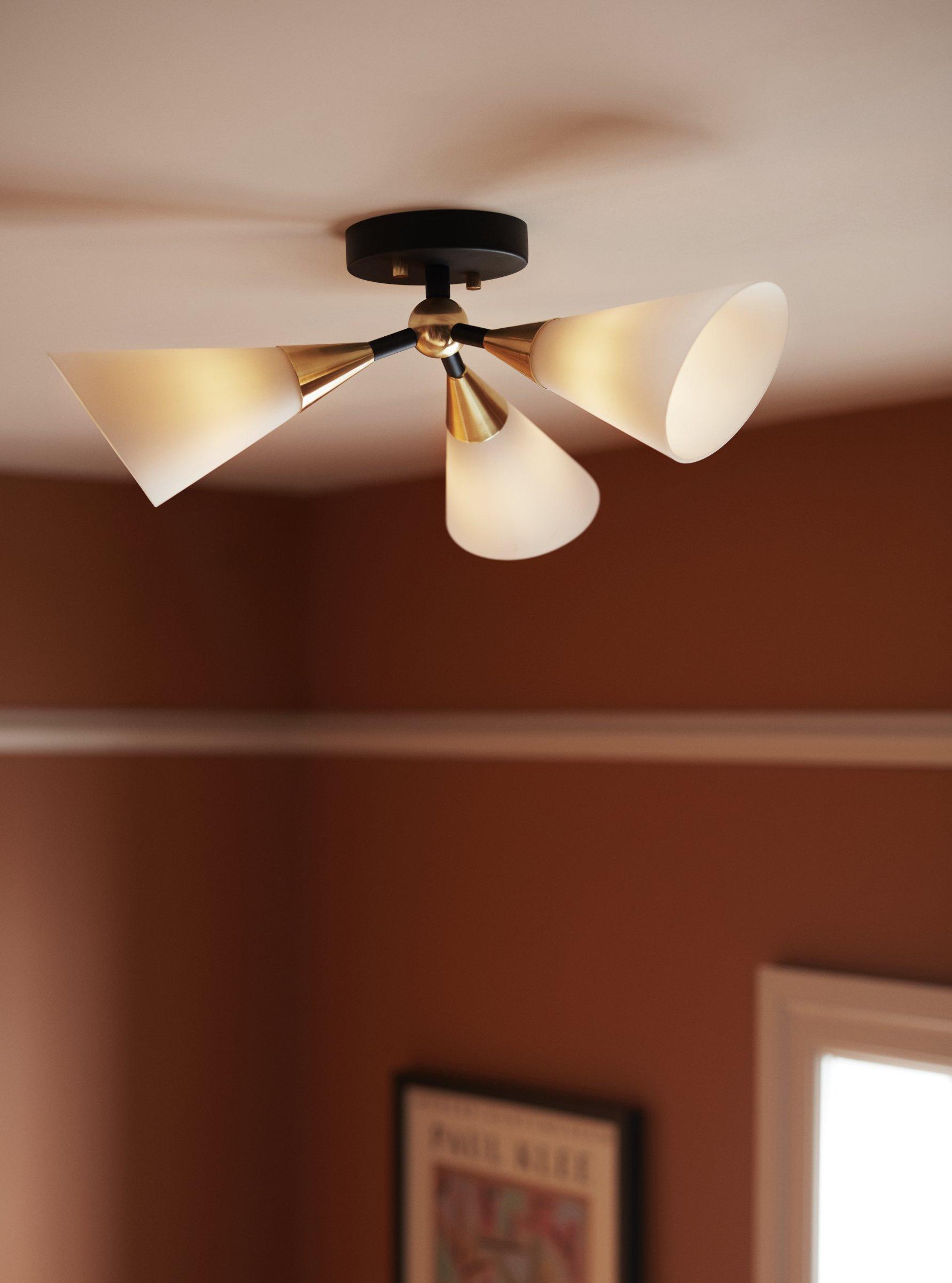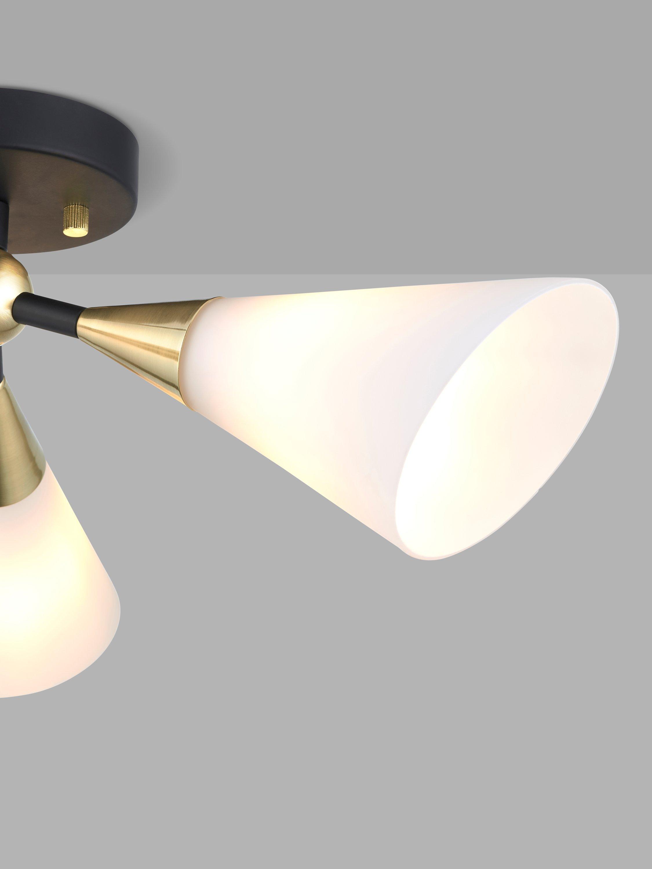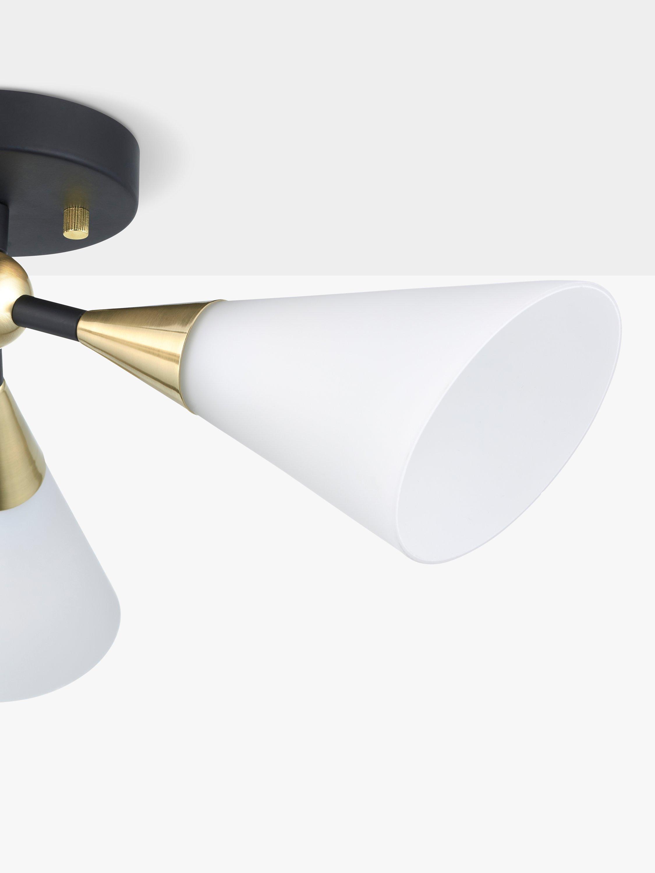A fantastic nod to mid-century with this striking ceiling light. The bold black frame with brass plated details and the matt, opal white cone-shaped glass offer a modern look which will really create a statement in any living space. Compact in size but impact in styling.