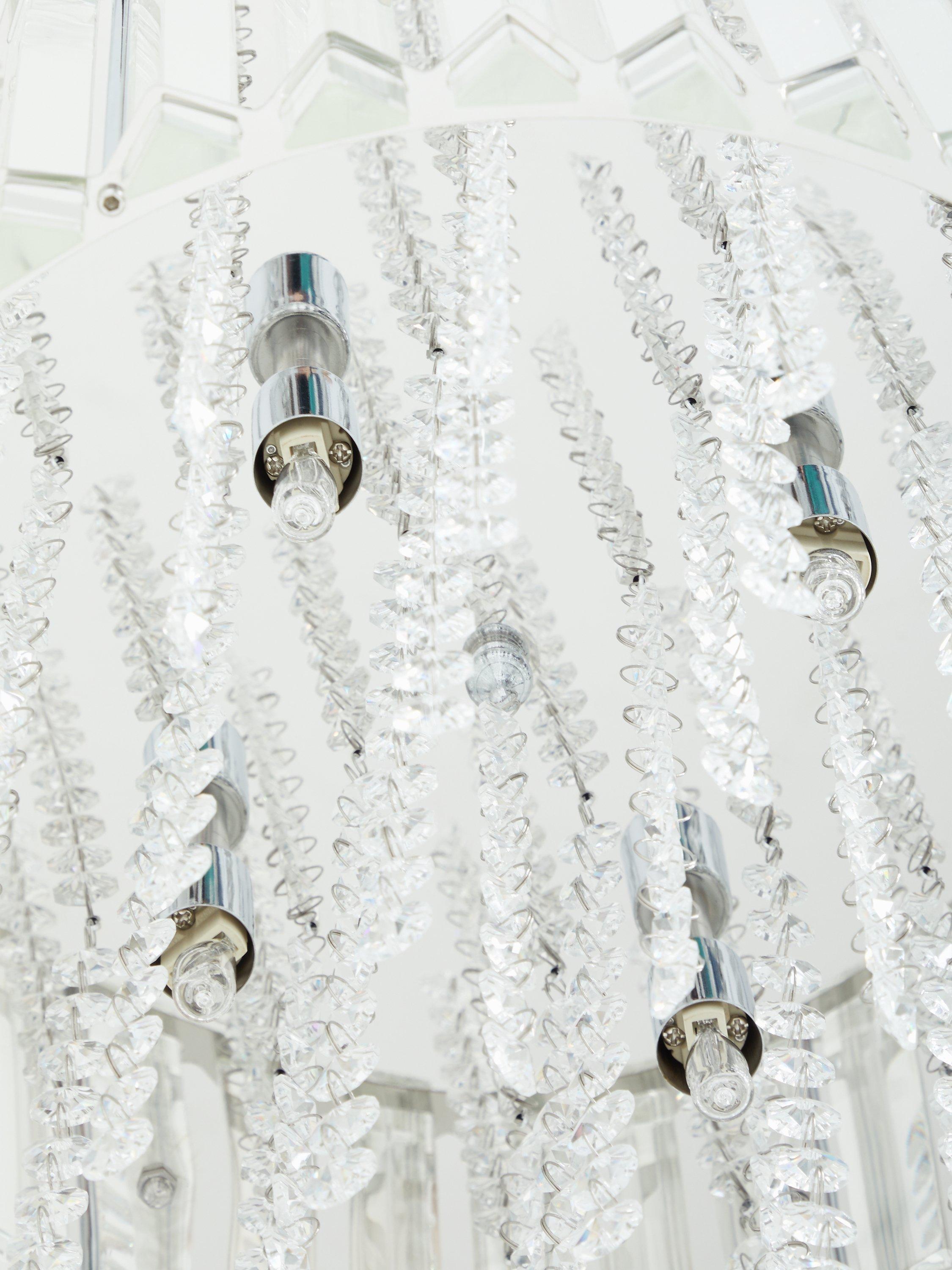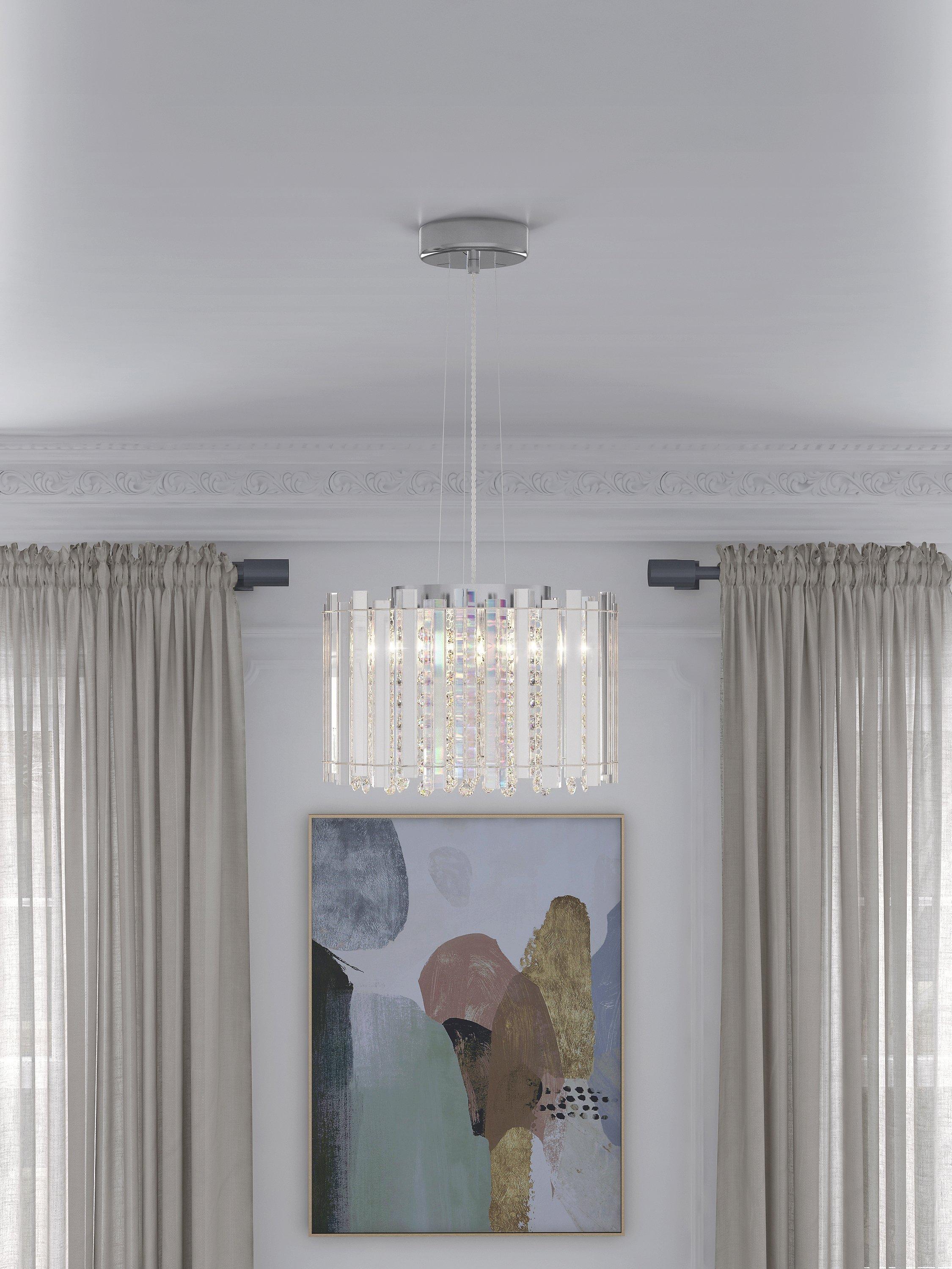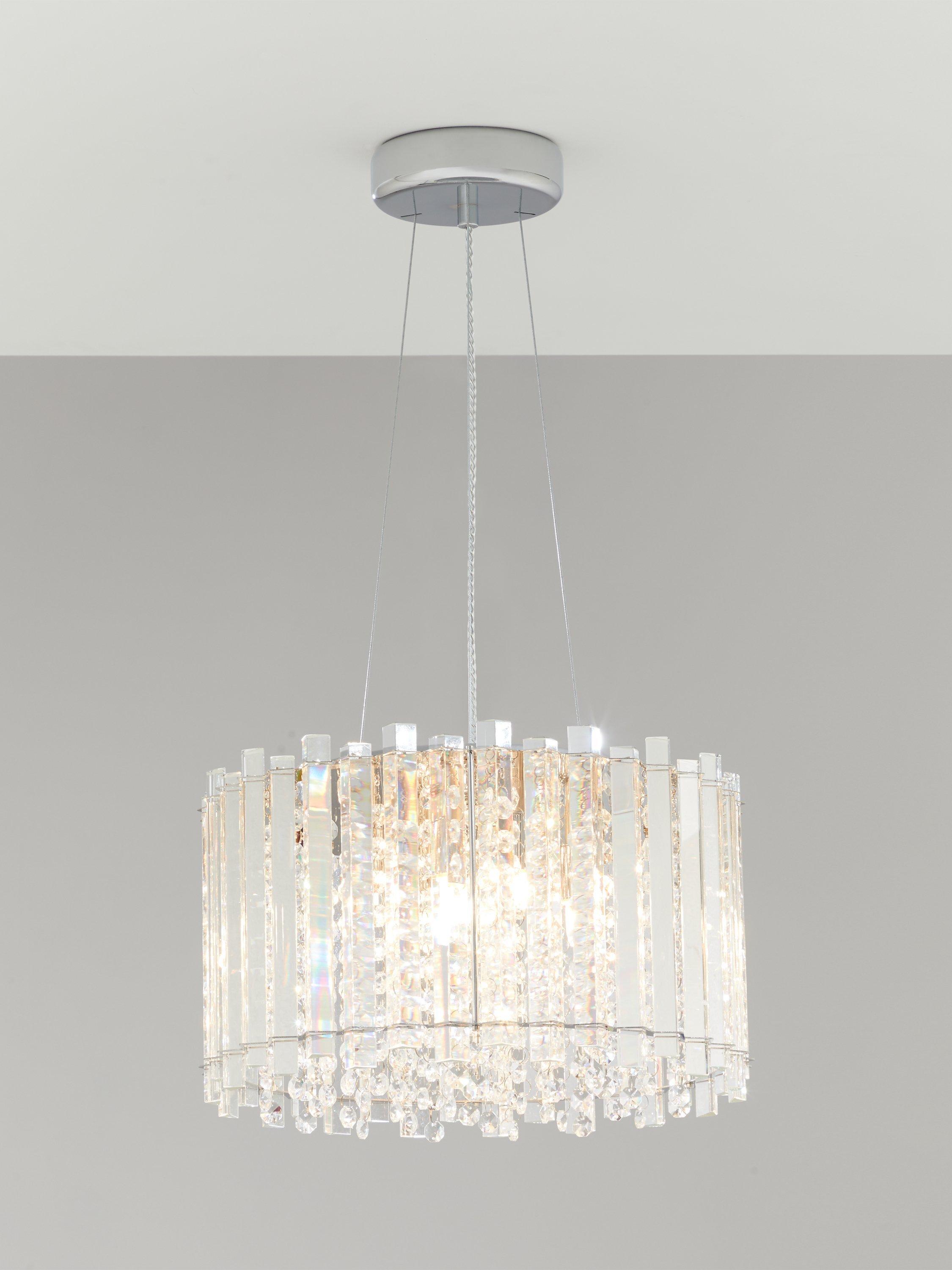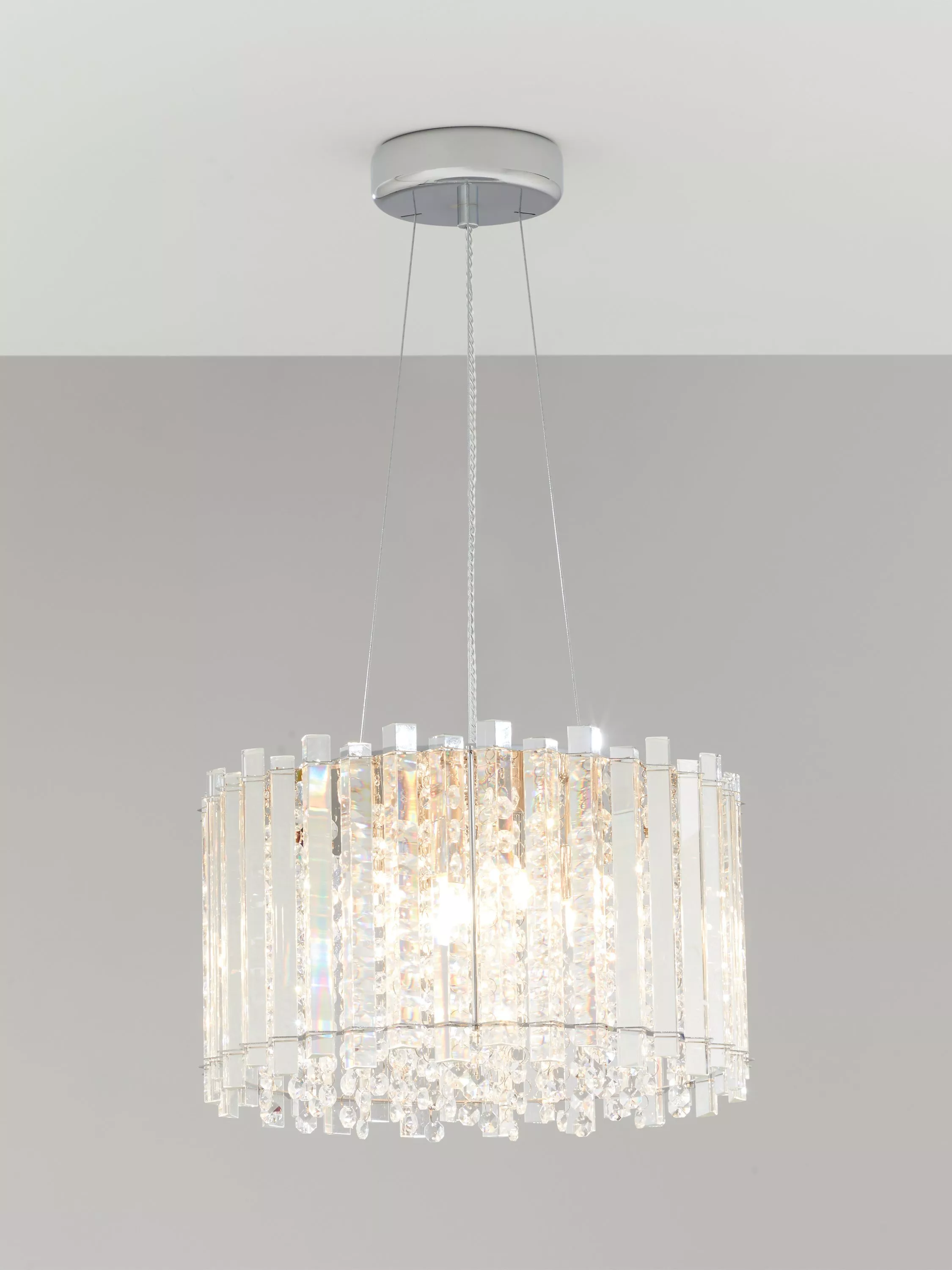Lending a dazzling accent to any room, this faceted ceiling light is designed with a combination of vertically-placed mirrored strips and crystals. Light shines from the centre,and bounces off the crystals to emit a shimmering wash of light. Thanks to the adjustable flex, it's easy to fit it perfectly within your space and its eye-catching design will complement sophisticated interior styles.