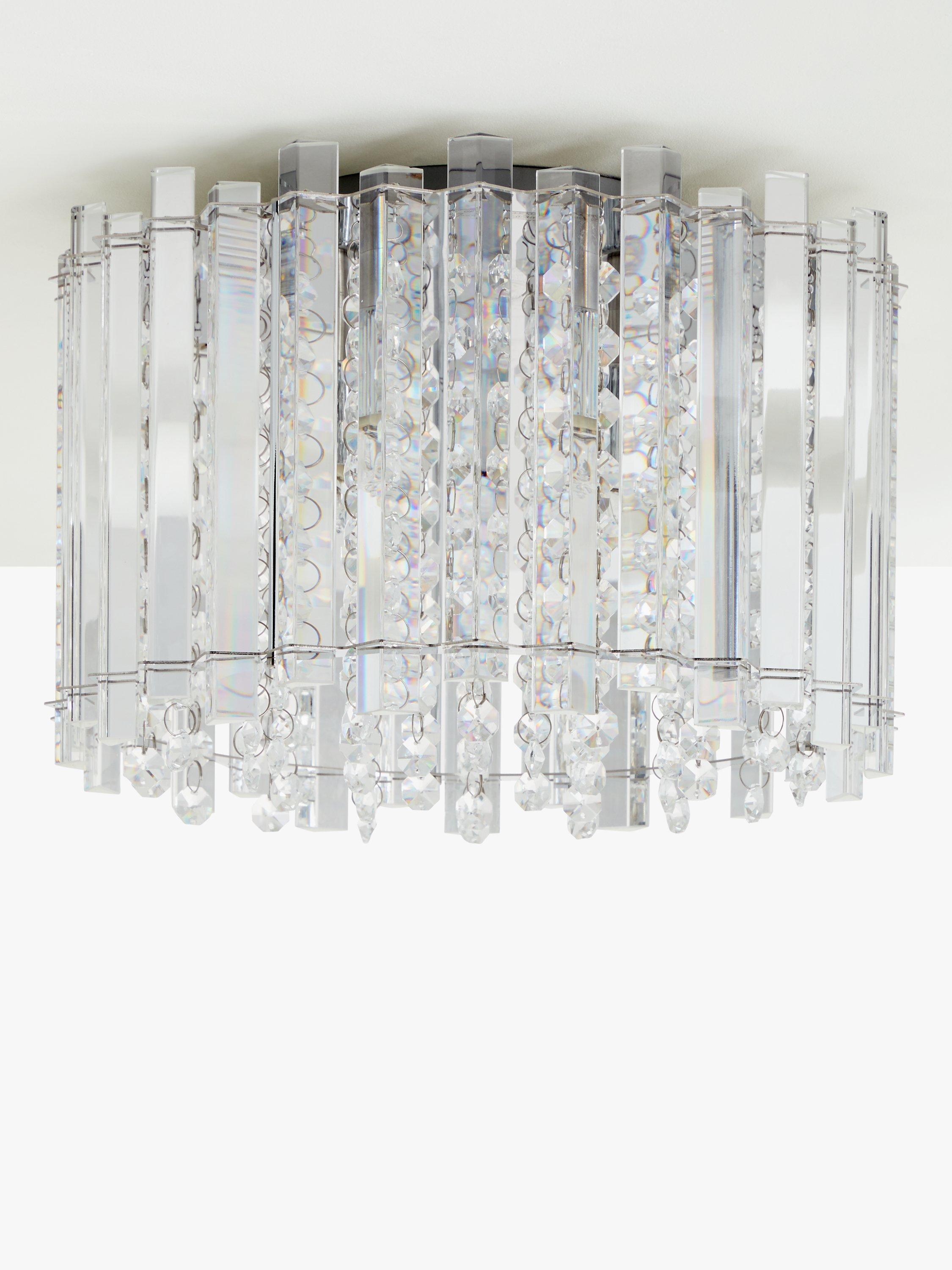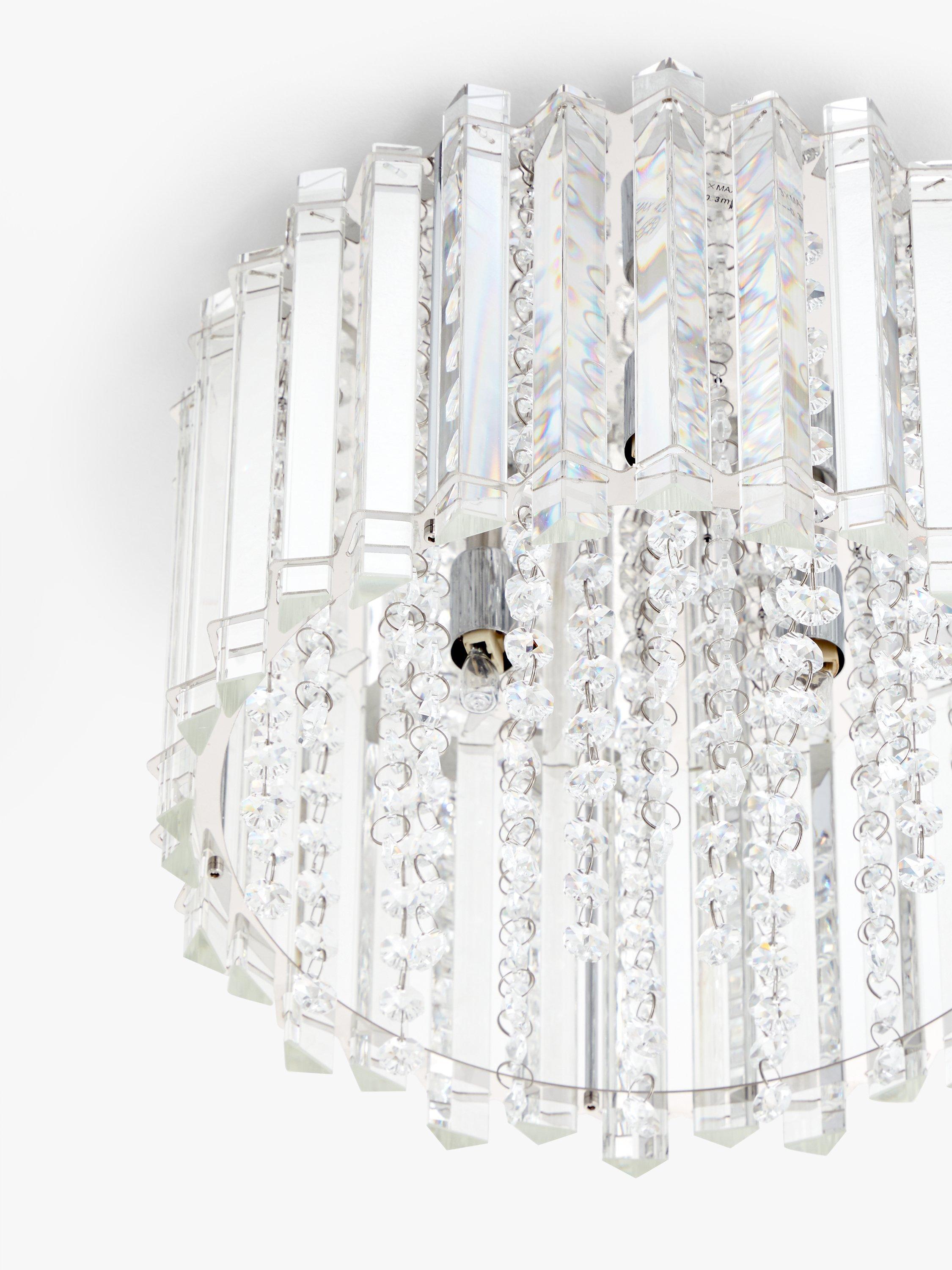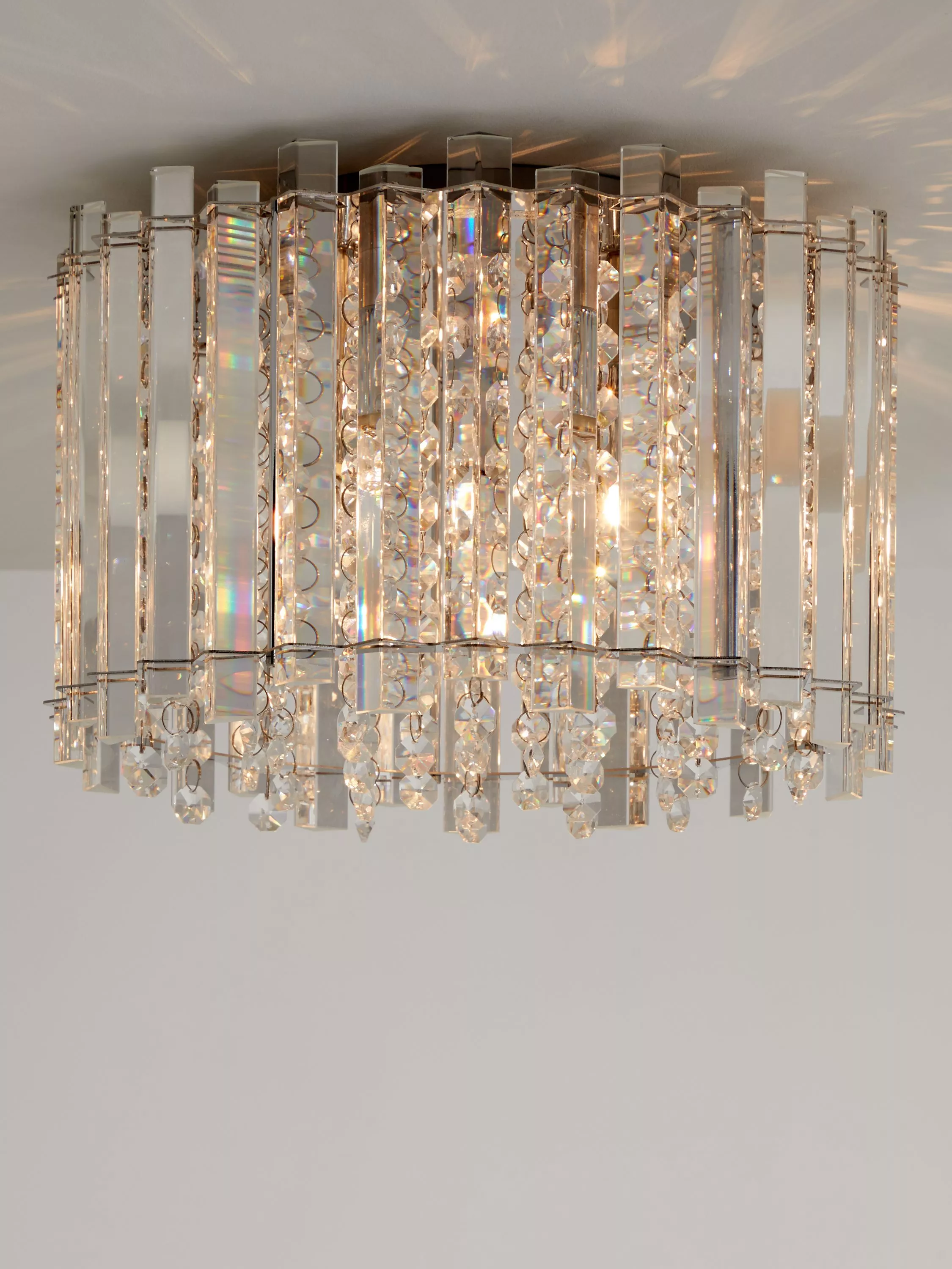 Lending a dazzling accent to any room, this faceted, semi-flush ceiling light is designed with a combination of vertically-placed mirrored strips and crystals. Light shines from the centre and bounces off the crystals to emit a shimmering wash of light. Its eye-catching design sits close to the ceiling and will complement sophisticated interior styles.