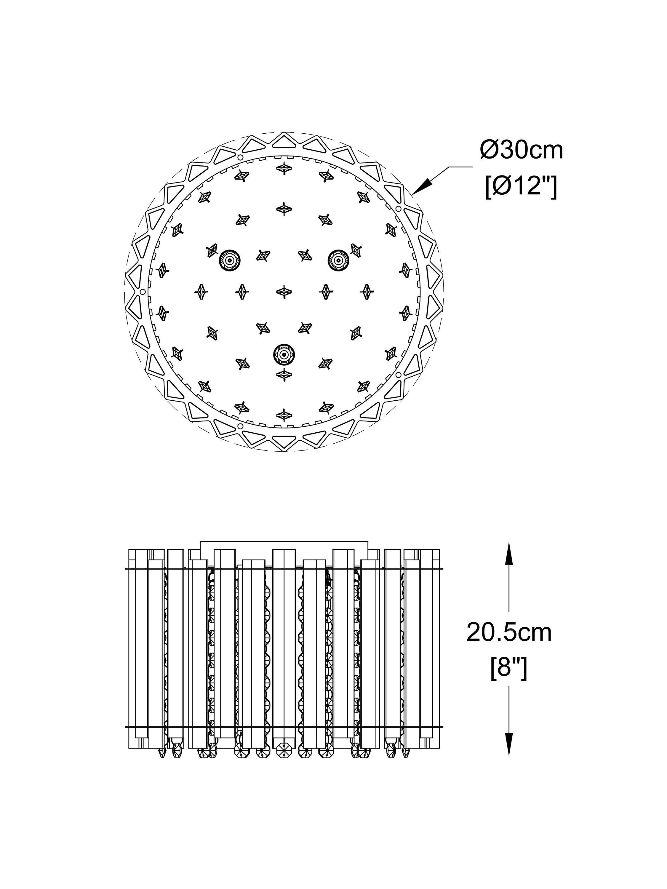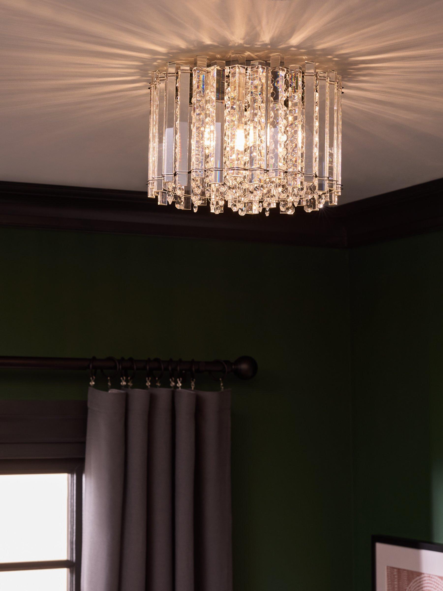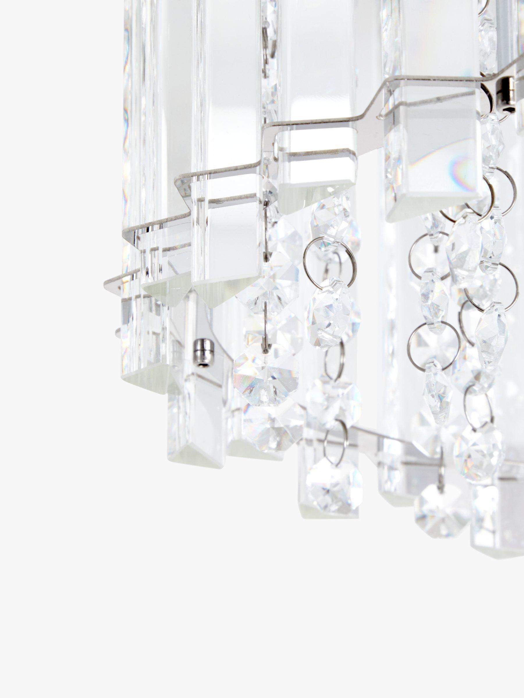 Lending a dazzling accent to any room, this faceted, semi-flush ceiling light is designed with a combination of vertically-placed mirrored strips and crystals. Light shines from the centre and bounces off the crystals to emit a shimmering wash of light. Its eye-catching design sits close to the ceiling and will complement sophisticated interior styles.