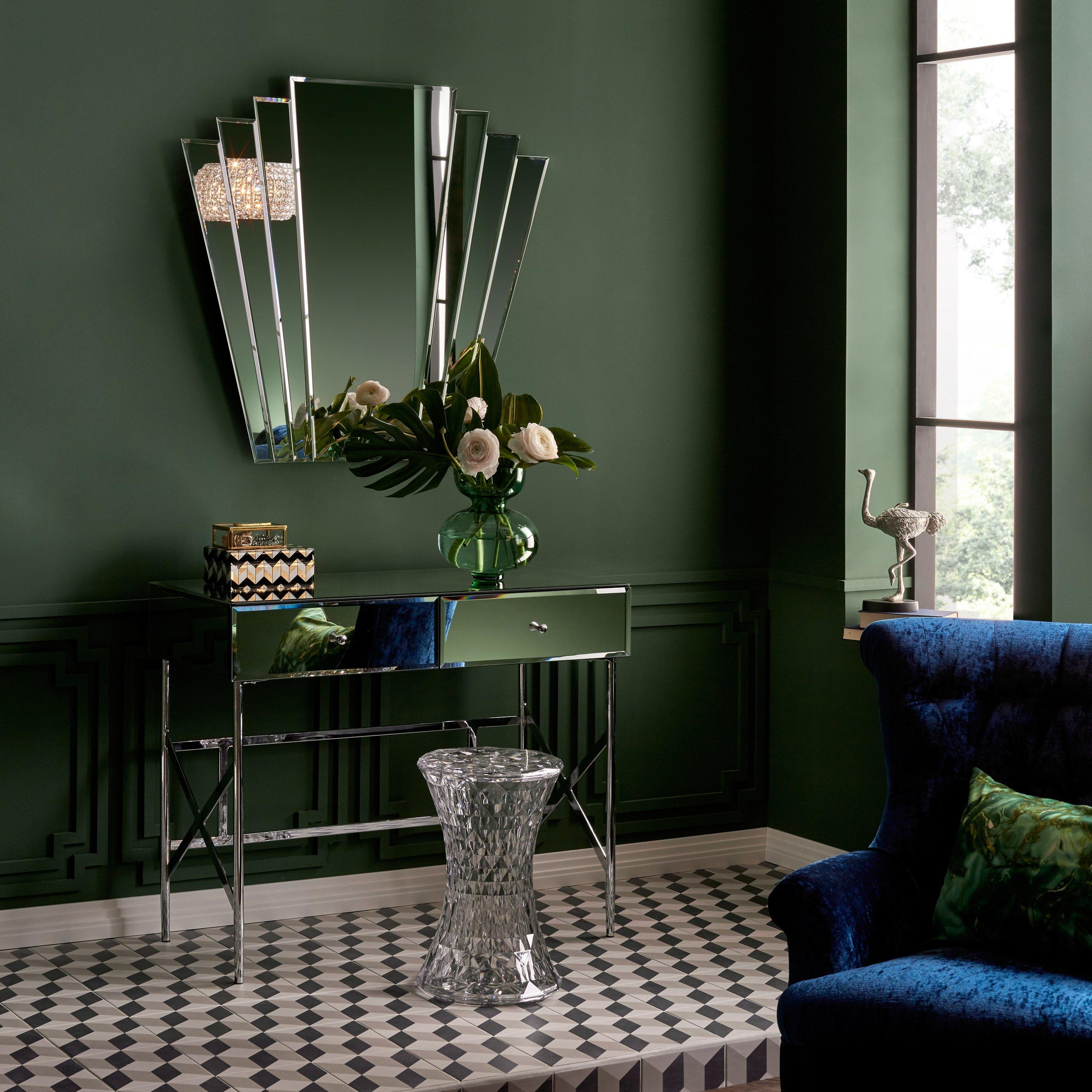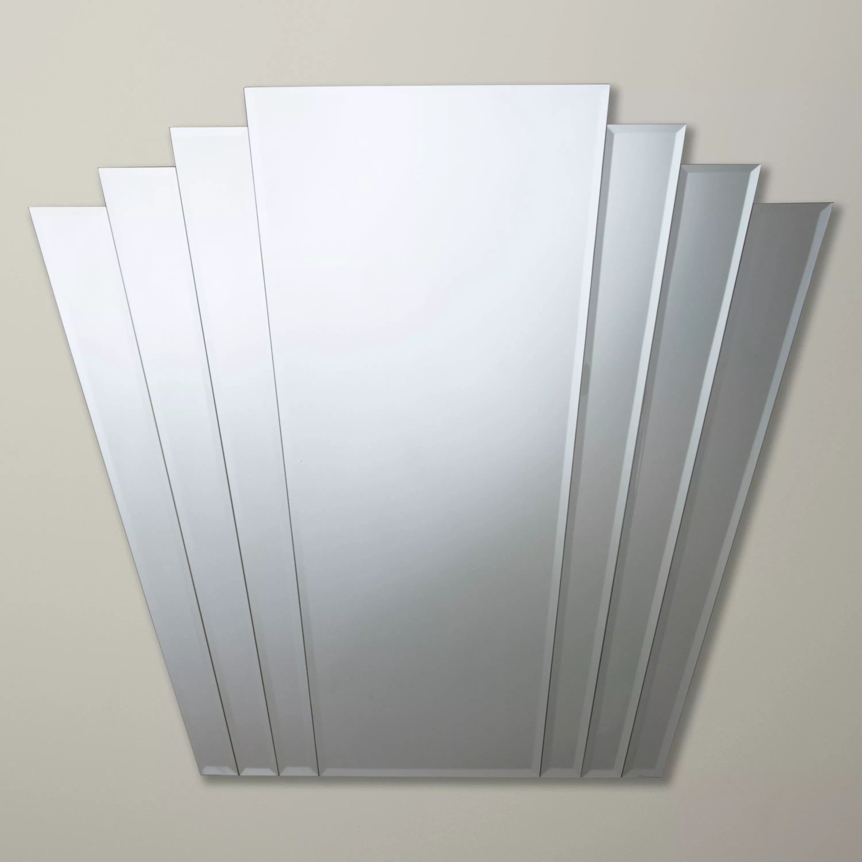 This stunning Deco mirror is ideal for sitting over your mantelpiece. A striking fan-shaped design made of bevelled glass panels, it's ideal for a living room or bedroom.