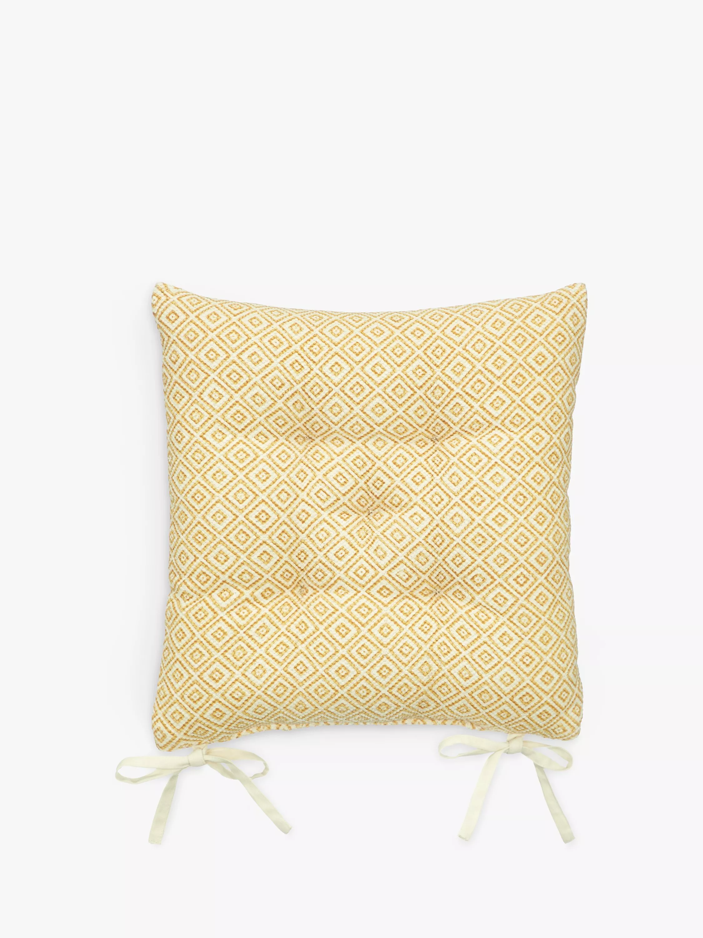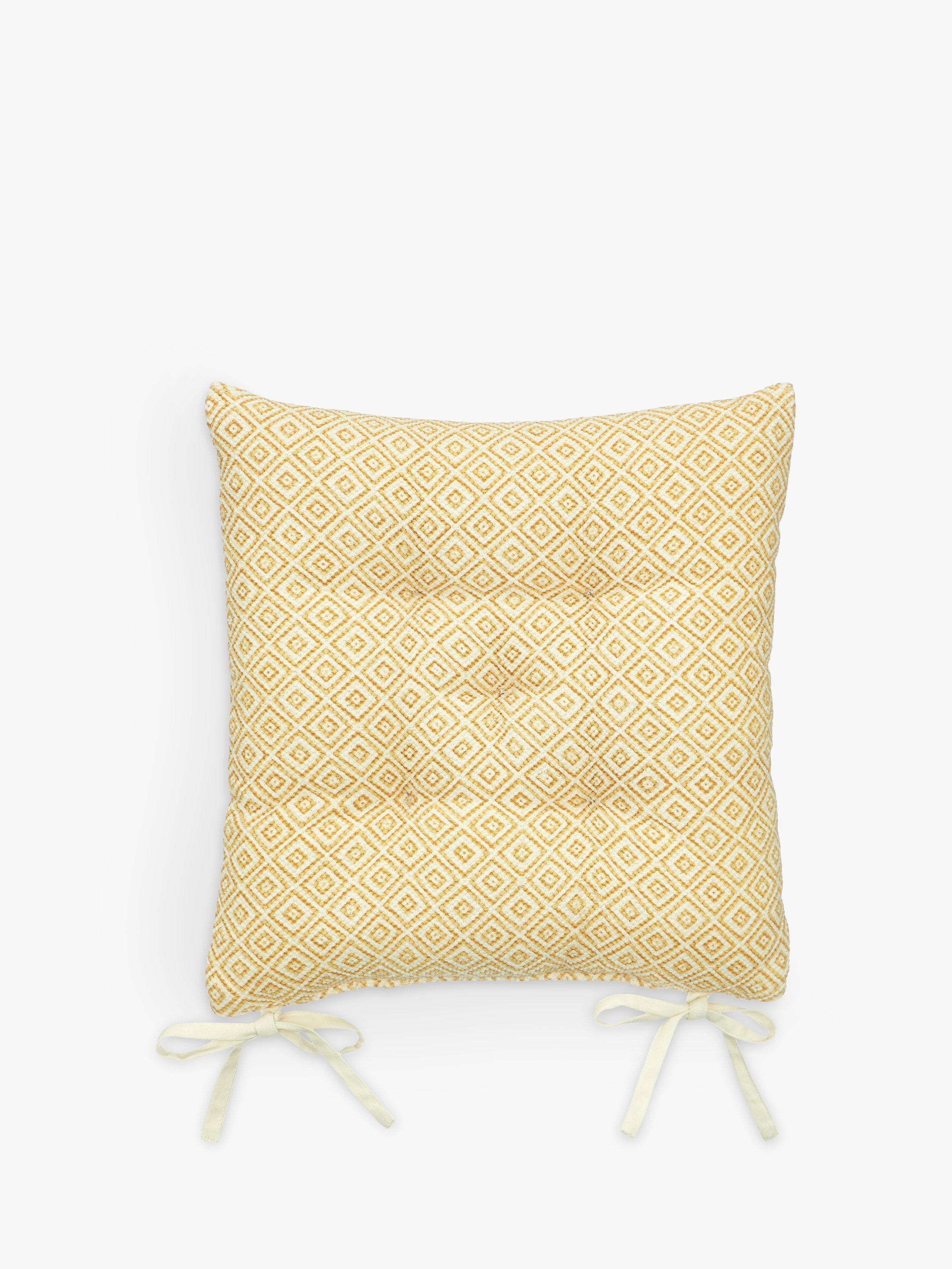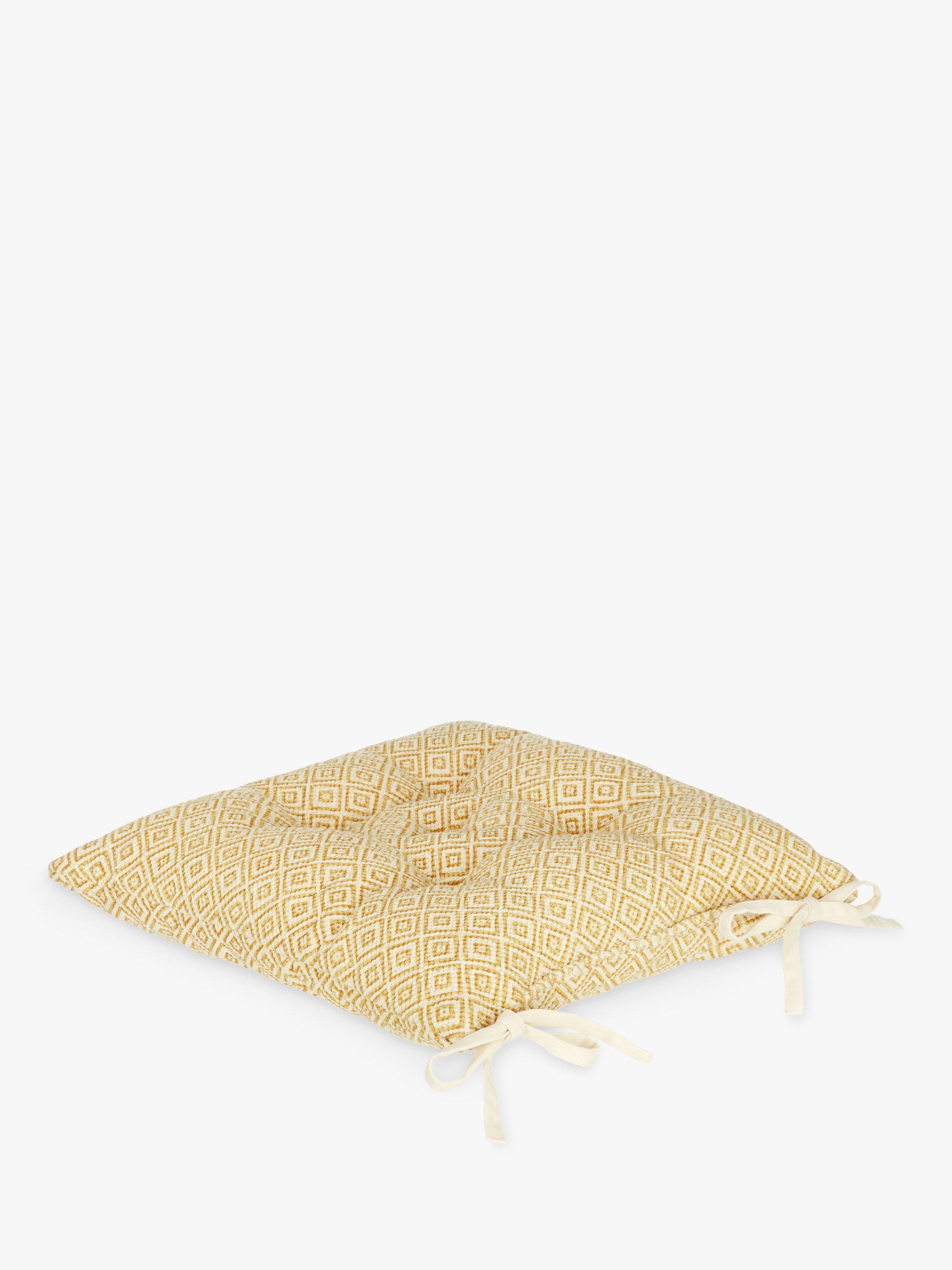 This polyester-filled seat pad will add extra comfort to a wooden dining chair. It fastens with cotton ties.
