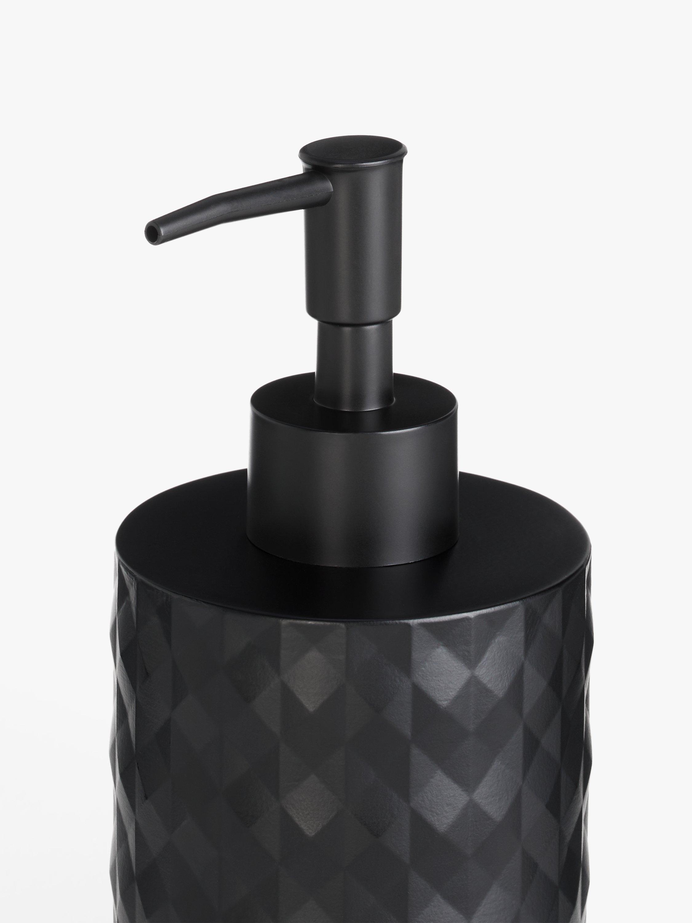 This polyresin soap dispenser has a textured diamond design that subtly reflects the light for a sleek and modern bathroom look.