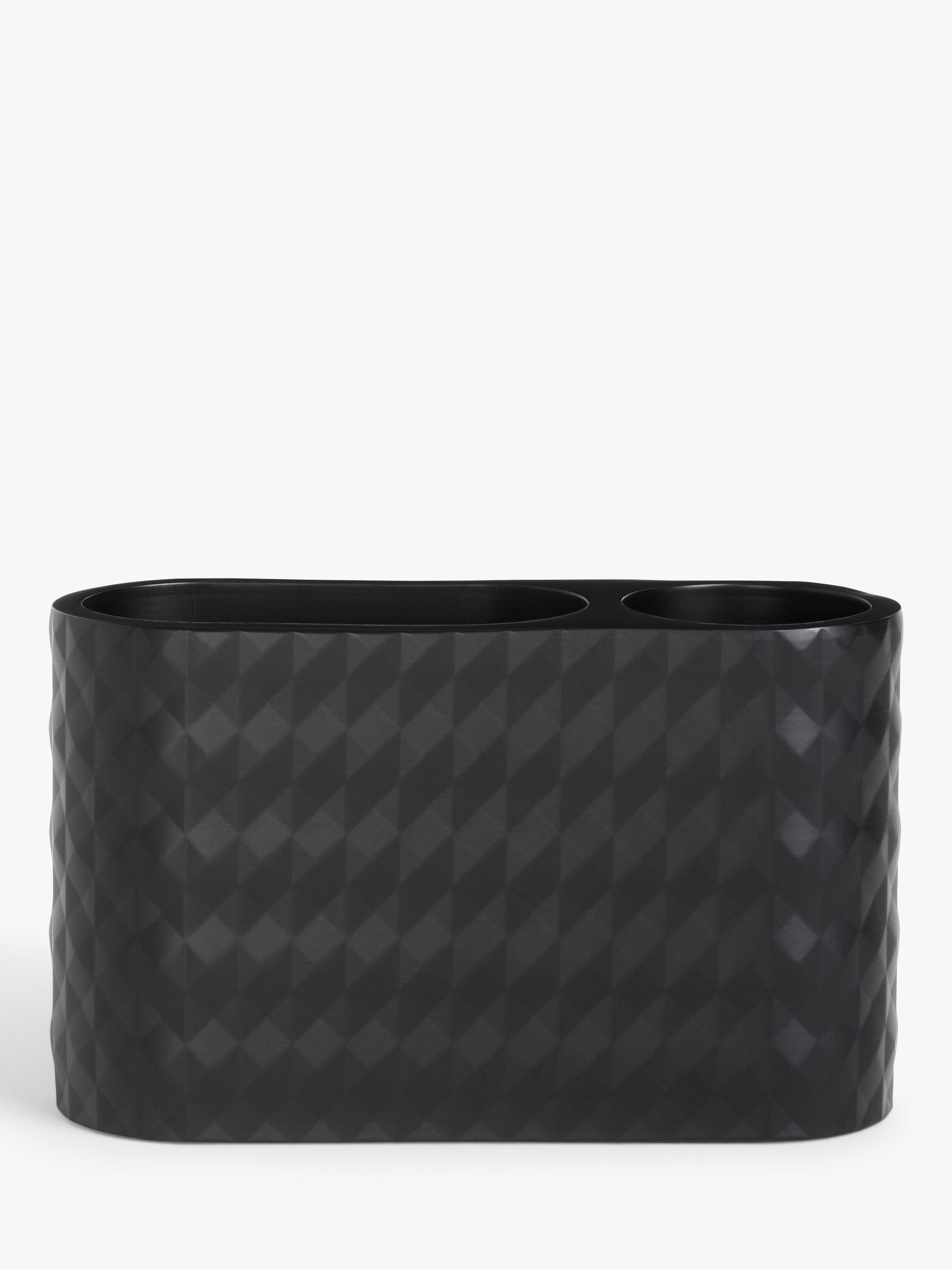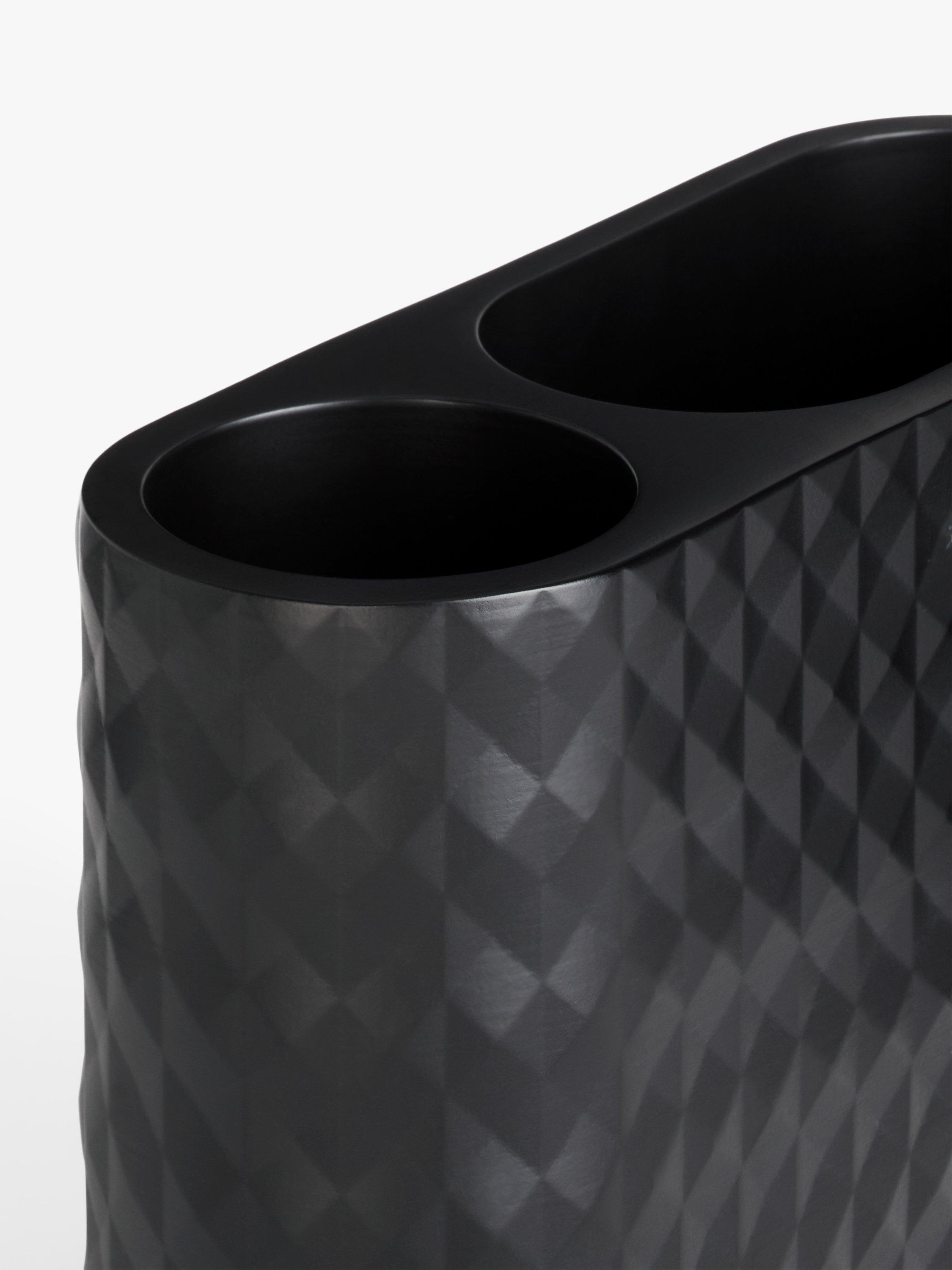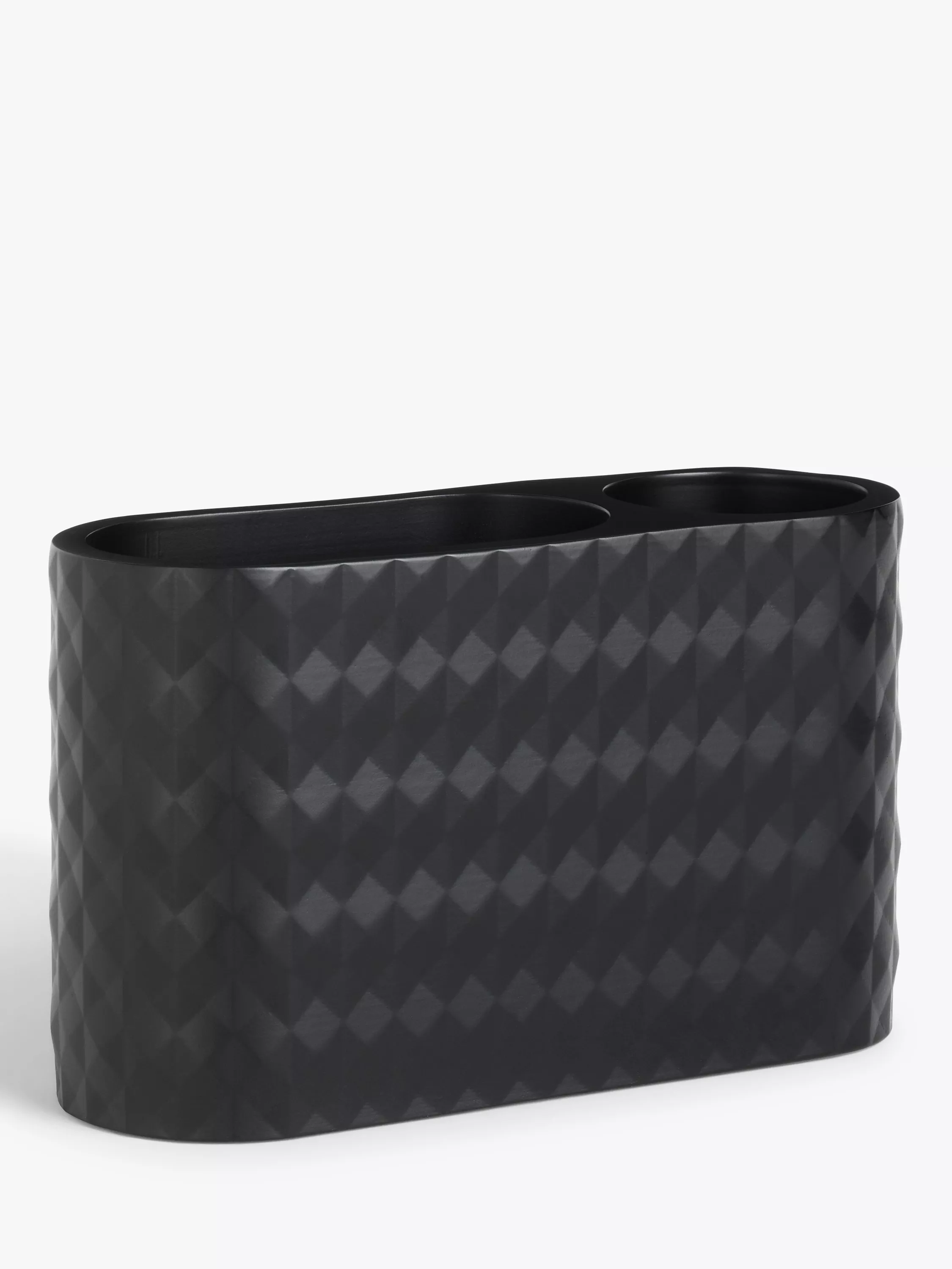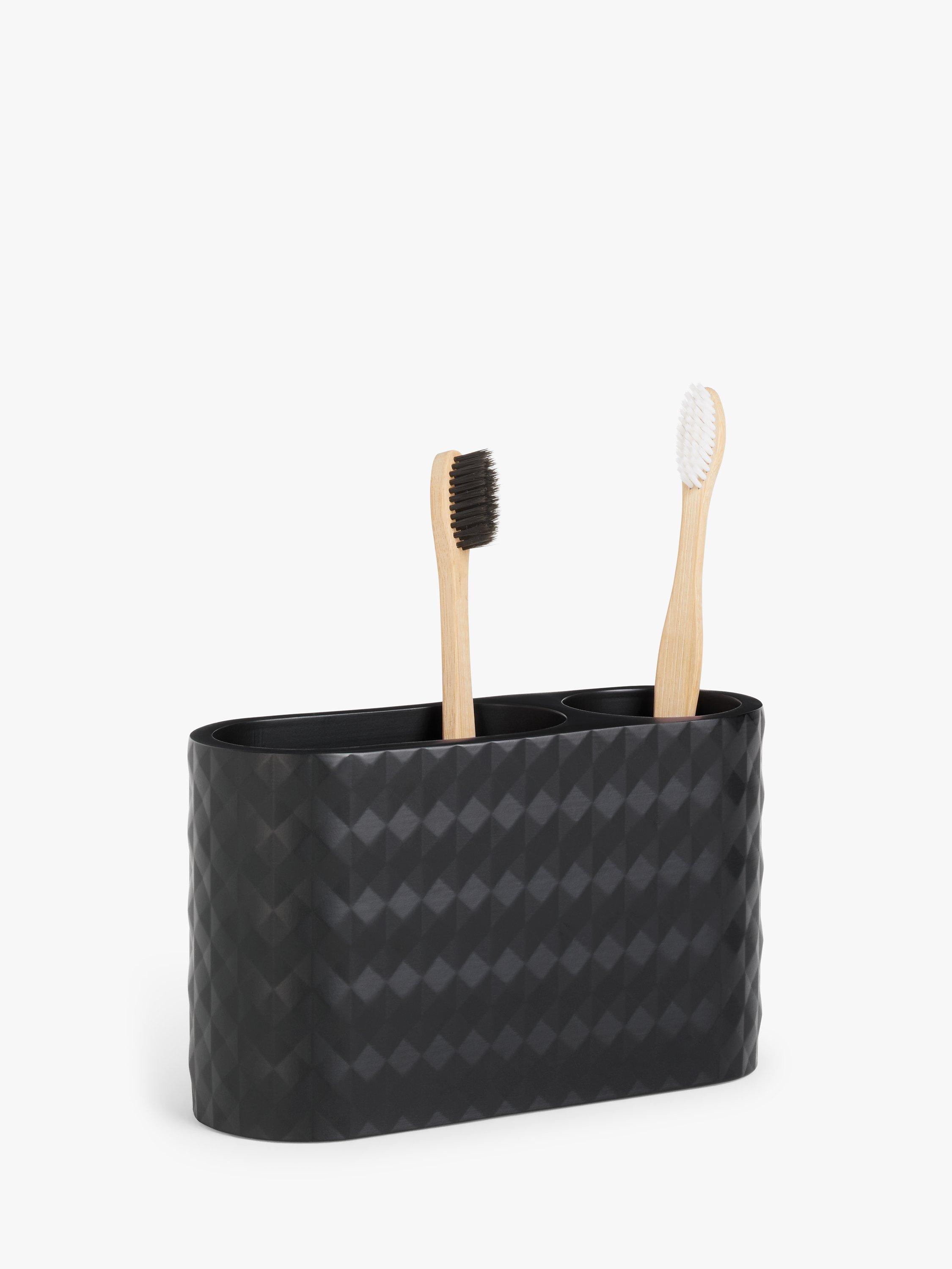 This polyresin toothbrush holder has a textured diamond design that subtly reflects the light for a sleek and modern bathroom look.