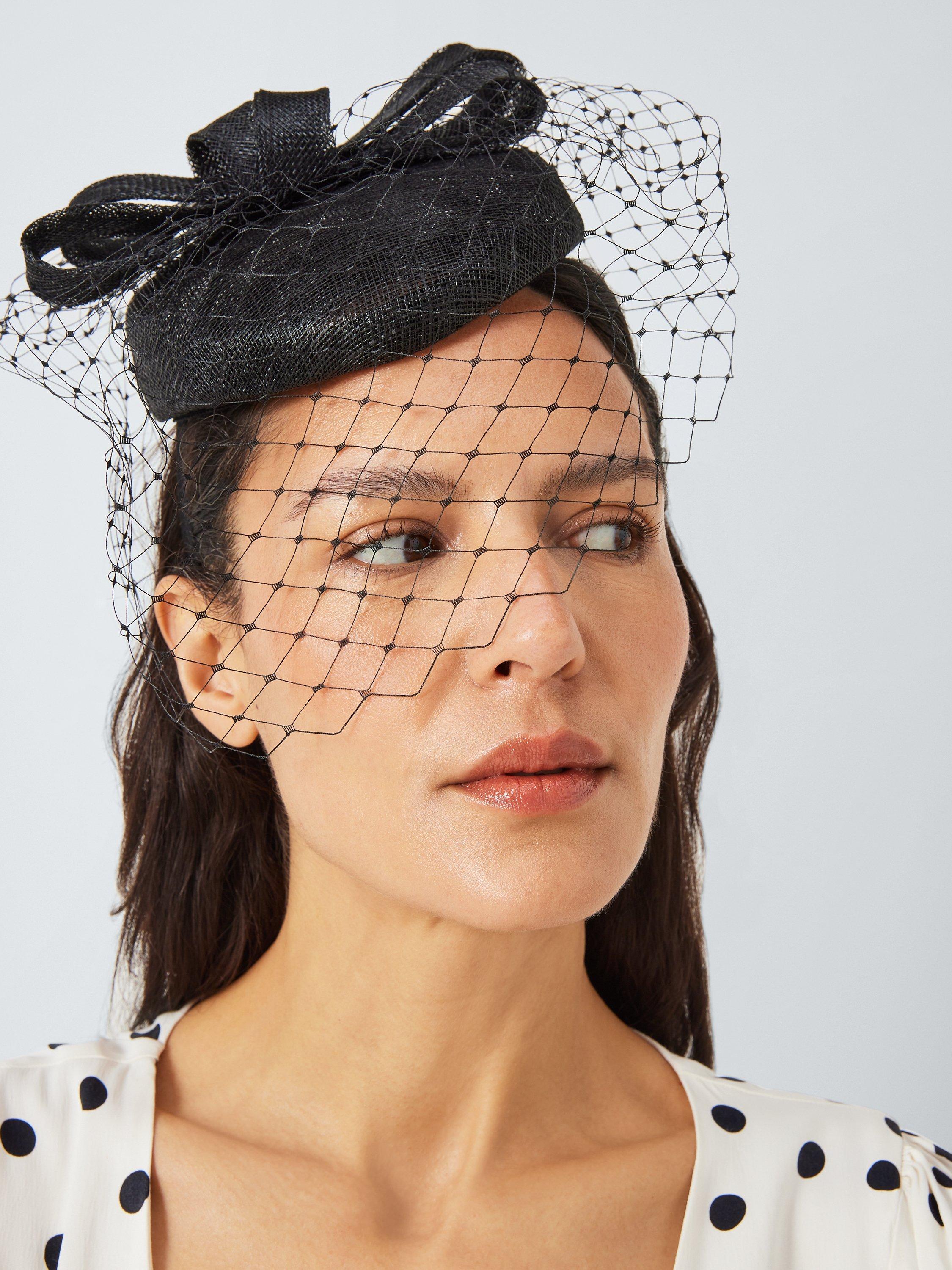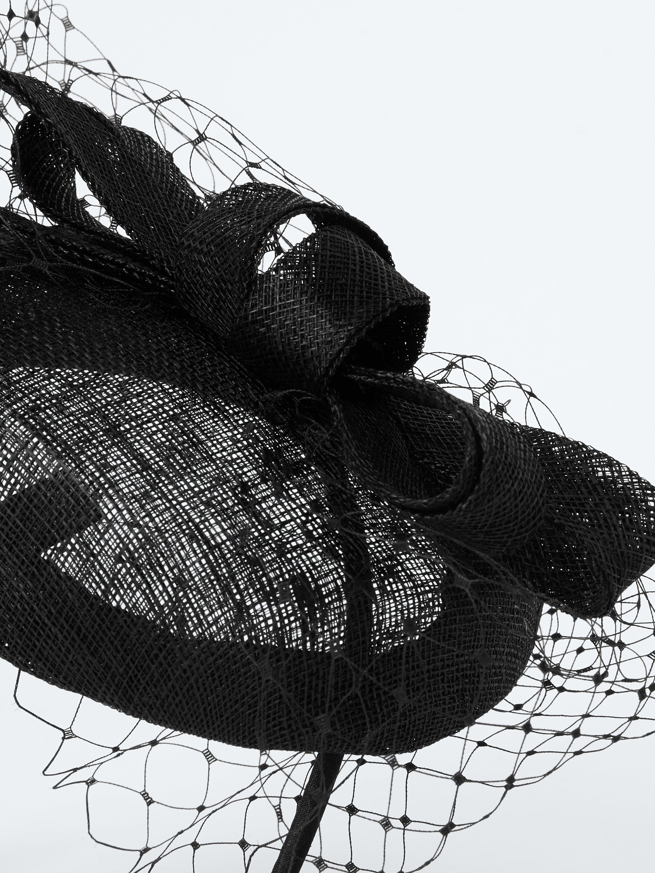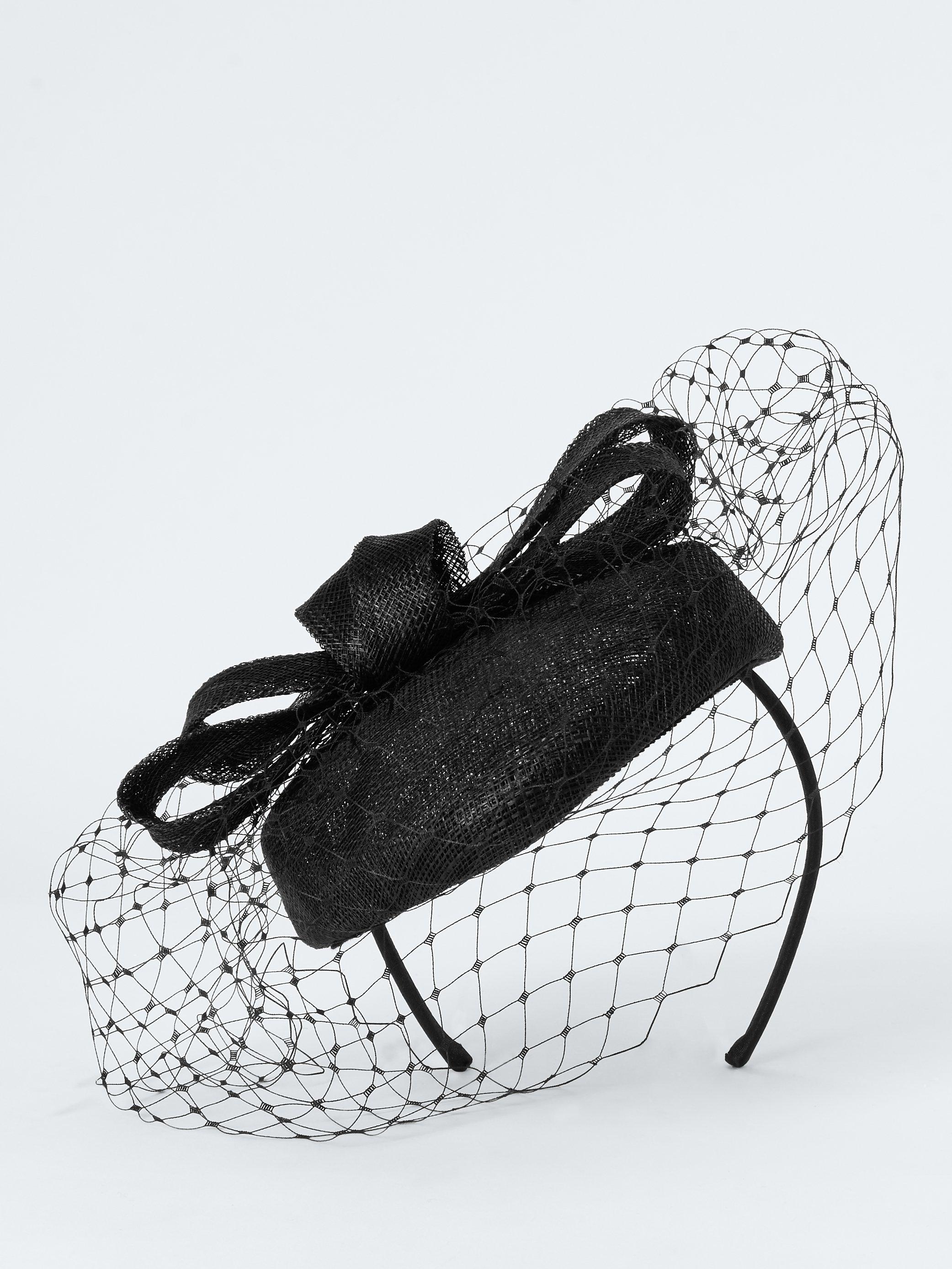 In a flattering mini pill box styling with bow texture and sophisticated veil front, this fascinator is a great choice for your next formal event.