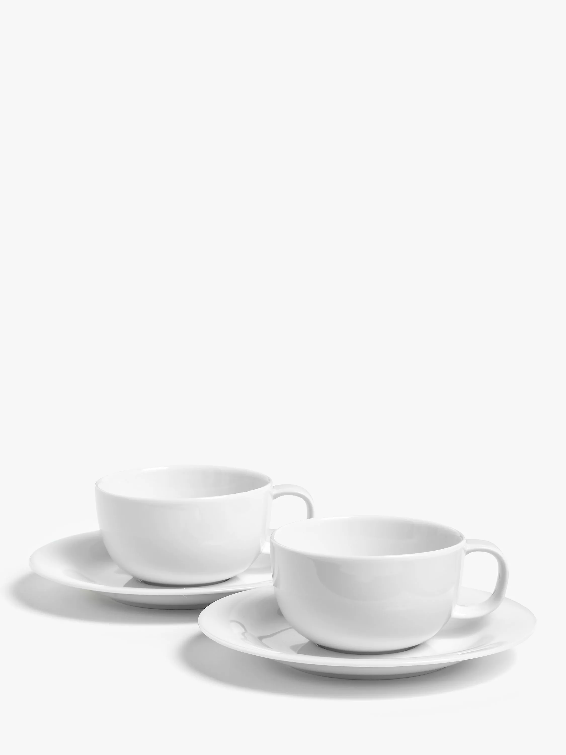 Pair of teacups and saucers from our Dine collection. Made of porcelain, each piece is dishwasher, microwave and freezer safe.