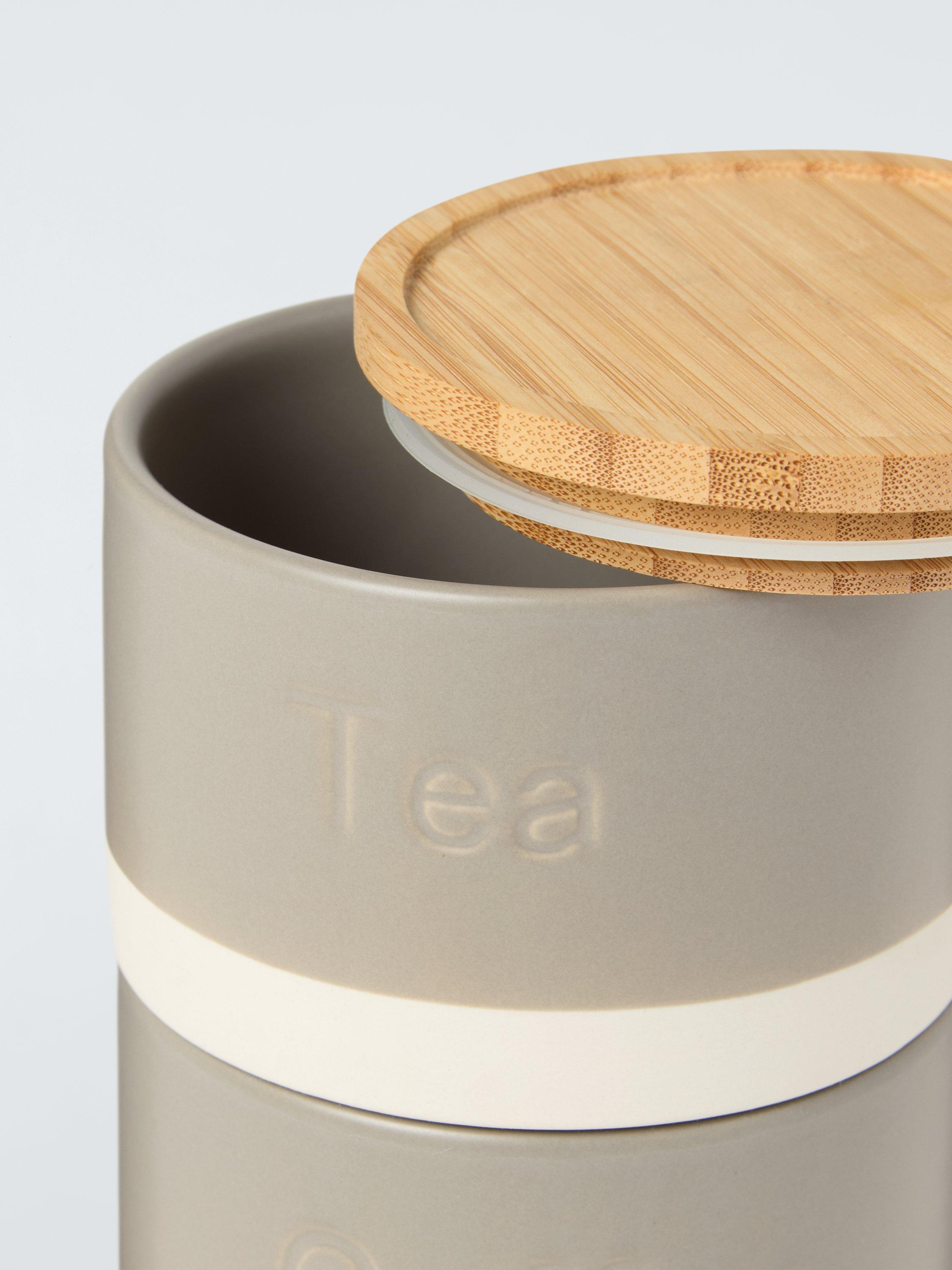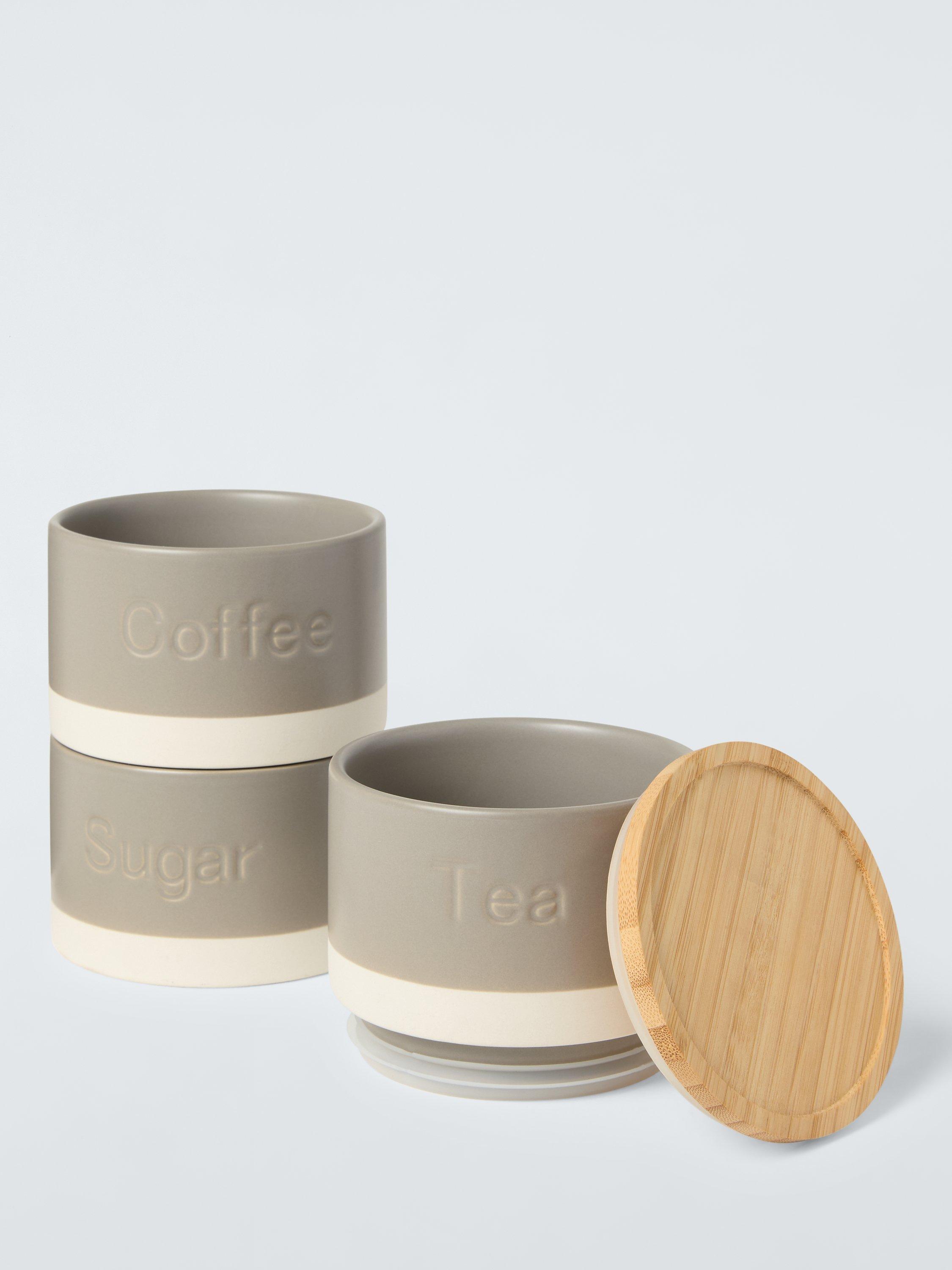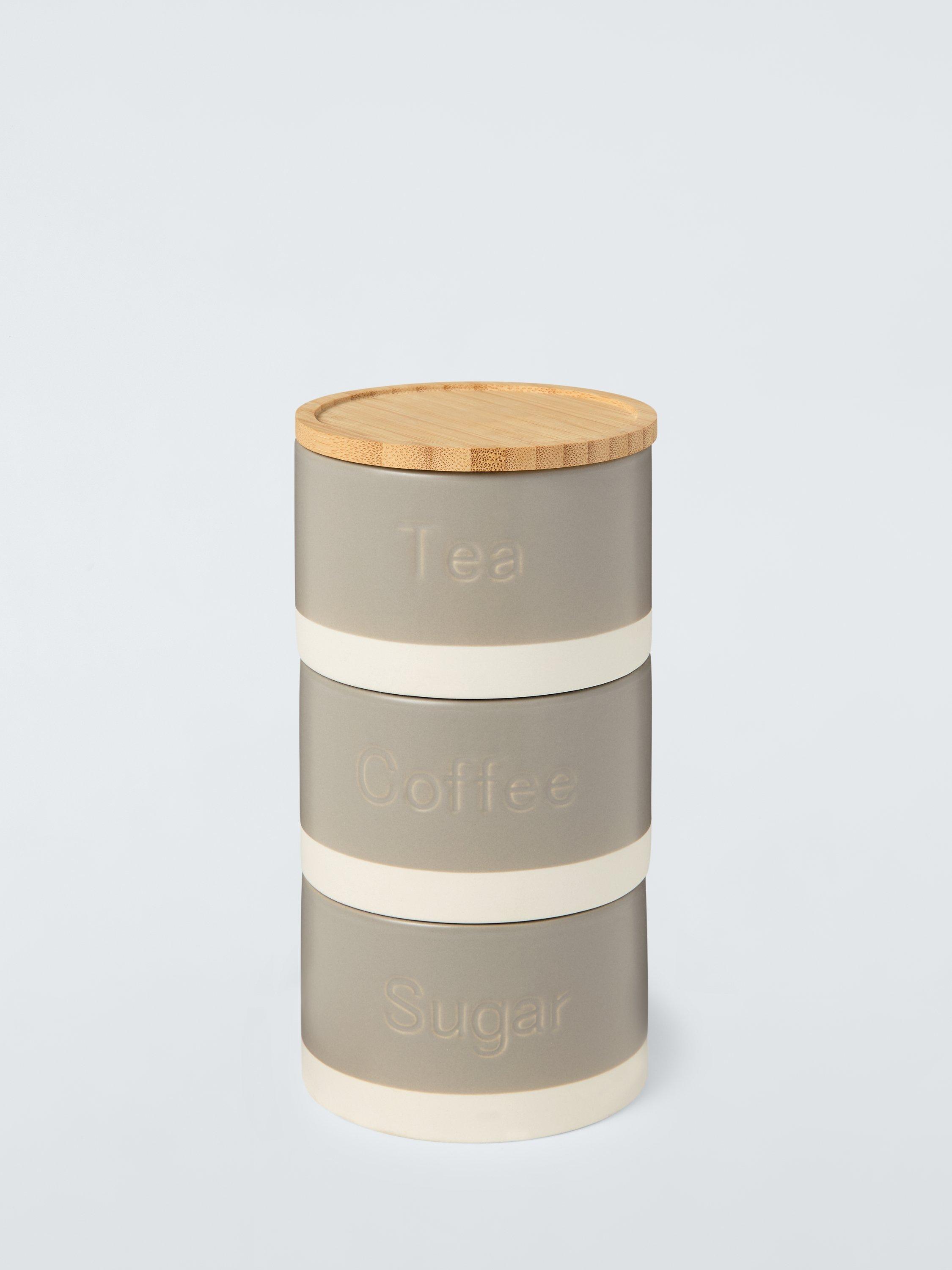 A kitchen space saver. Three stackable storage jars for tea, coffee and sugar, subtly debossed on the front. Finished in a dipped glaze, the stoneware jars have airtight silicone seals and a bamboo lid on top.