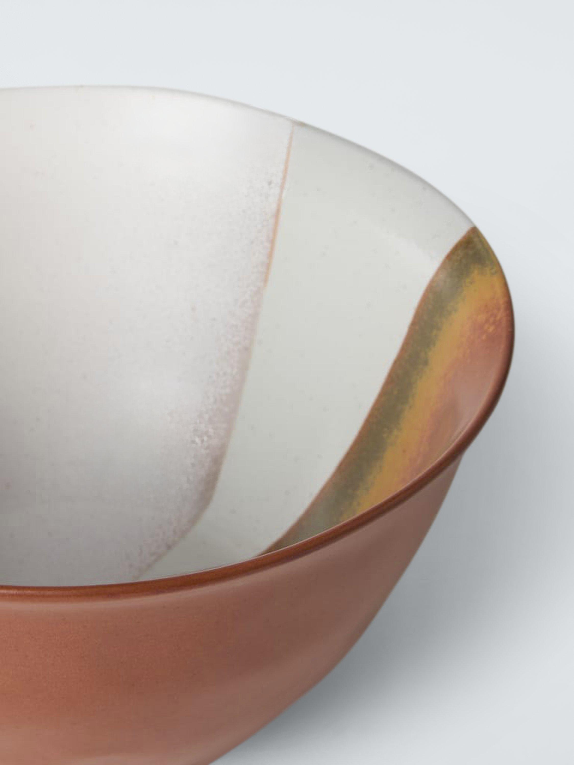 Serving bowl hand-dipped with reactive glazes creating a striking abstract look. This handcrafted process causes subtle variations from item to item, making each piece unique. Made of stoneware, it's dishwasher and microwave-safe for everyday use.