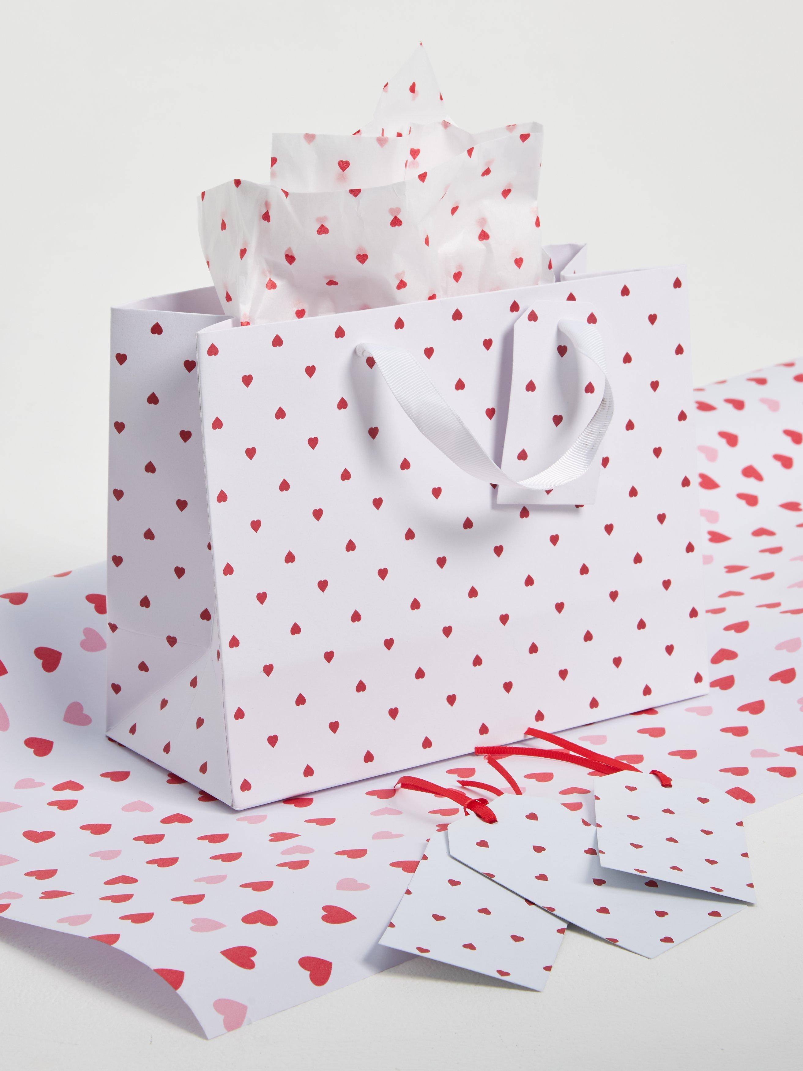 A sweet, ditsy heart printed gift bag with ribbon handles.