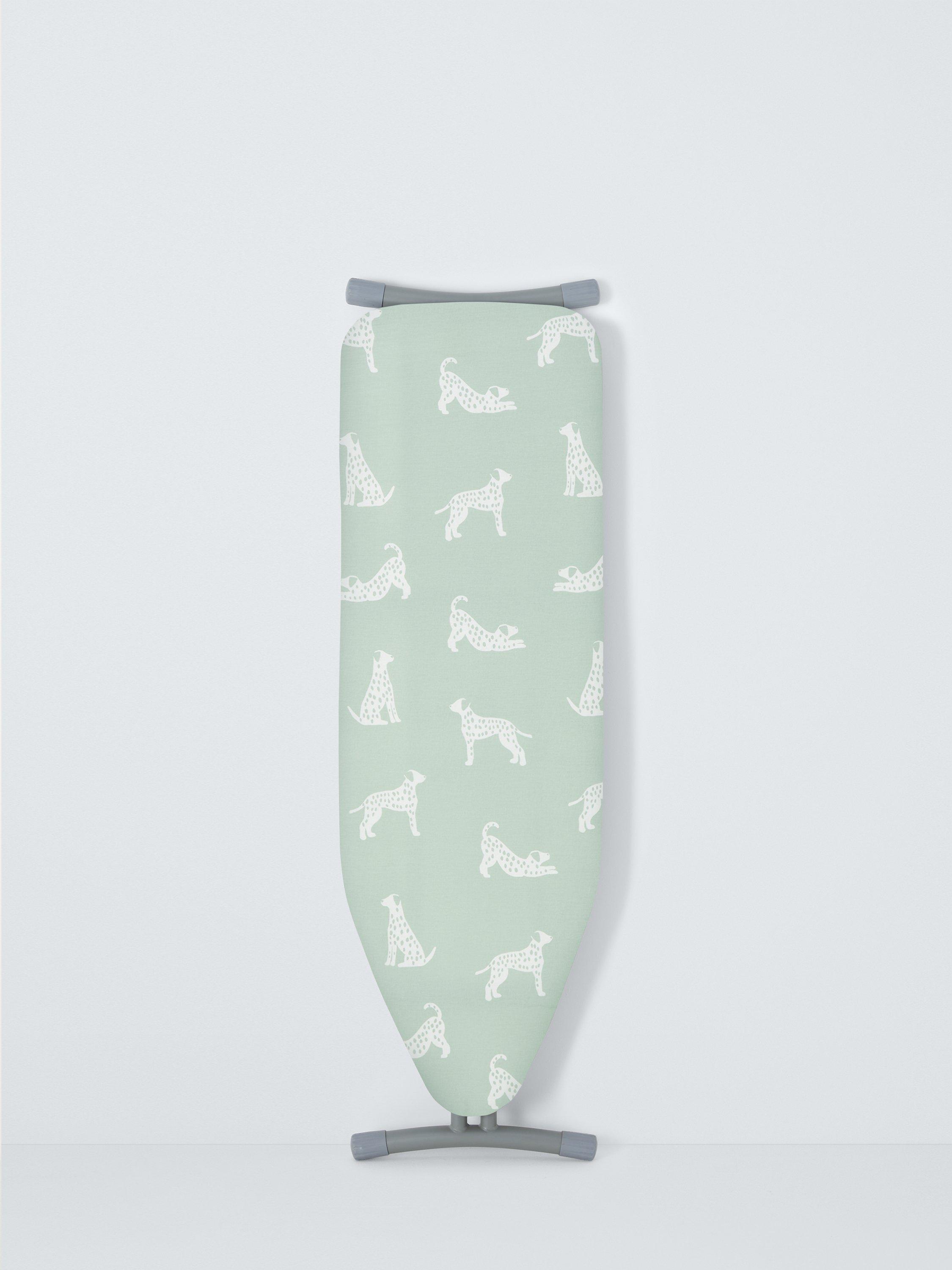 Dog print ironing board cover with 3mm foam underlay, drawstring and rubber band and plastic hook fastening.