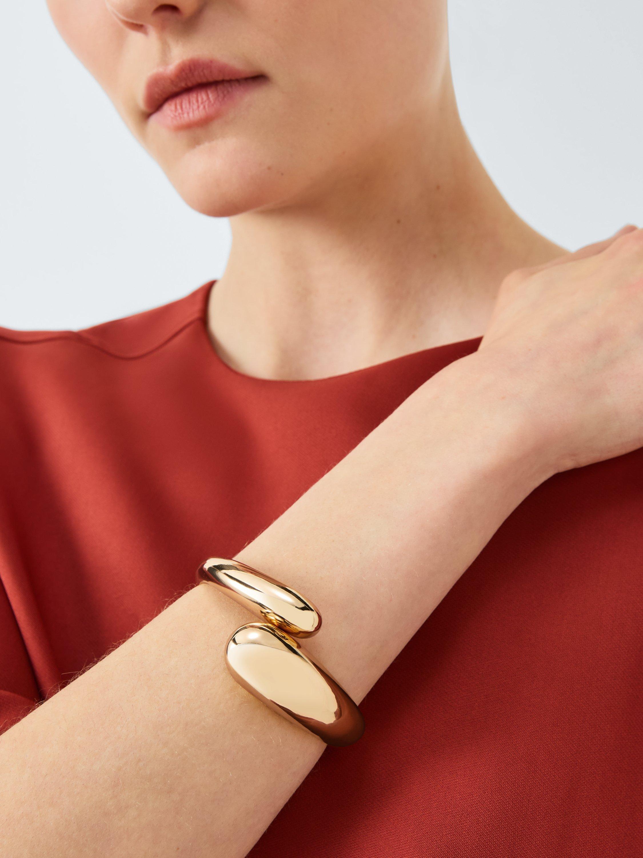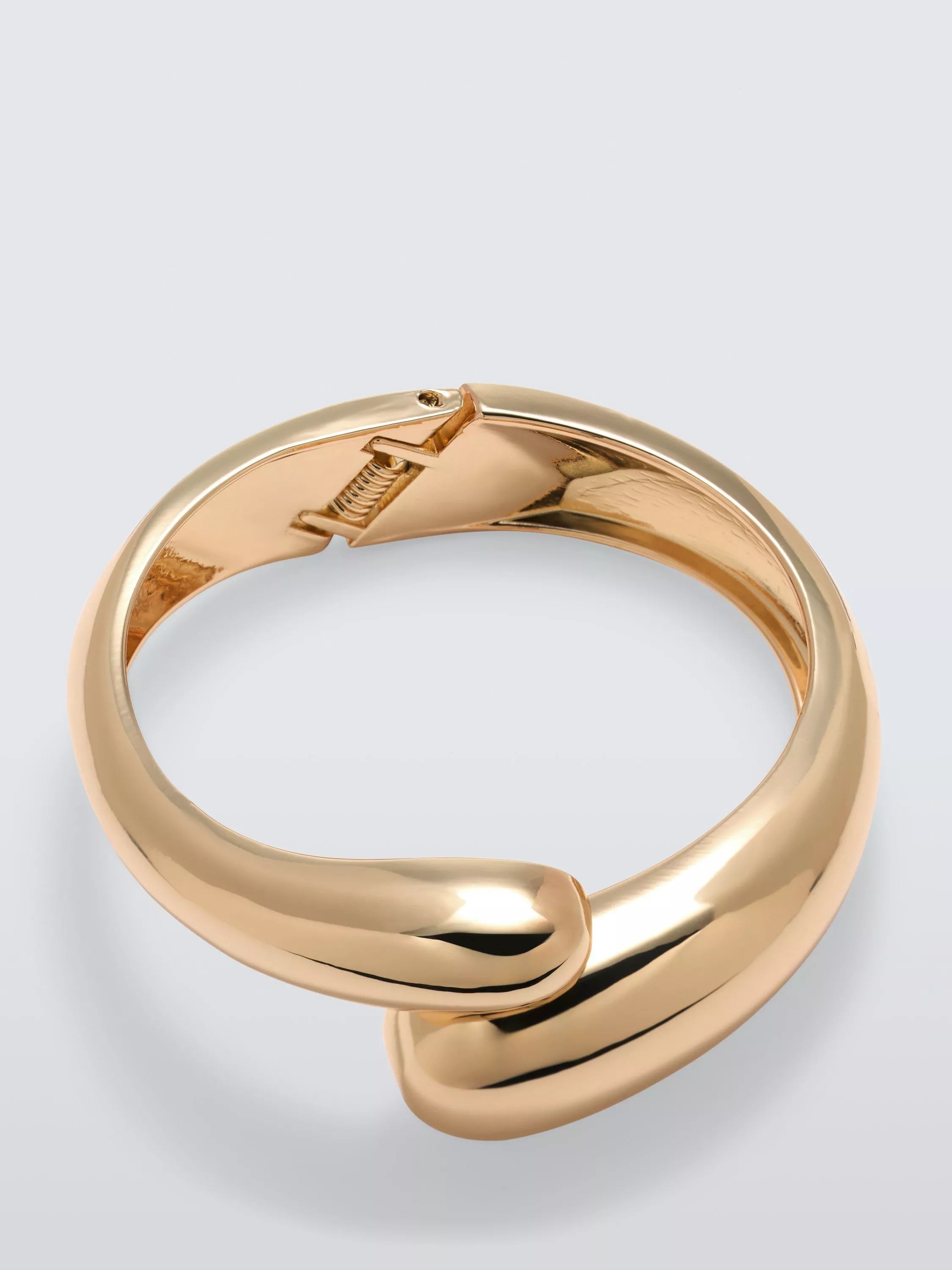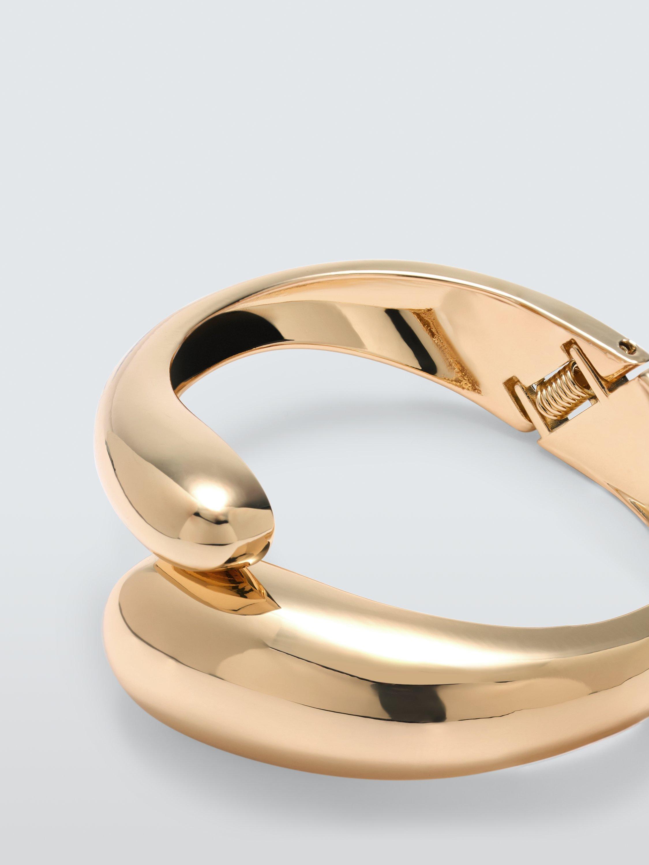 A modern, simple design, this bangle has domed ends with a polished finish. It is hinged for easy ons and offs.