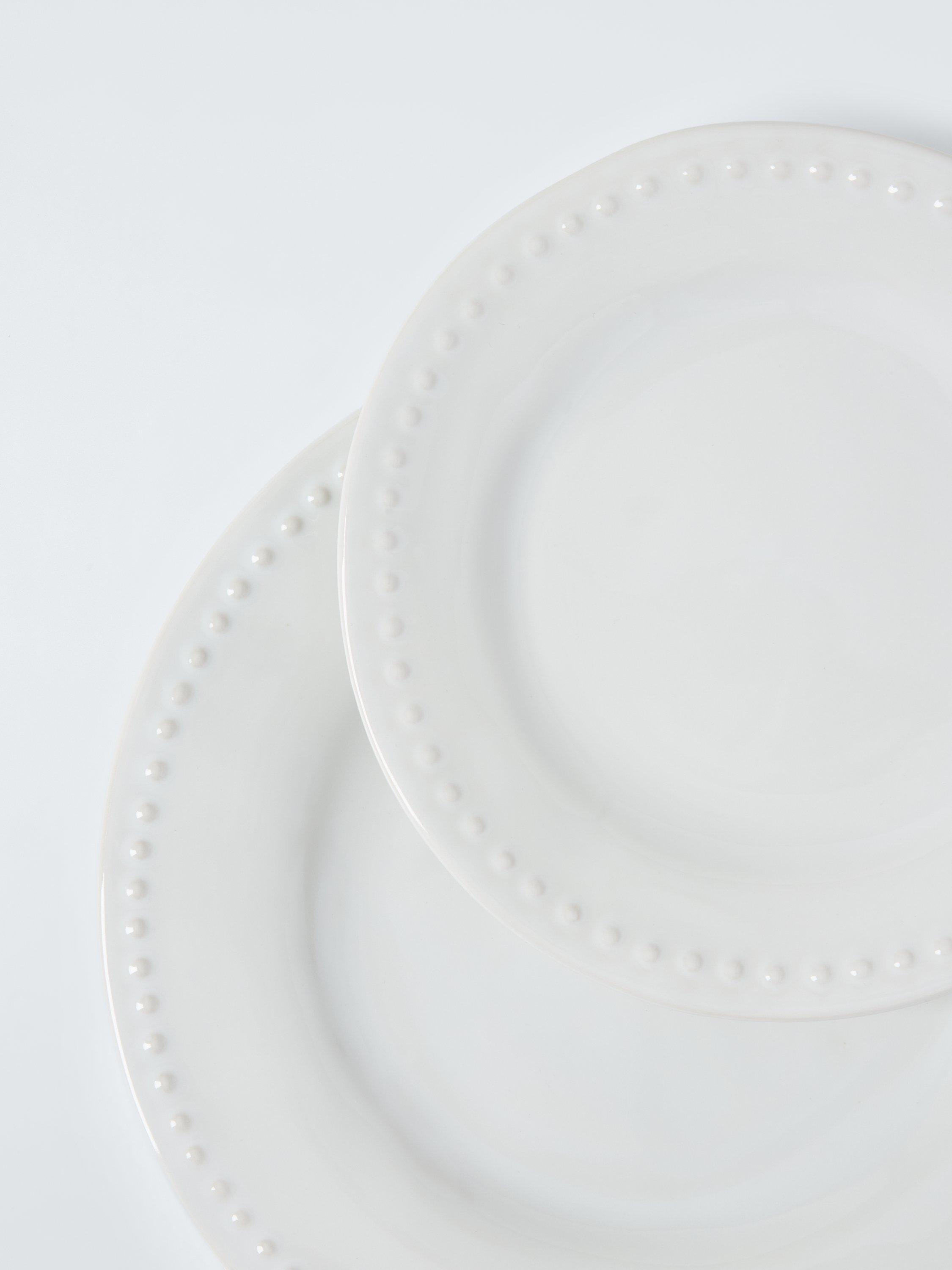Our Dot 12-piece stoneware dinnerware set features subtle texture with dot-patterned rims.