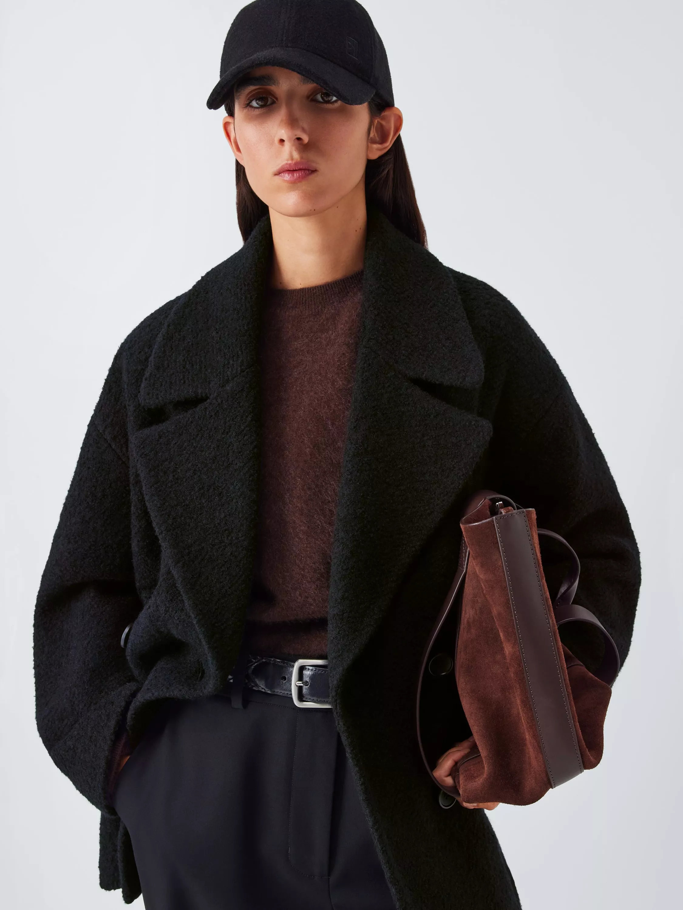 Bouclé textured coat made from pure wool for warmth. Tailoring nods can be seen in the finishing details of this double-breasted design: the oversized notched lapels, the button-through front and the slanted welt pockets.