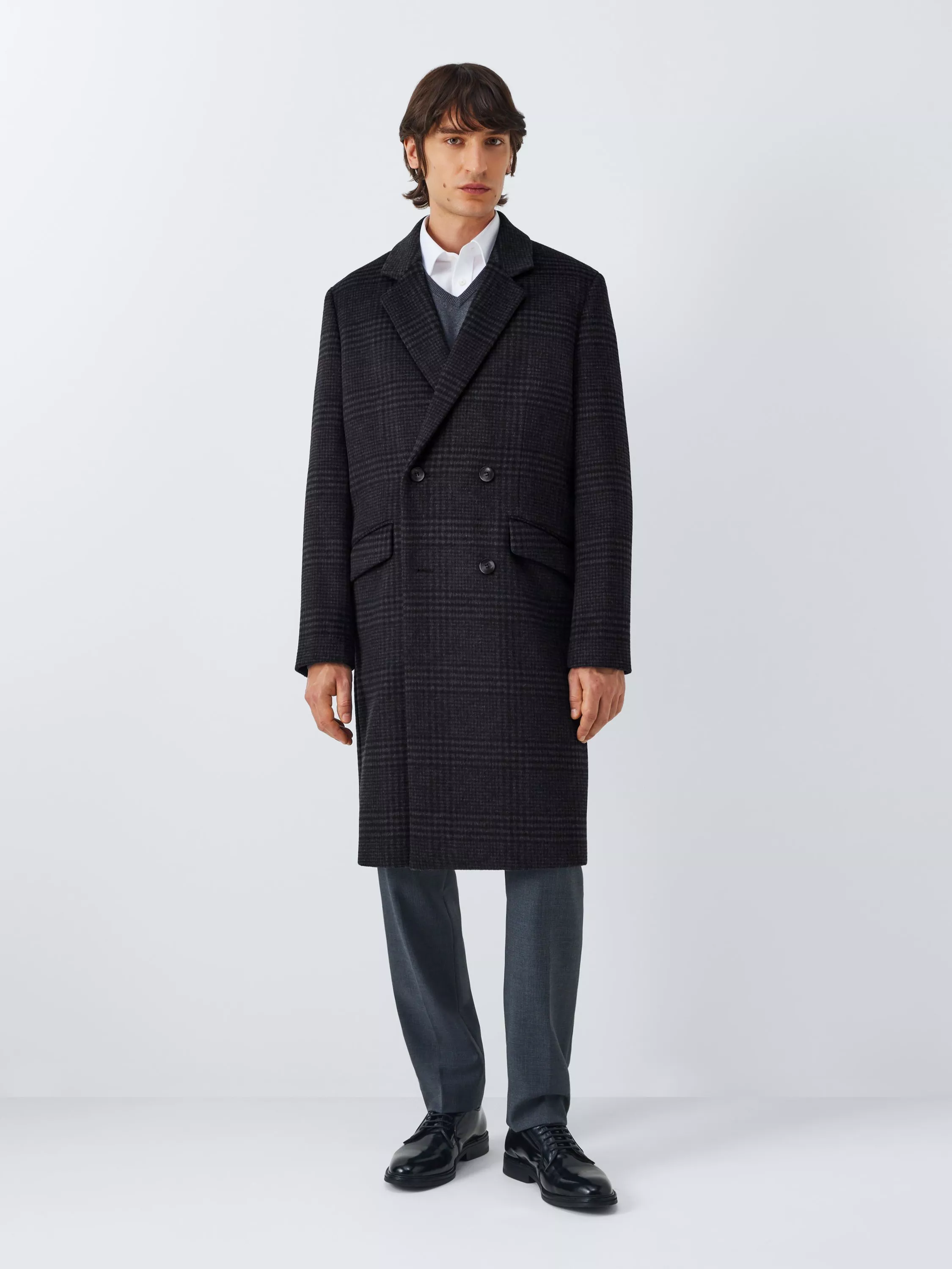 A double-breasted overcoat cut from a soft wool-blend fabric and finished with a check pattern that adds another welcome dose of character.