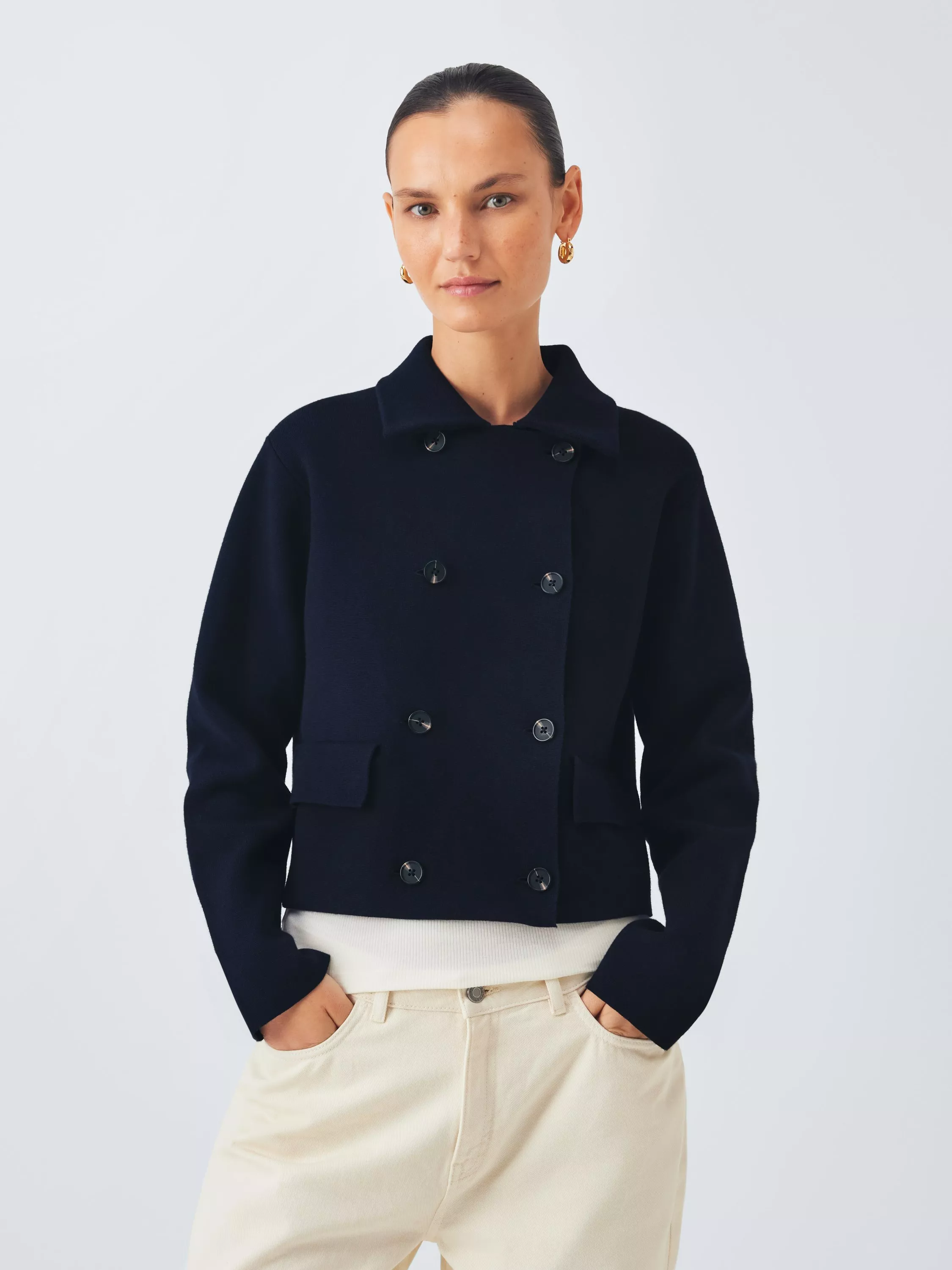 Double-breasted jacket in a cotton blend knit. A clean design, kept modern and minimalist with a simple collar and two flap pockets.