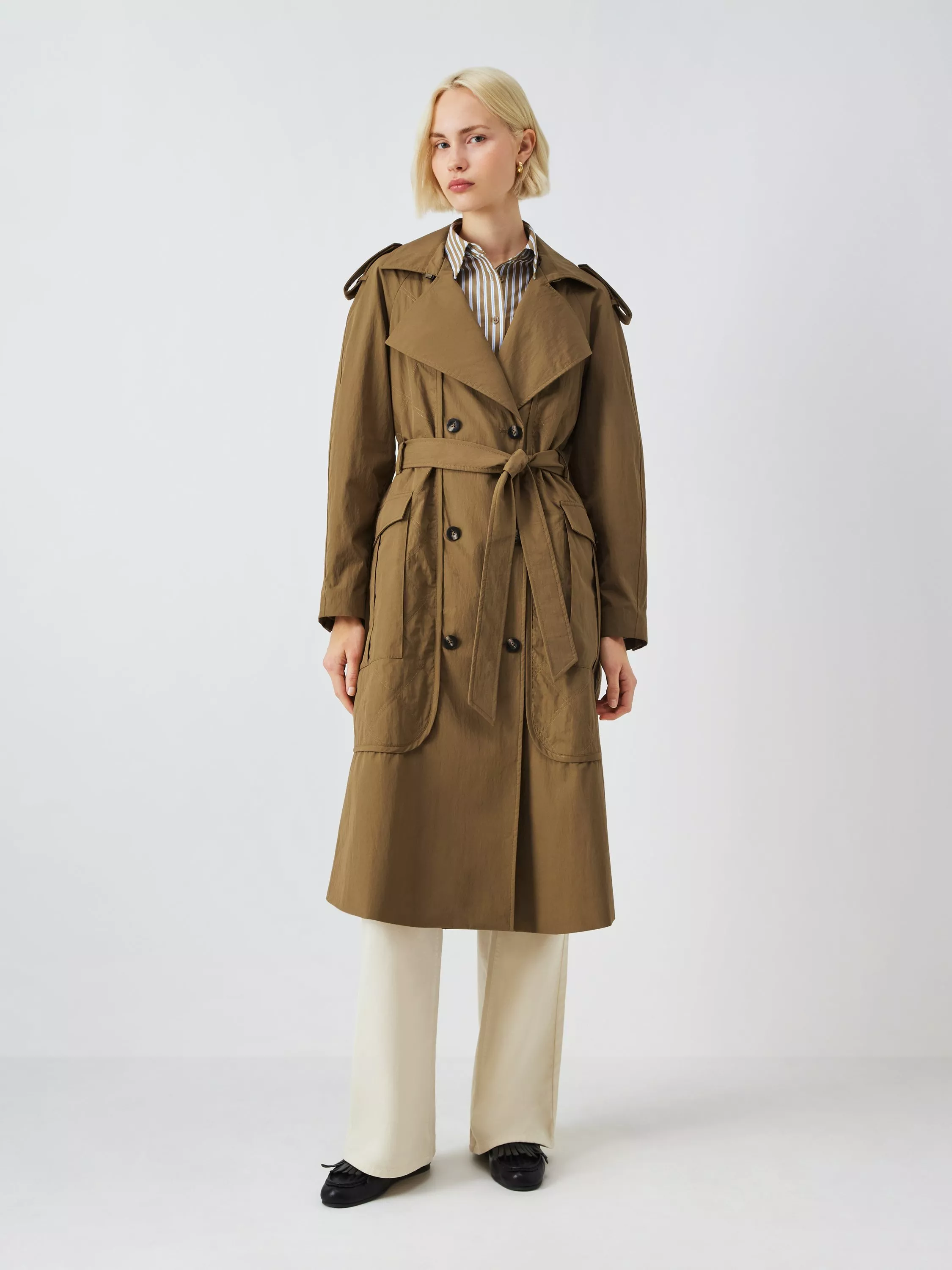 A double-breasted outerwear style with a tie fastening at the waist and large, practical pockets.