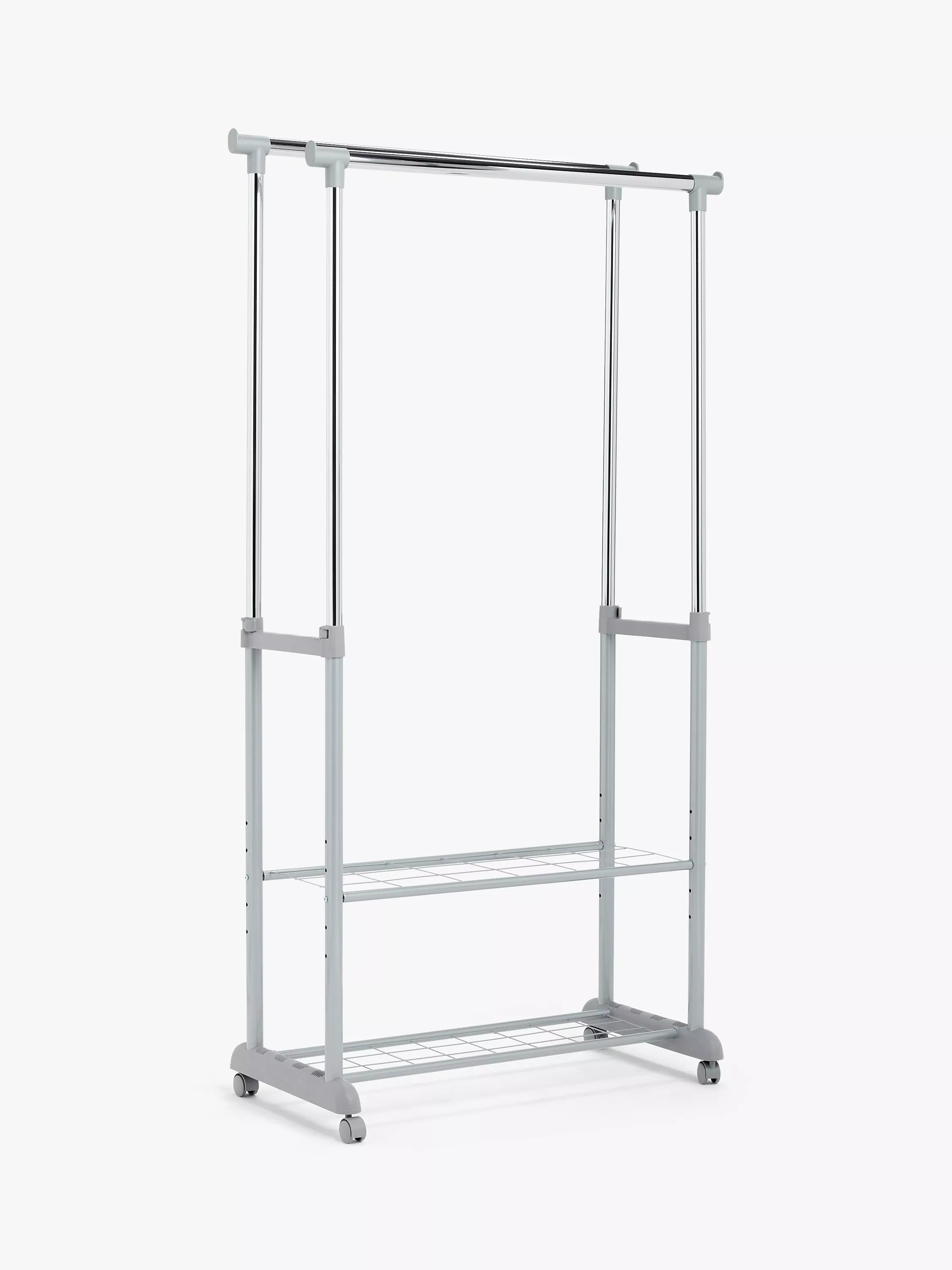 Rail heights can be adjusted independently from one another so you can choose to have one for hanging long clothes and the other for shorter pieces. Two shelves give you even more room for shoes and accessories.