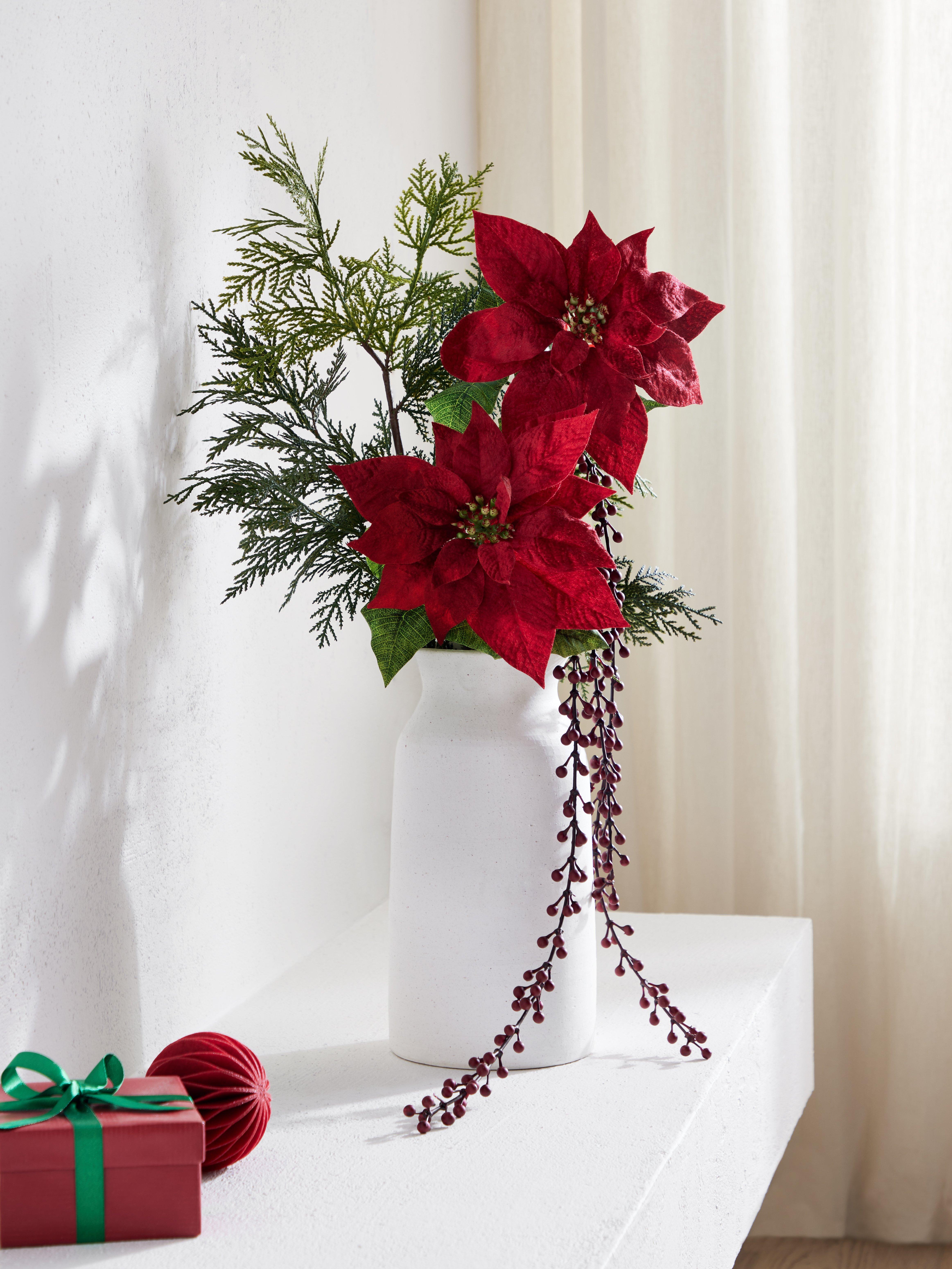 Featuring two vibrant poinsettia blooms on a single stem, this piece adds lush colour and festive charm to wreaths, bouquets, and arrangements.