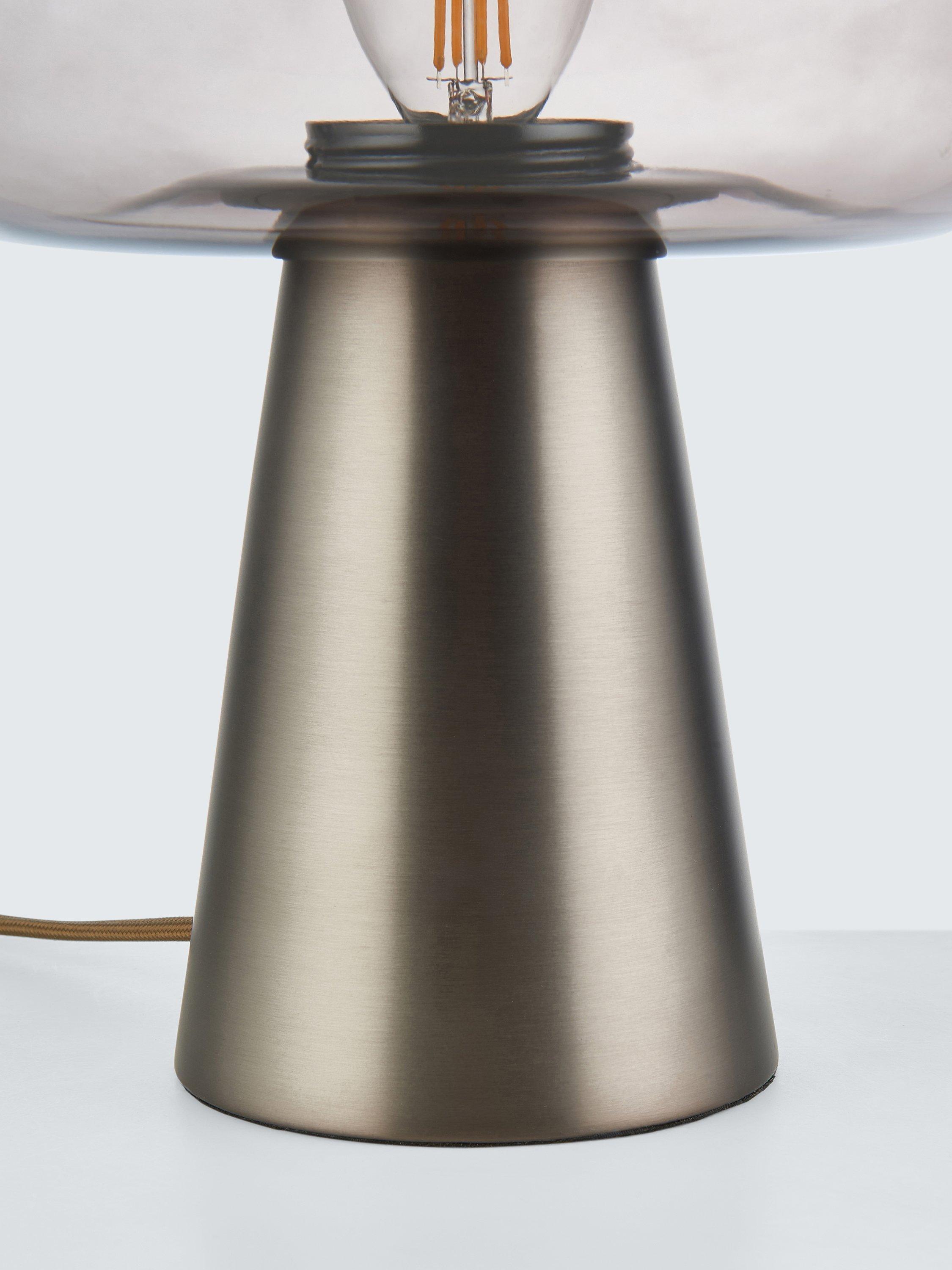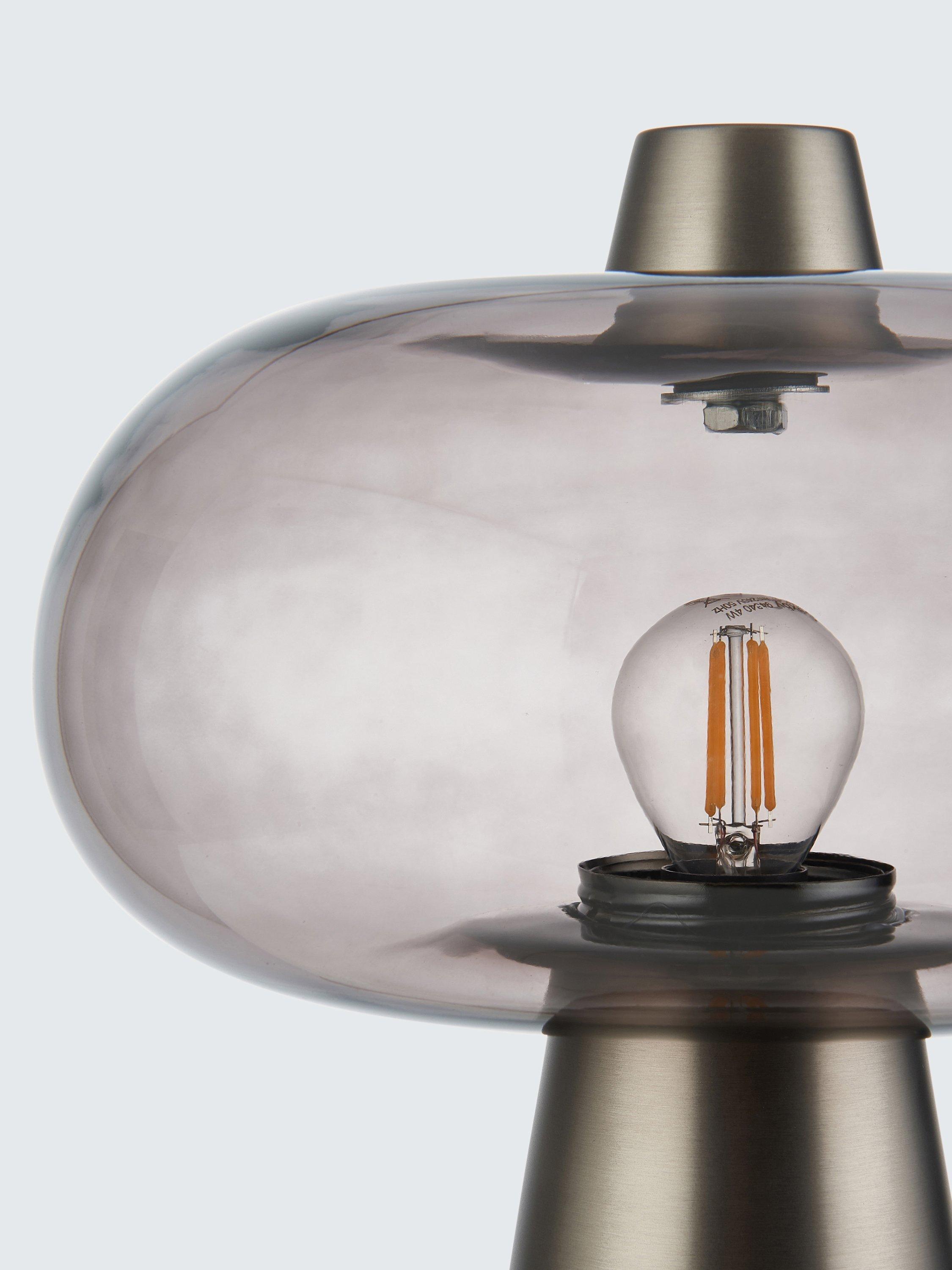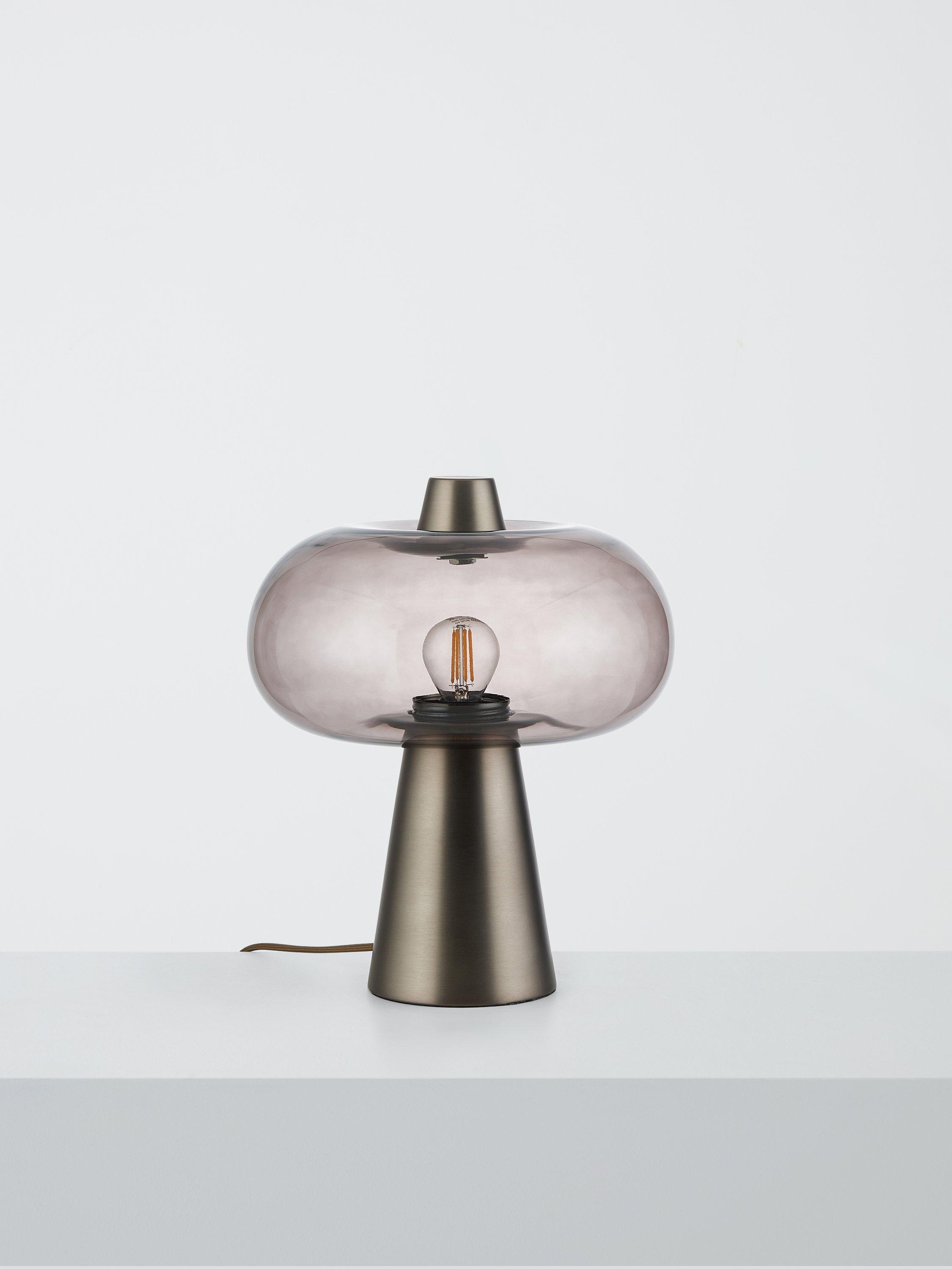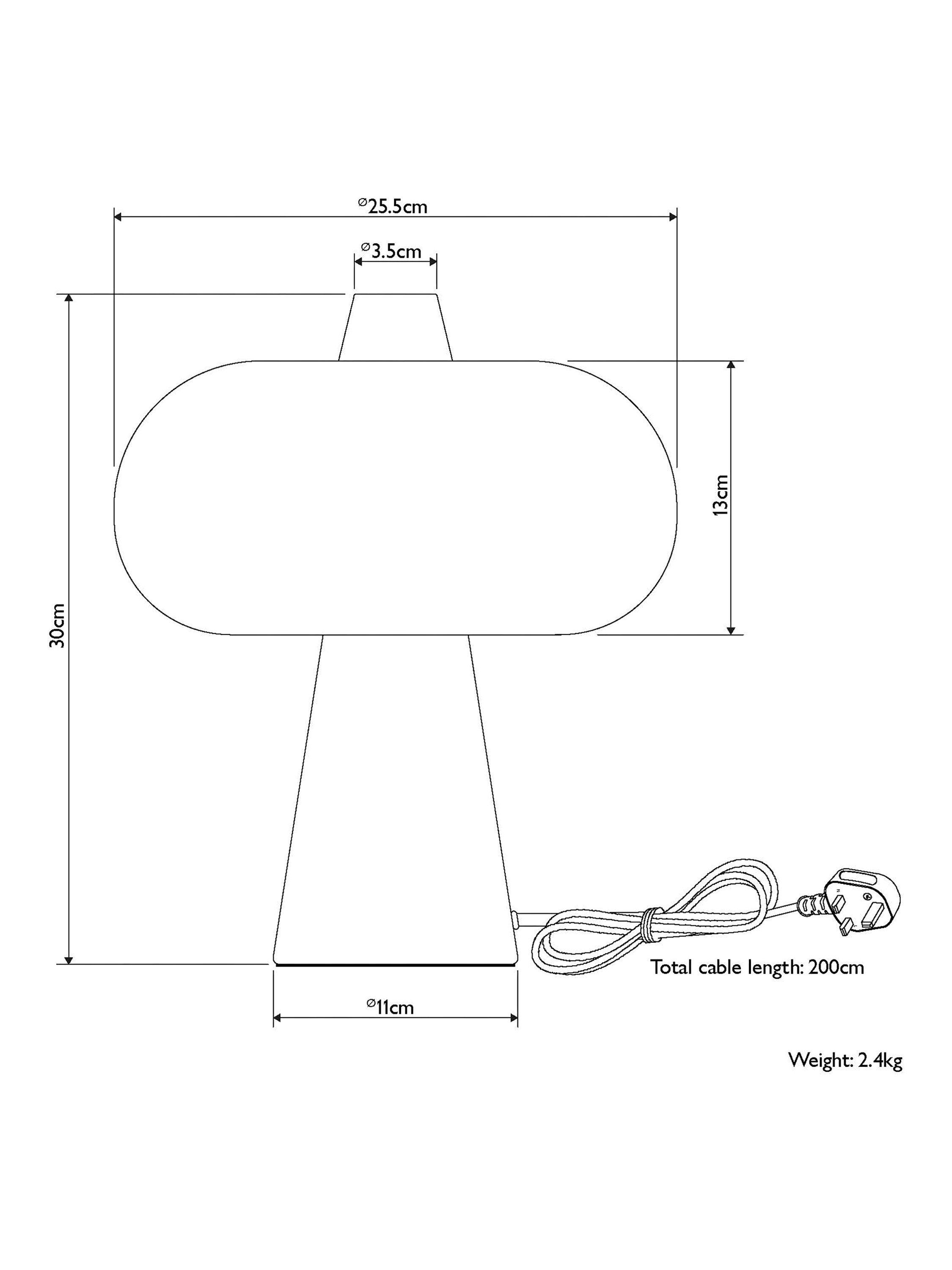 A sculptural statement piece with a bold retro combination of metal and opaline glass. This doughnut-shaped table lamp features a three-stage touch dimmer, allowing for easy adjustment of the light and setting the perfect mood.
