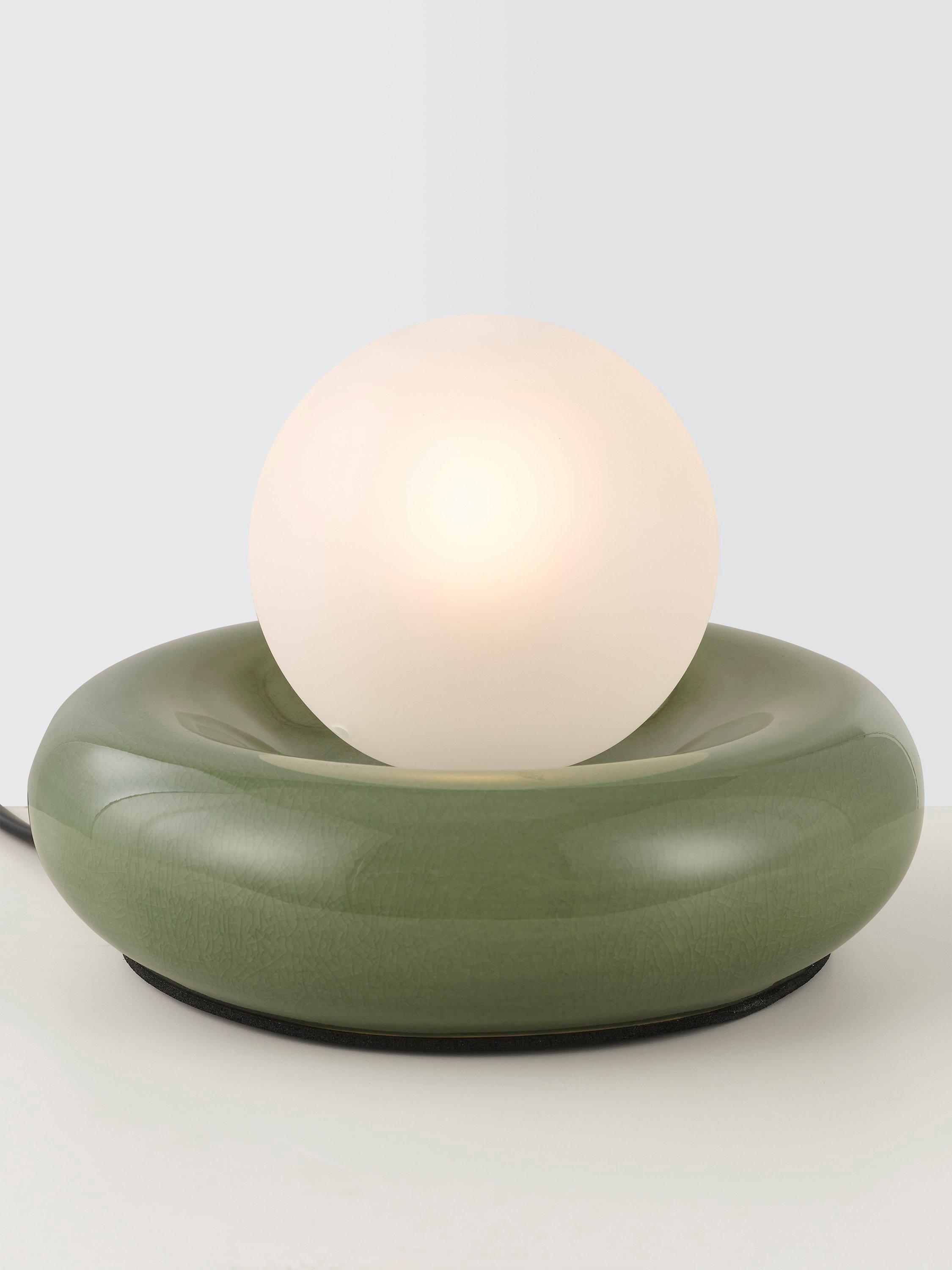This playful doughnut-shaped table lamp has a gloss white glass ball shade, contrasting with the coloured gloss glaze on the ceramic base.