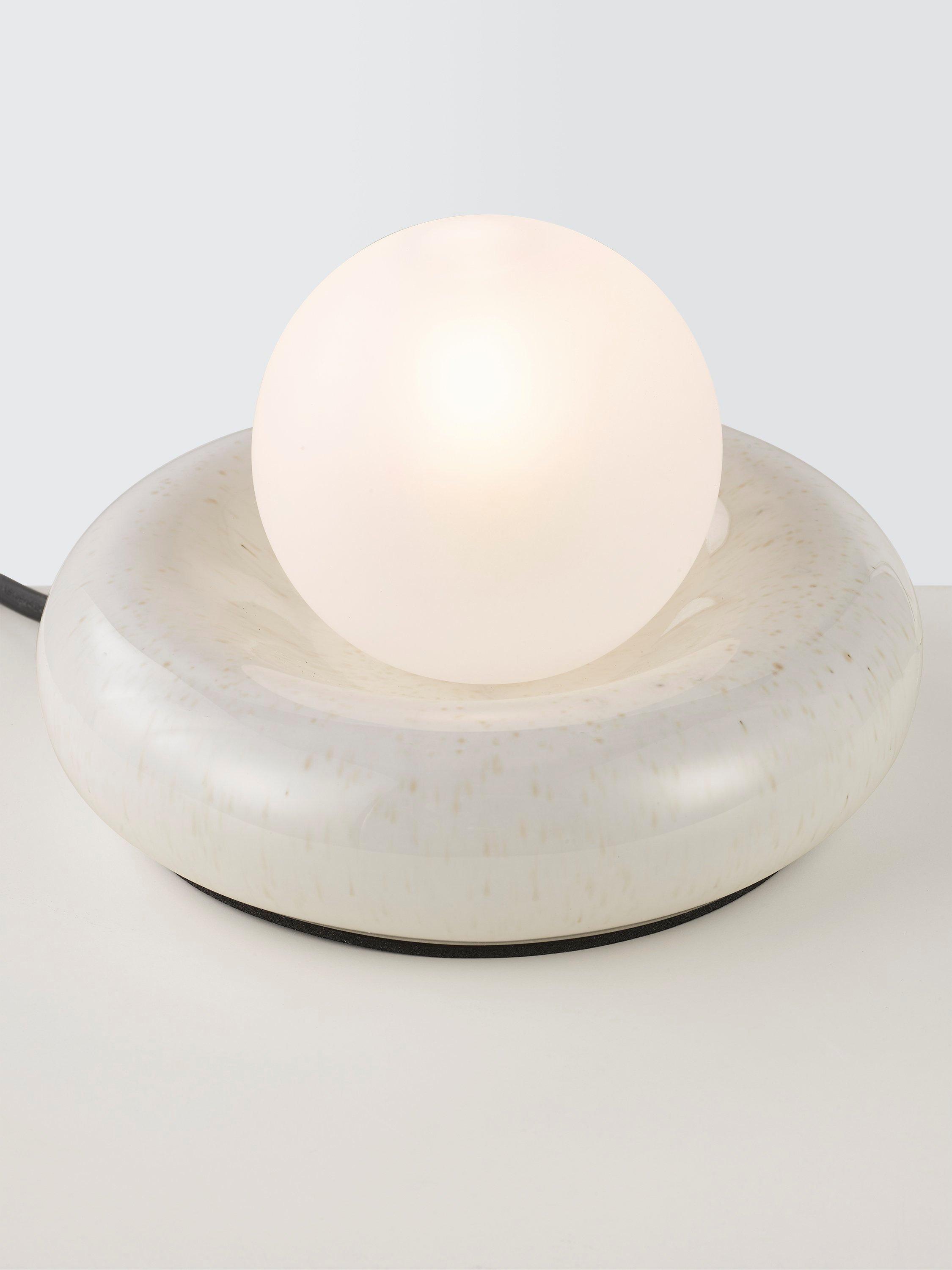 This playful doughnut-shaped table lamp has a gloss white glass ball shade, contrasting with the coloured gloss glaze on the ceramic base.