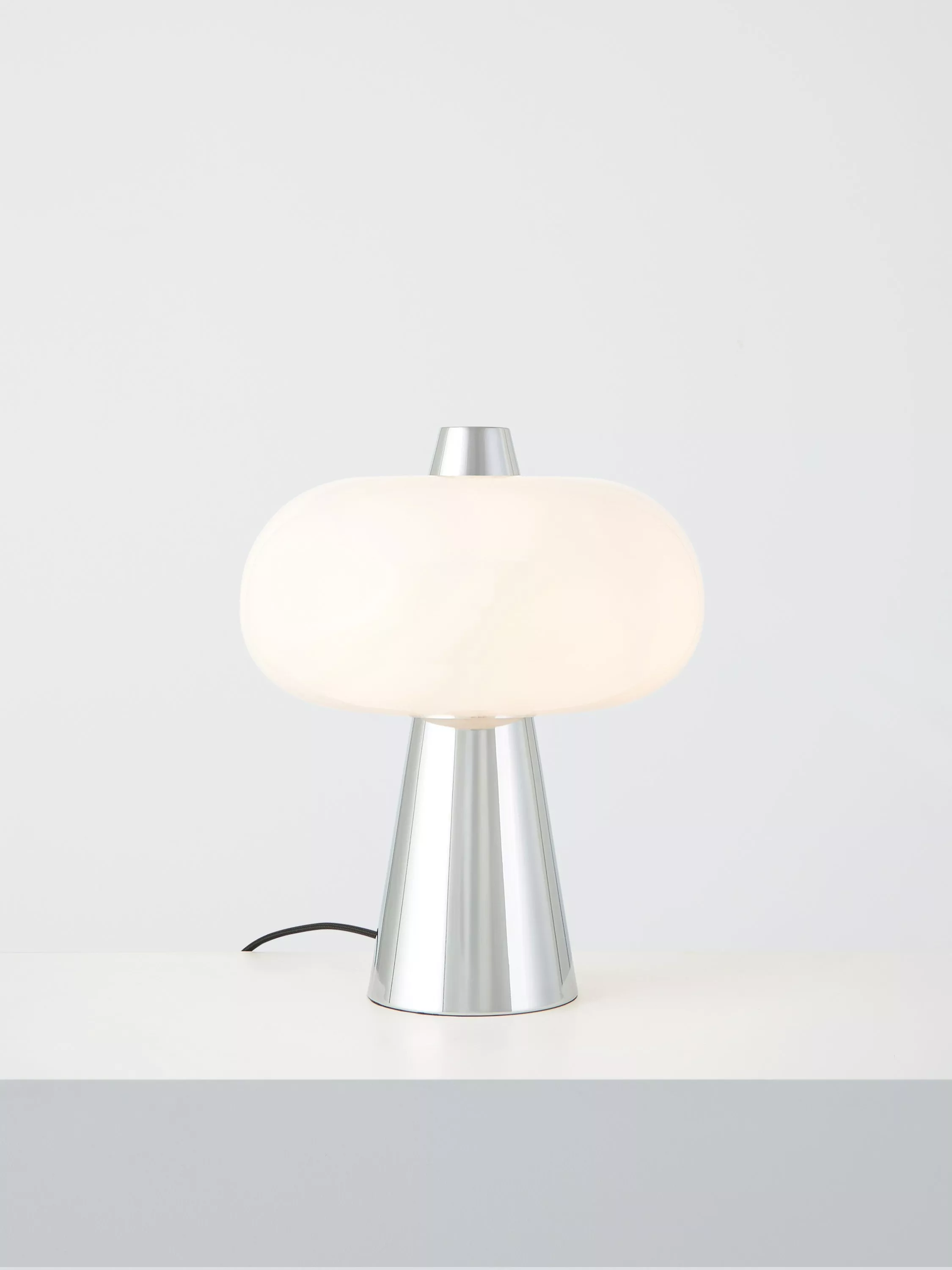 A sculptural statement piece with a bold retro combination of metal and opaline glass. This doughnut-shaped table lamp features a three-stage touch dimmer, allowing for easy adjustment of the light and setting the perfect mood.