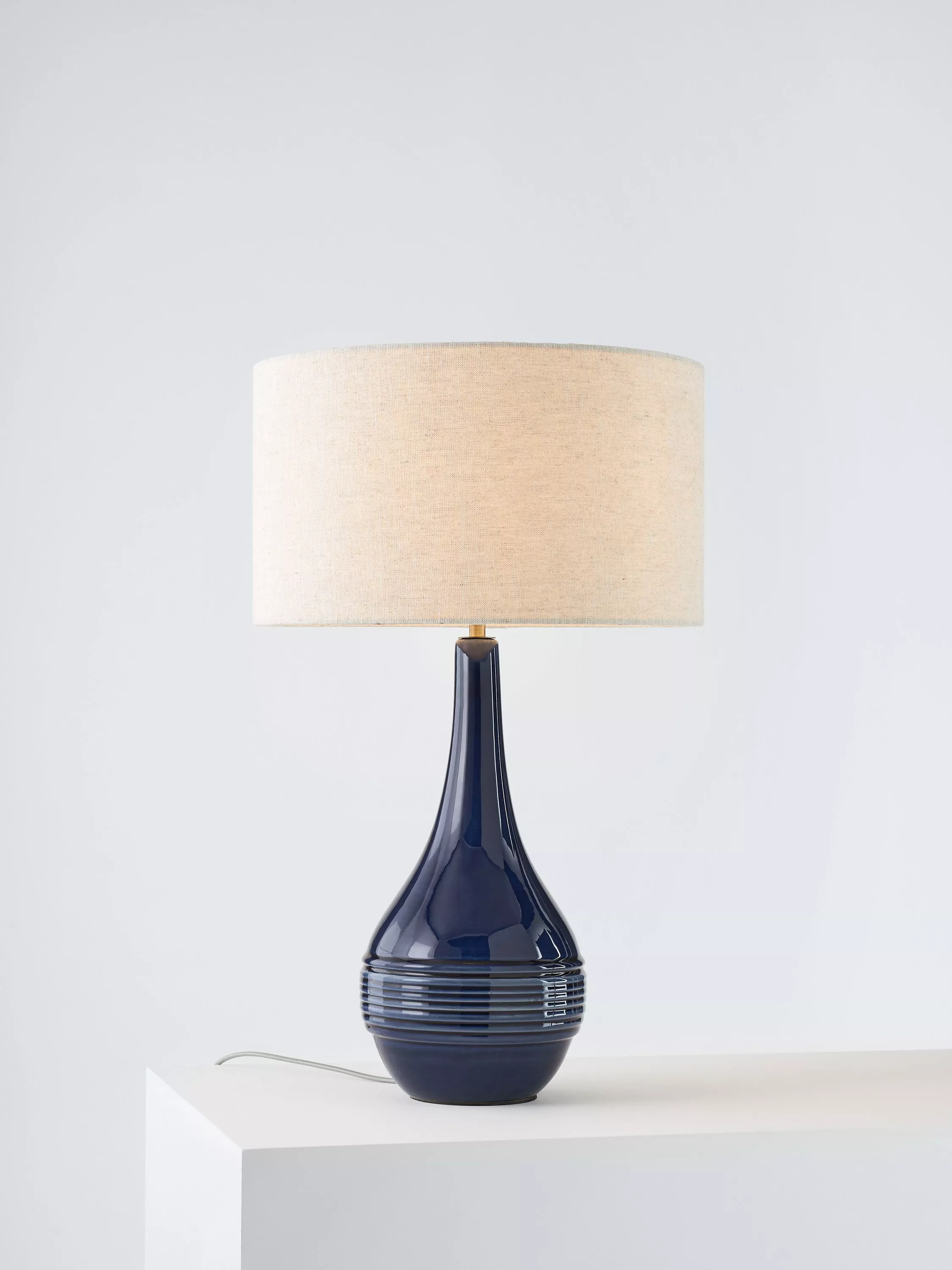 Showcasing a dreamy reactive glaze with a subtle transparent effect, accentuated by the horizontal ribbing around the ceramic base. This table lamp will add some classy colour to the home, finished with a linen shade and antique brass metalwork.
