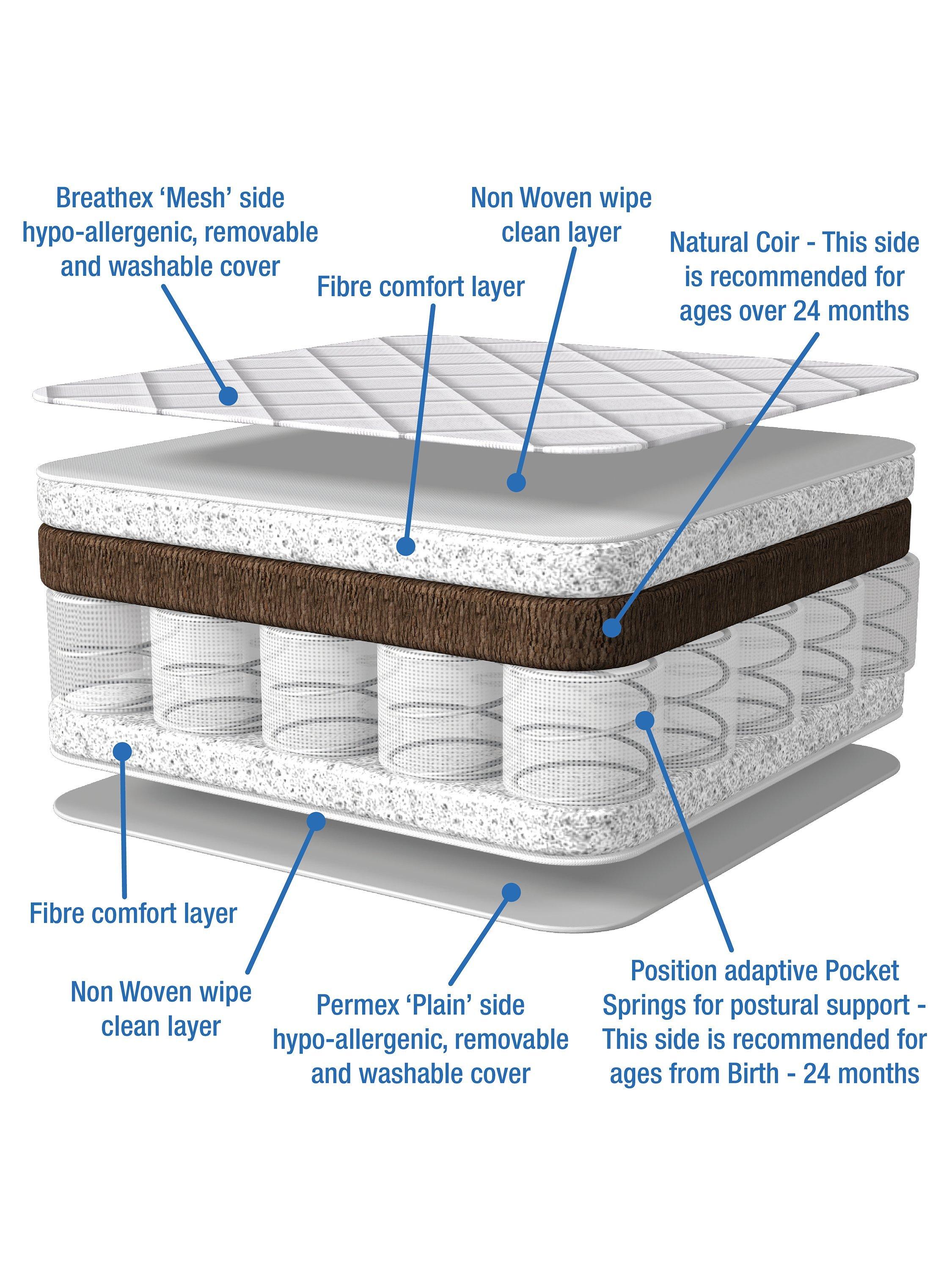 Two-sided support - The pocket spring side is suitable from birth to 24 months while the coir side is suitable for kids over 24 months.
