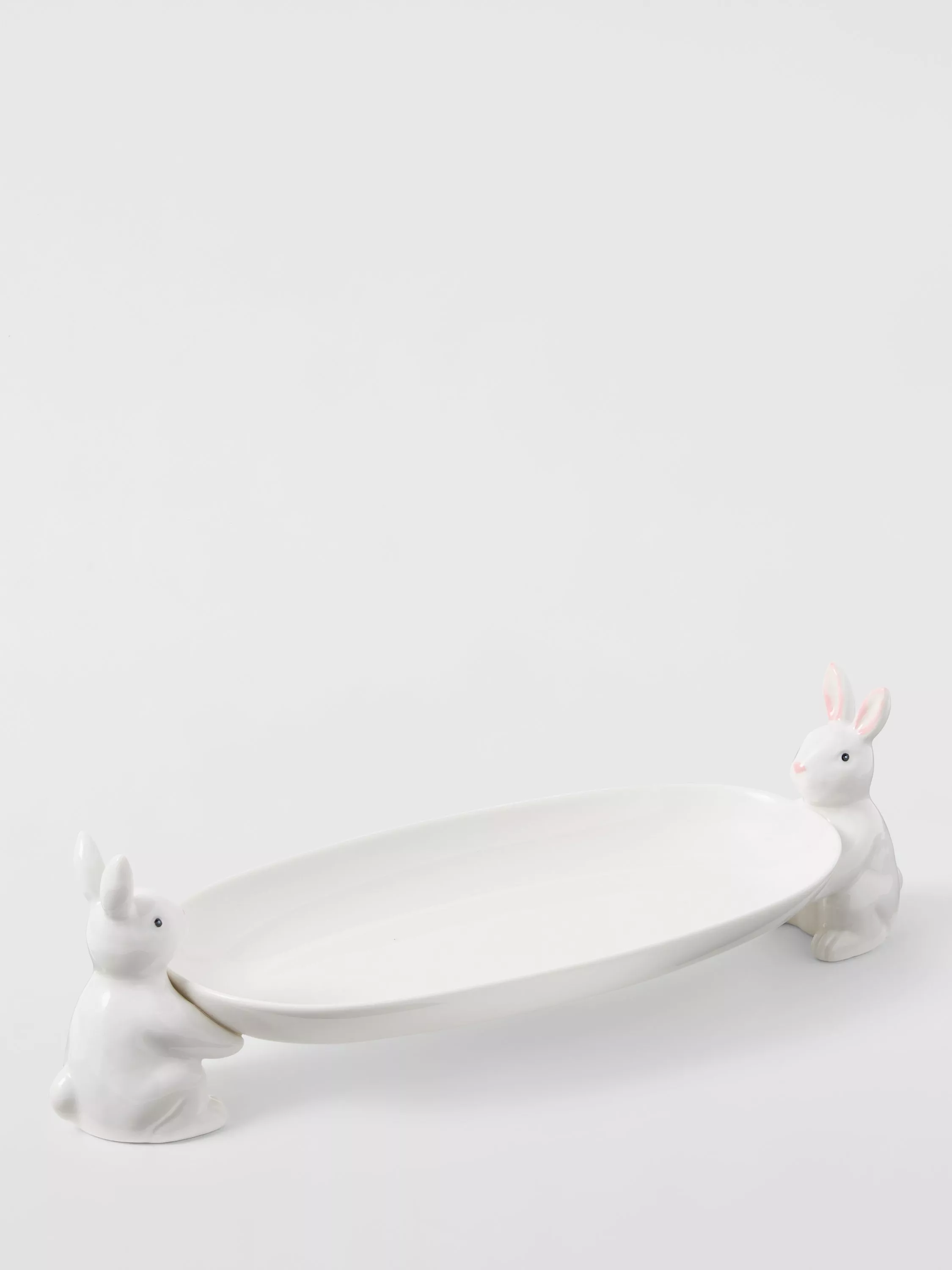 Great for Easter bakes and treats, this fine china cake stand is held aloft by two mini rabbits.