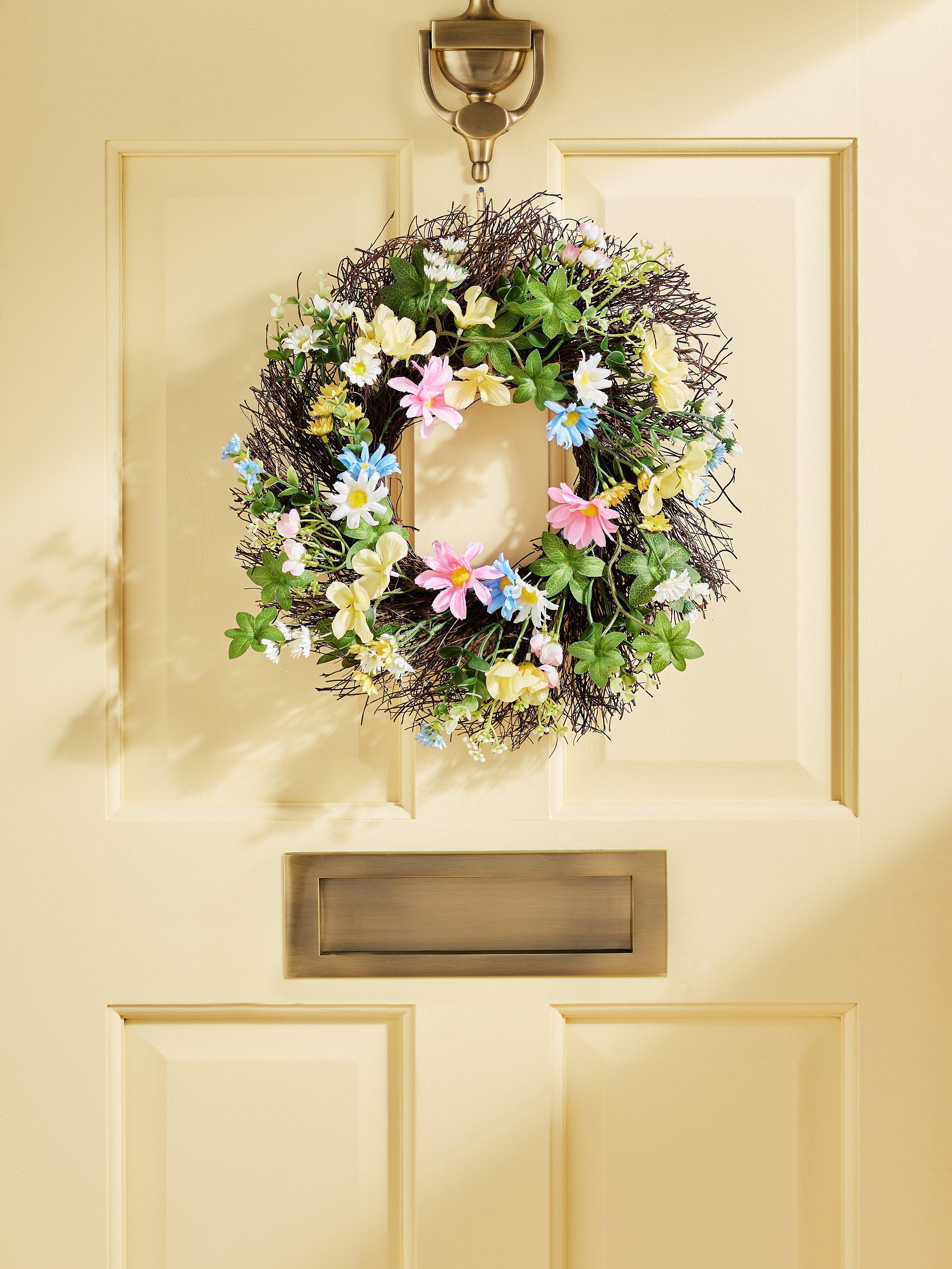 Welcome your guests with this charming Easter wreath. Made with a rattan base, it's trimmed with an array of realistic-looking artificial flowers.