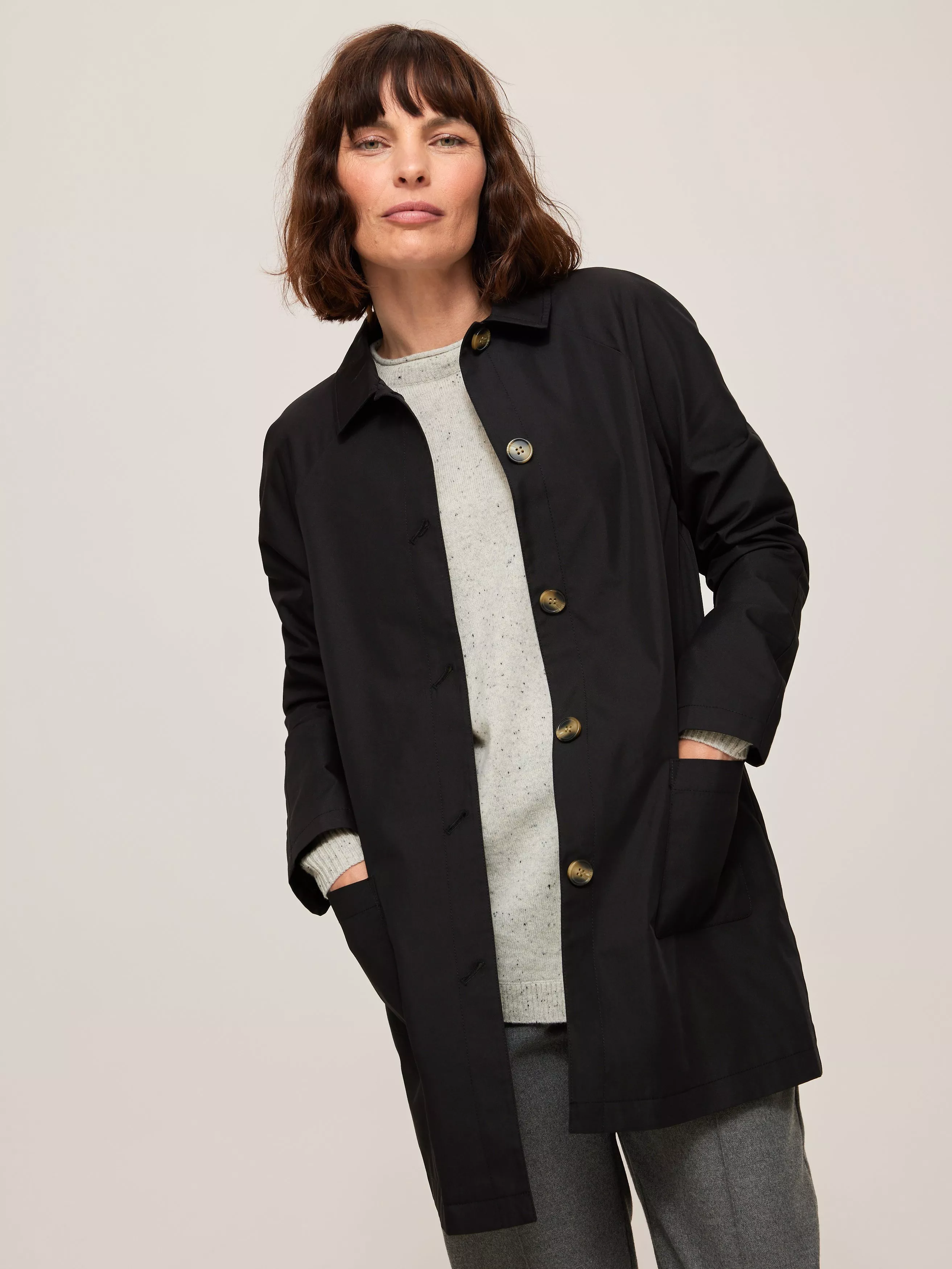 Our take on a classic style, we've cut our mac to a shorter length for a modern touch. Framed by a classic collared neckline, the clean silhouette has been punctuated by contrast tortoiseshell button whilst pockets offer storage for loose essentials and chilly hands.