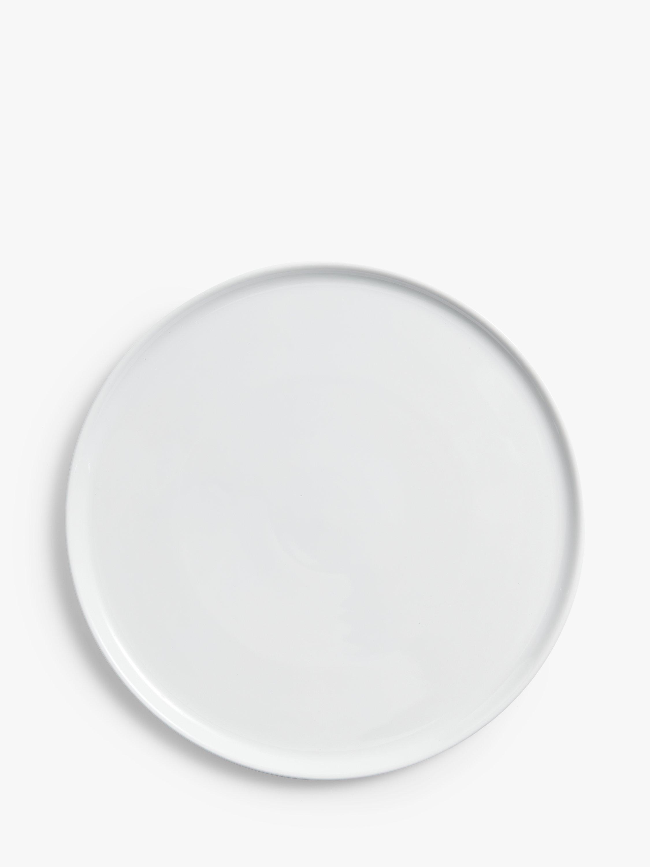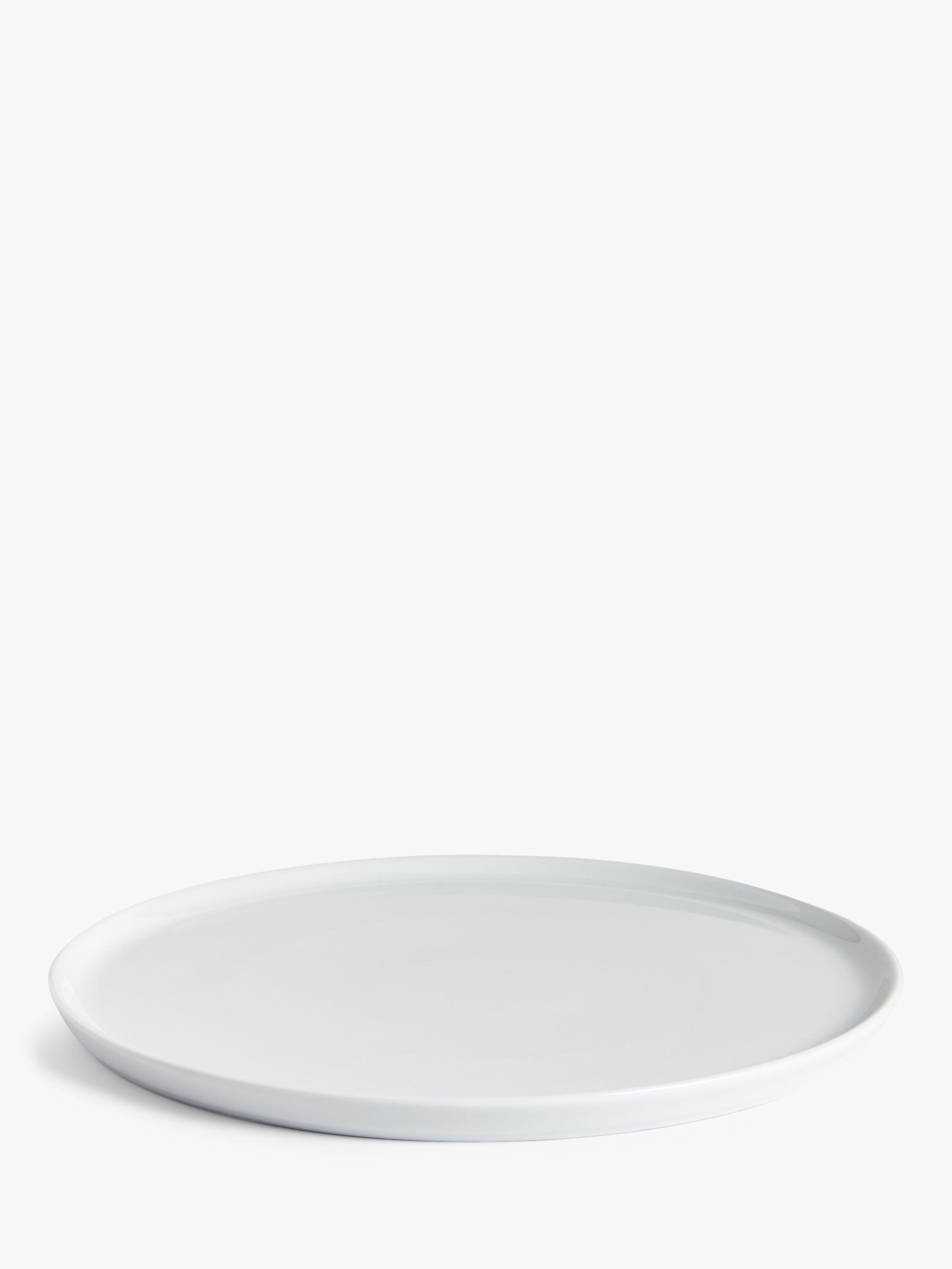 A round serving platter with a raised rim. Made of porcelain, it's dishwasher and microwave save for everyday use.
