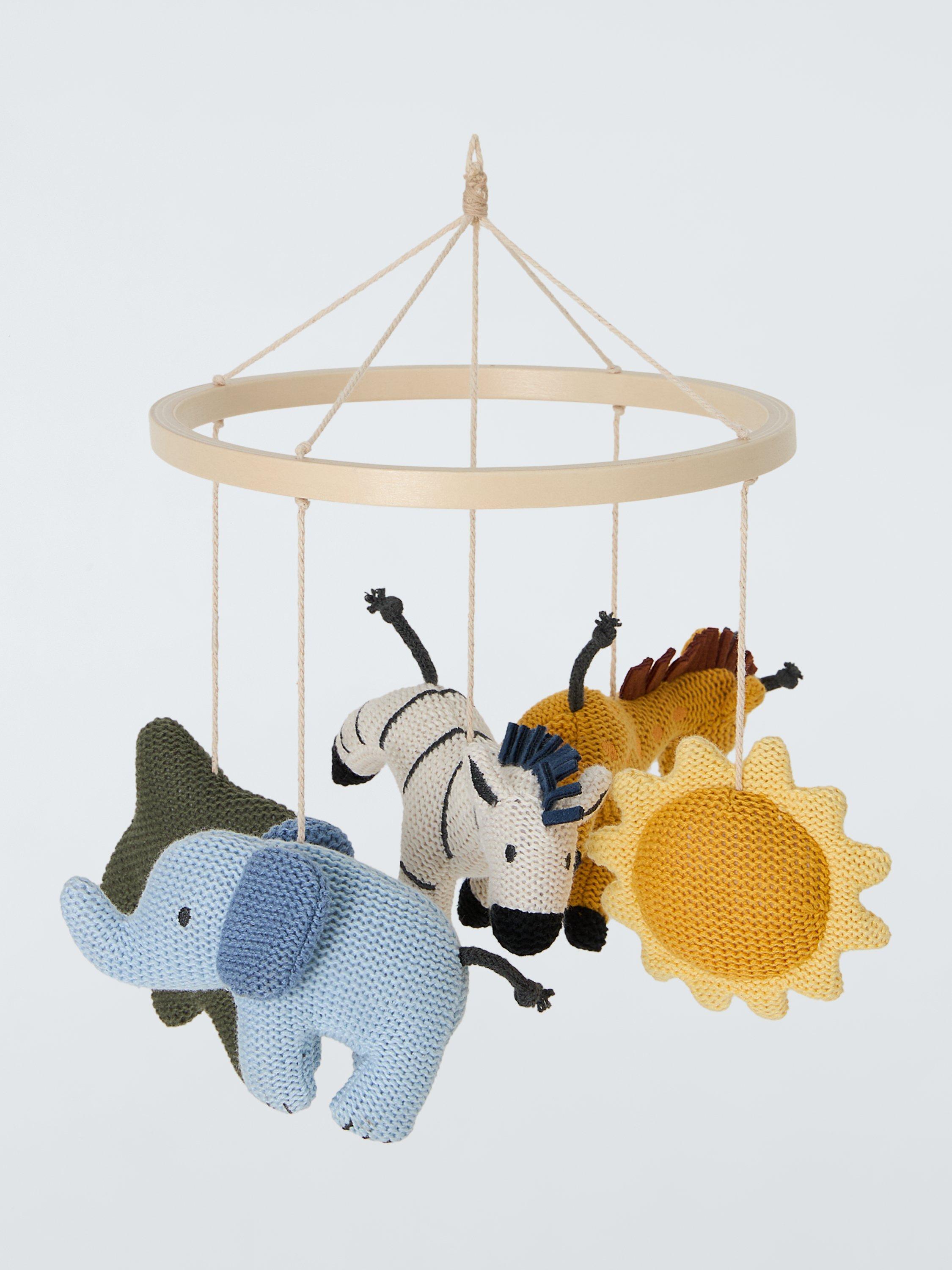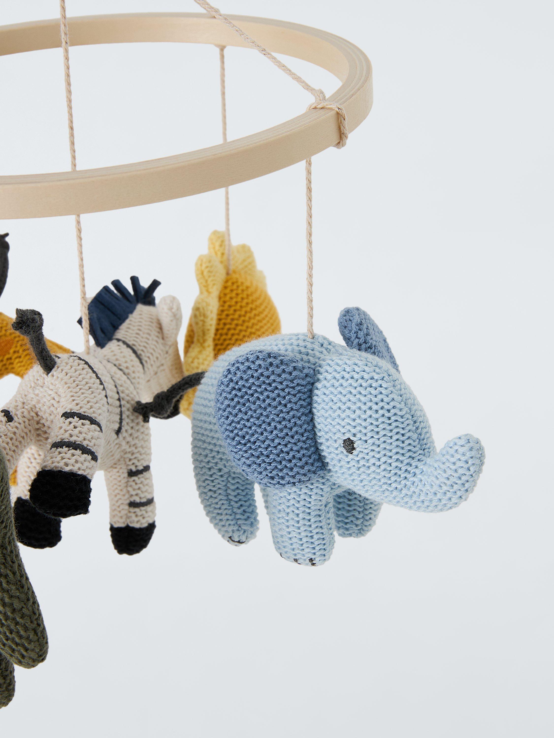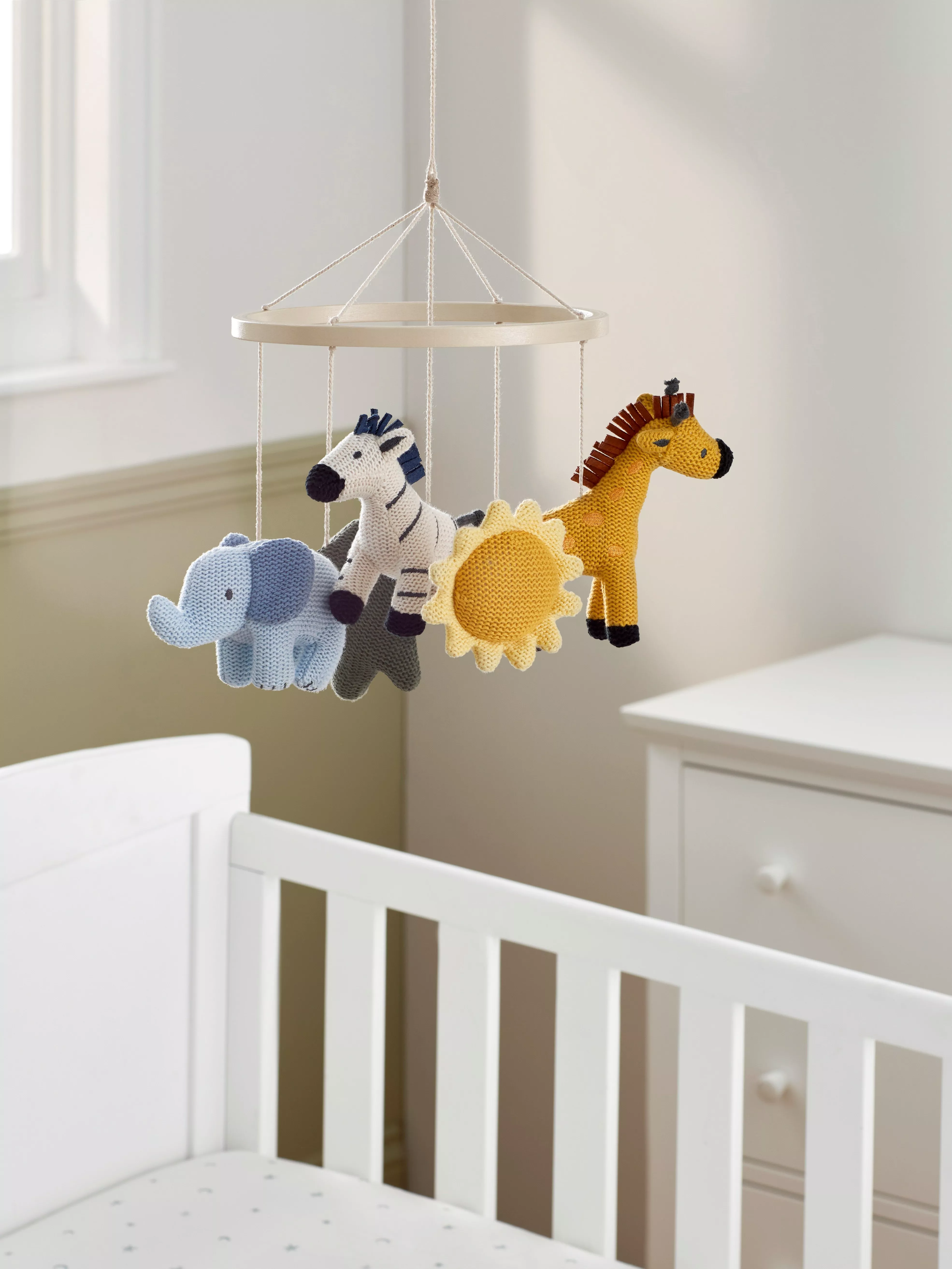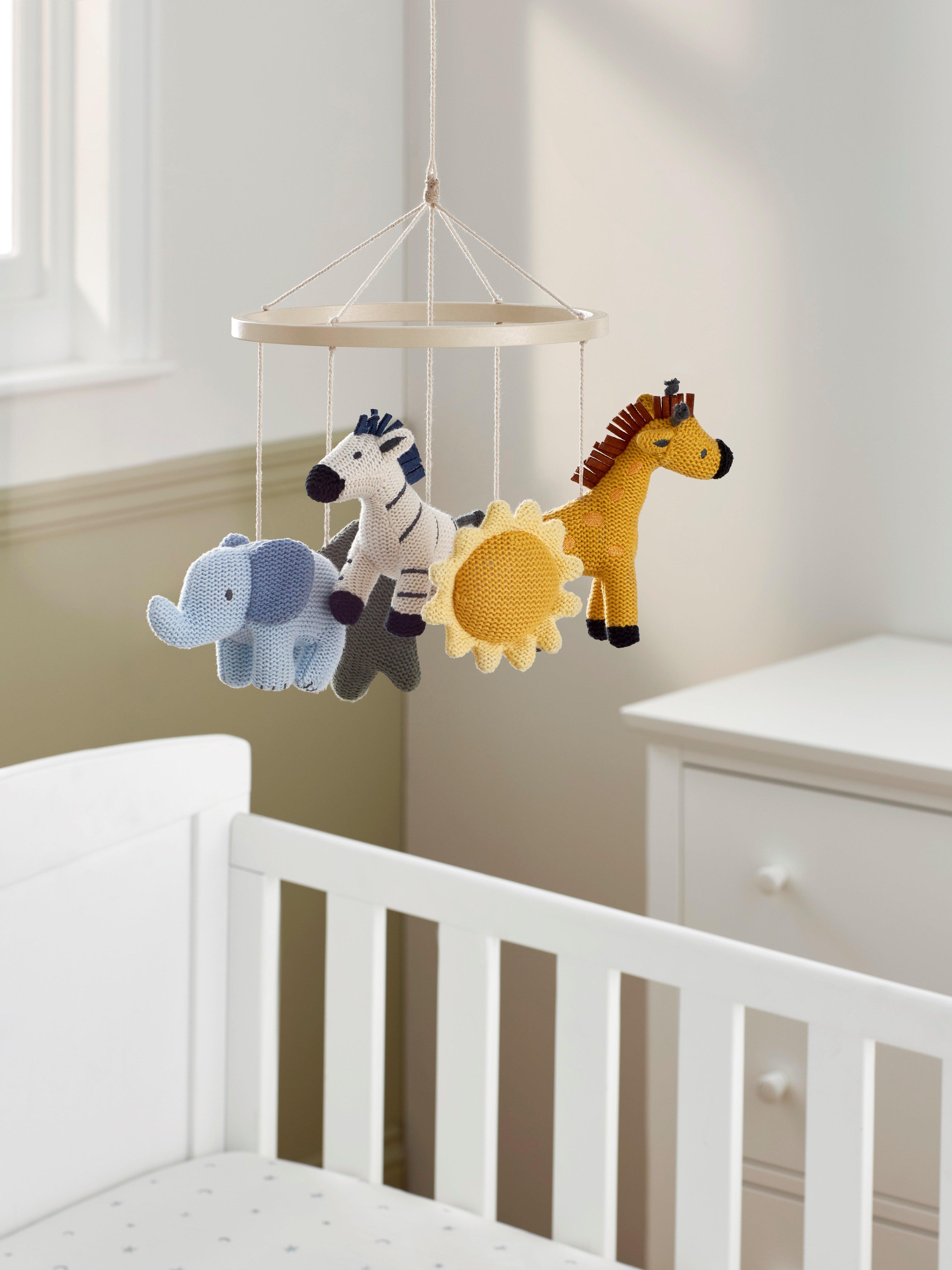 Our Eden Safari mobile features brightly coloured, knitted animal characters.