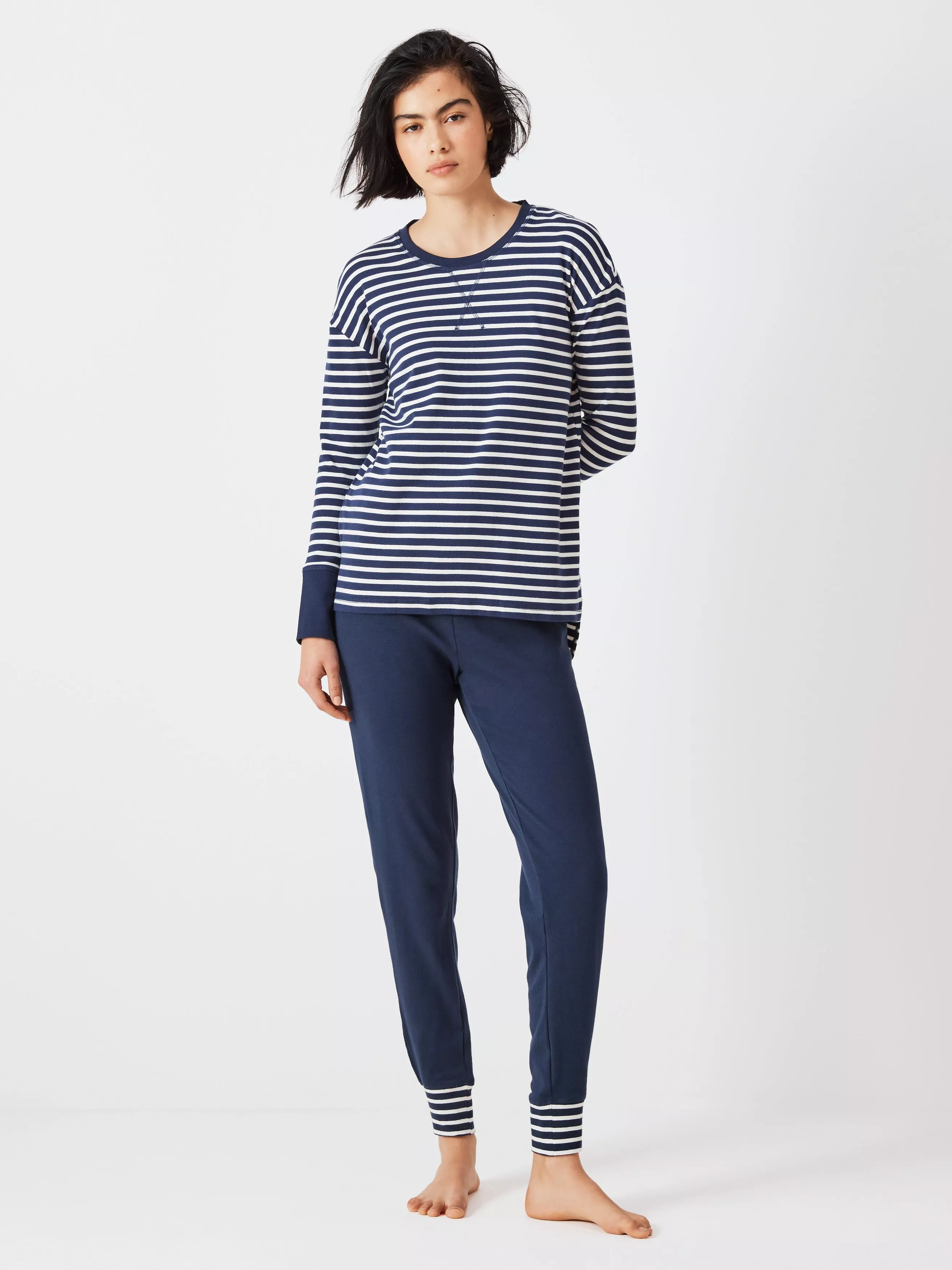 Featuring chic stripes, our pyjamas are made from a stretch cotton jersey which is super-soft and breathable. Perfect for year-round wear, we've designed this set for ultimate lounging in a relaxed cut with a simple t-shirt style top, pairing it with plain tapered jogger bottoms that pull on with an elasticated waistband for added comfort and have striped cuffs for a complementary touch.
