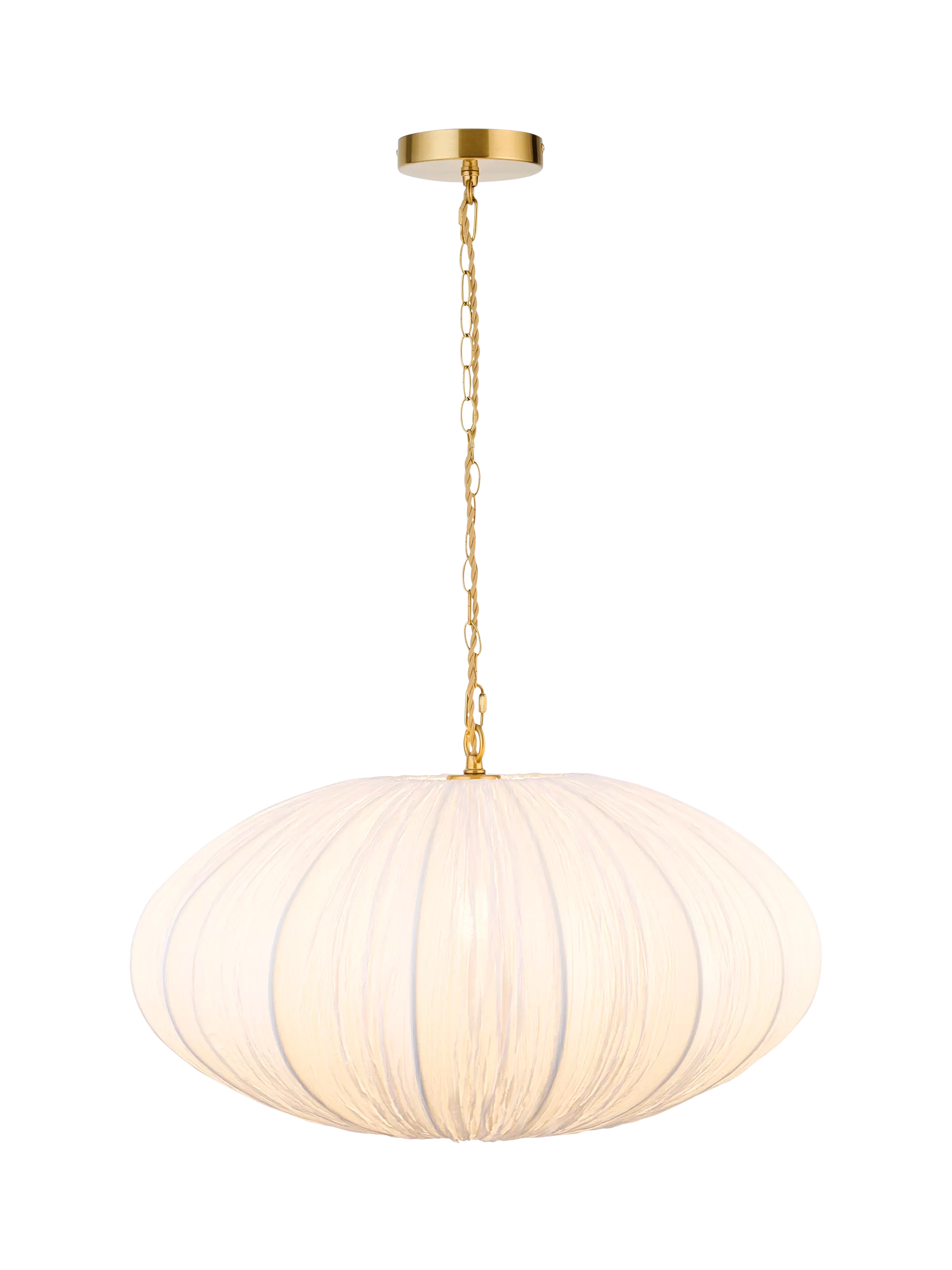 A sculptural statement pendant with a crisp and crimped appearance. Made from delicate silk-like fabric with a chic textured finish on the shade, this ceiling light is ideal for large spaces. Complemented with a warm antique brass chain, it's height-adjustable to suit your room.