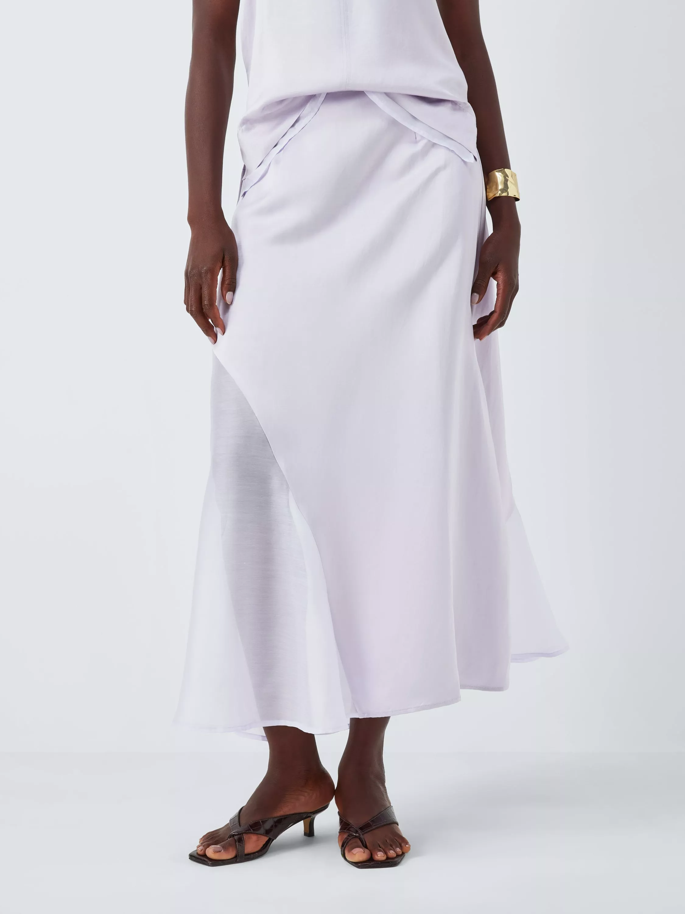 Woven skirt in a lightweight material that includes breathable linen and Tencel (a fabric derived from natural wood pulp). Styled with an asymmetric hem and sheer panel, taking it to a dramatic maxi length.