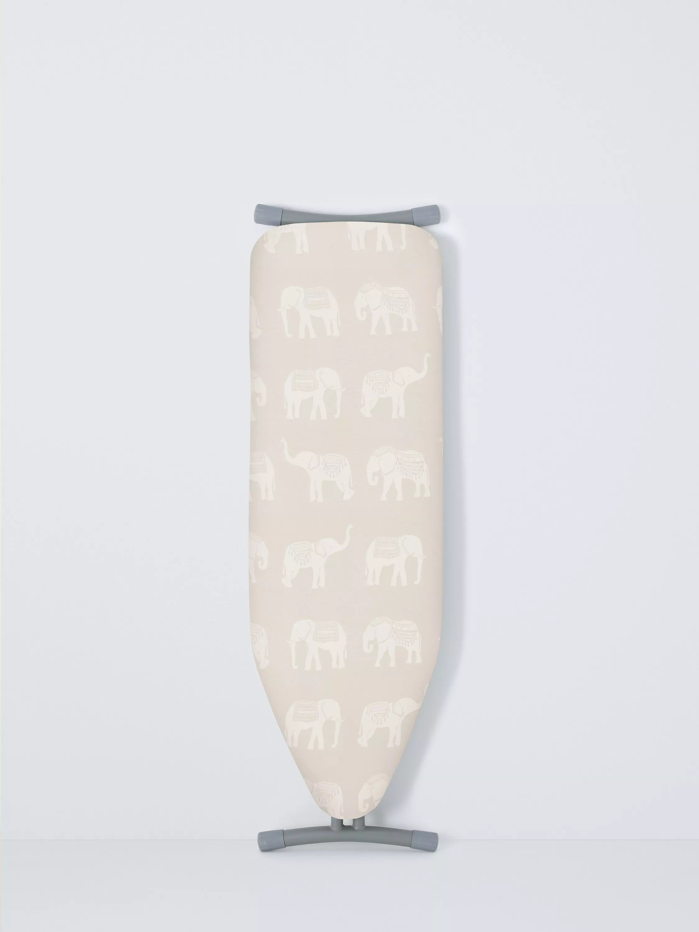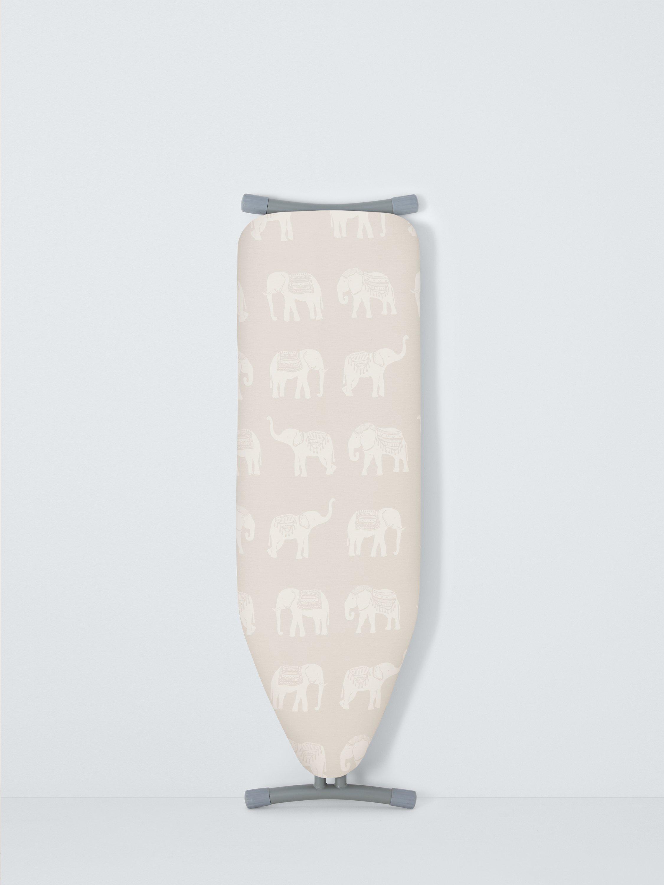 Elephant print ironing board cover with 5mm foam underlay, drawstring and rubber band and plastic hook fastening.