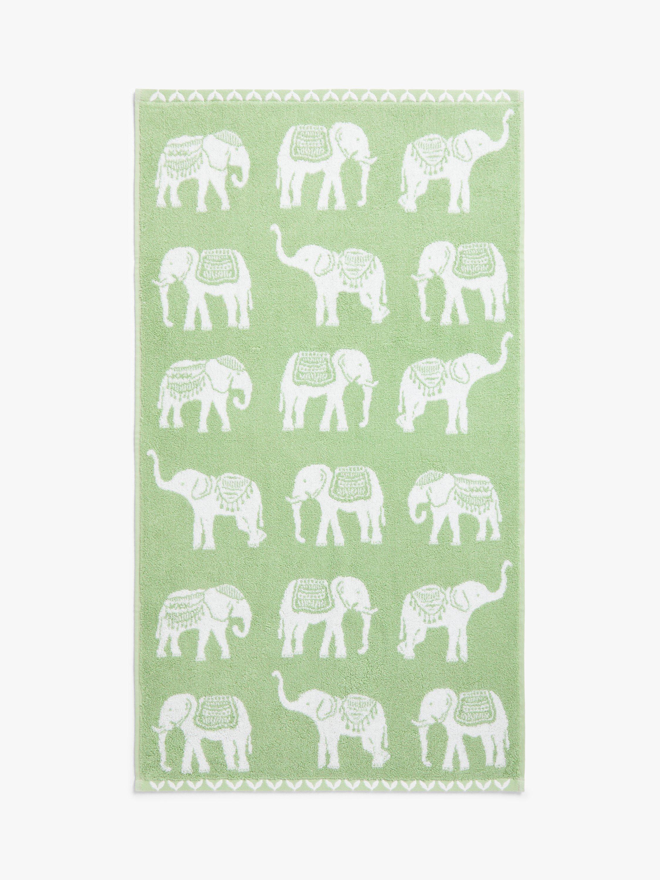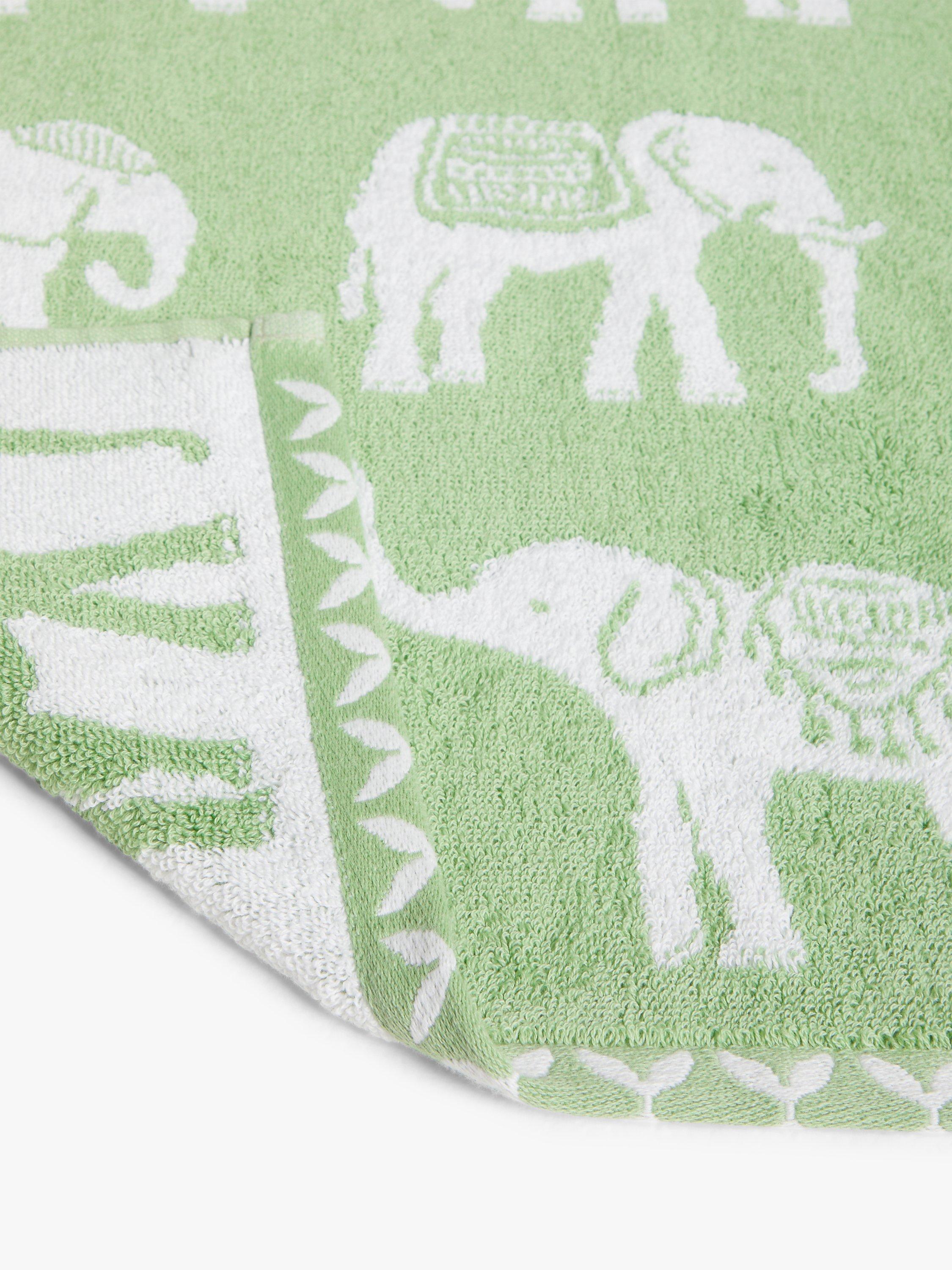 These cotton towels feature a charming motif of elephants in costume, ready to go on parade.