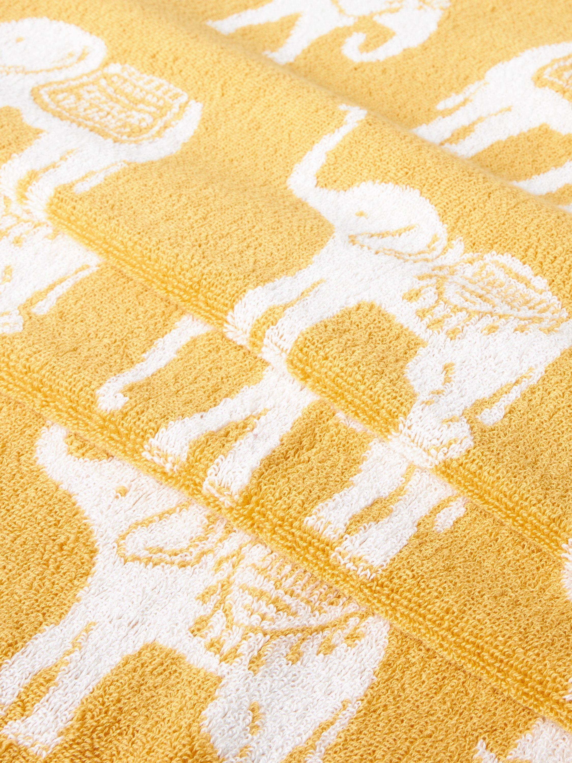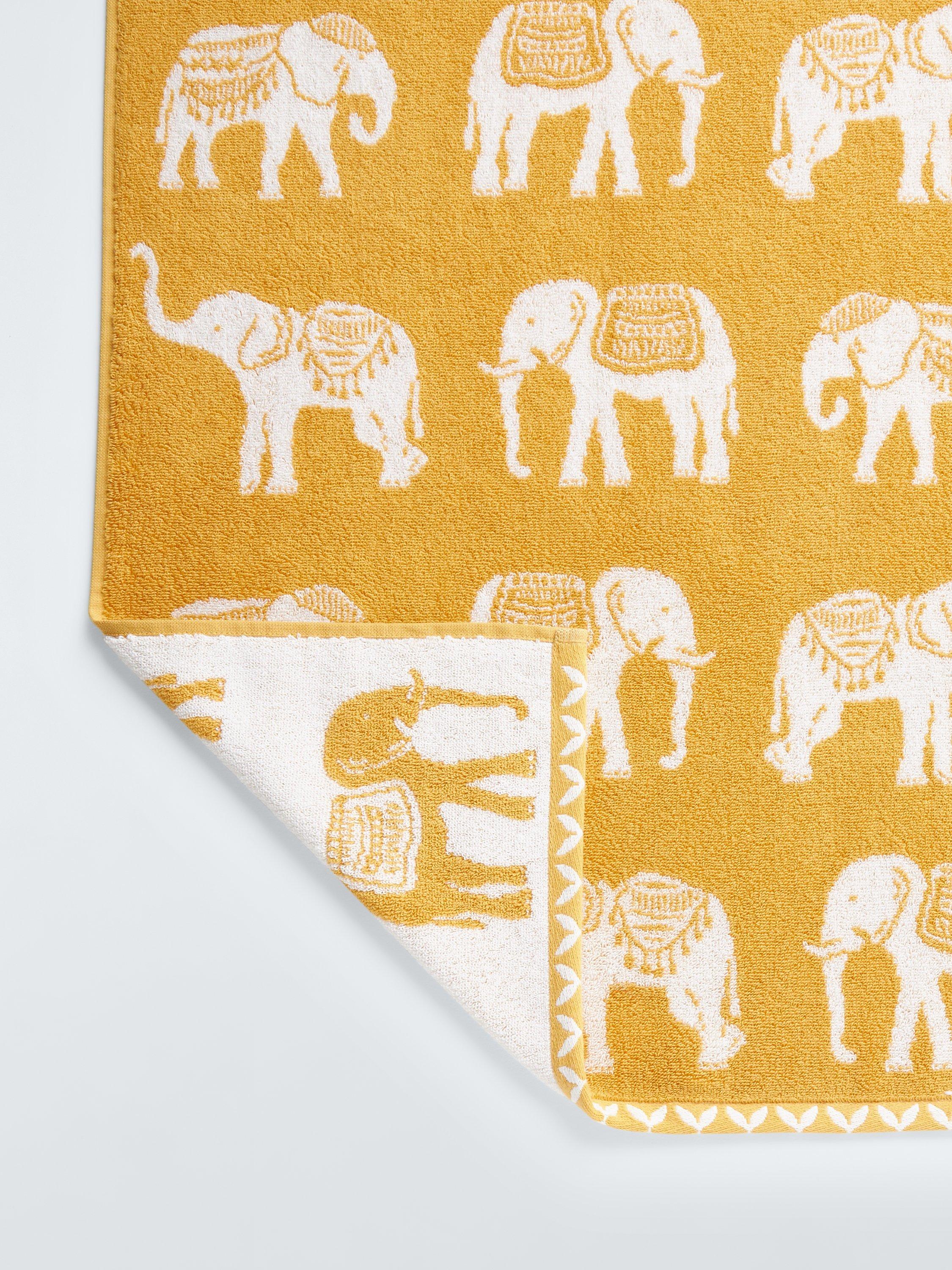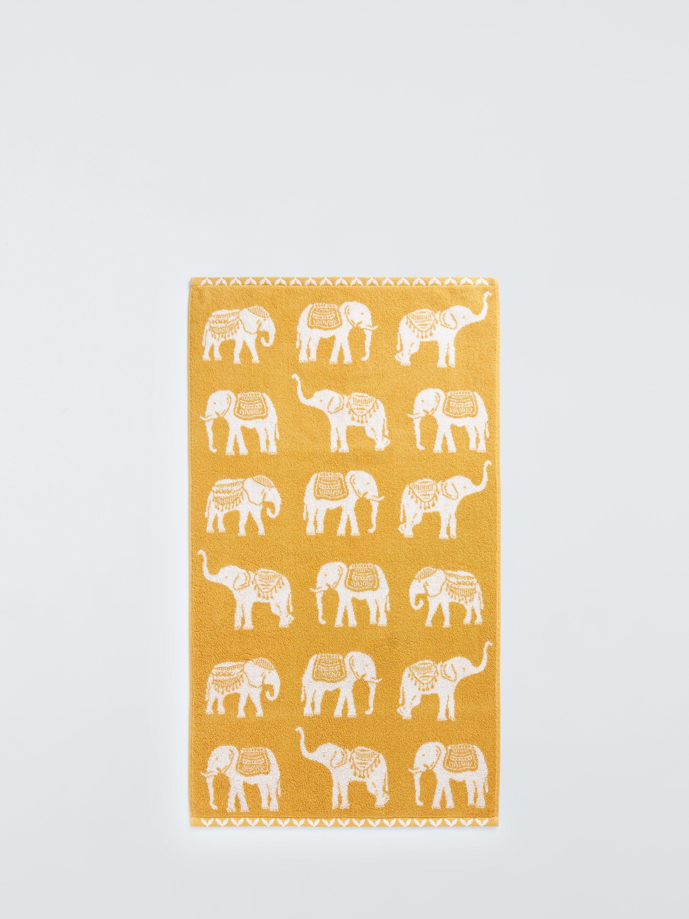 These cotton towels feature a charming motif of elephants in costume, ready to go on parade.