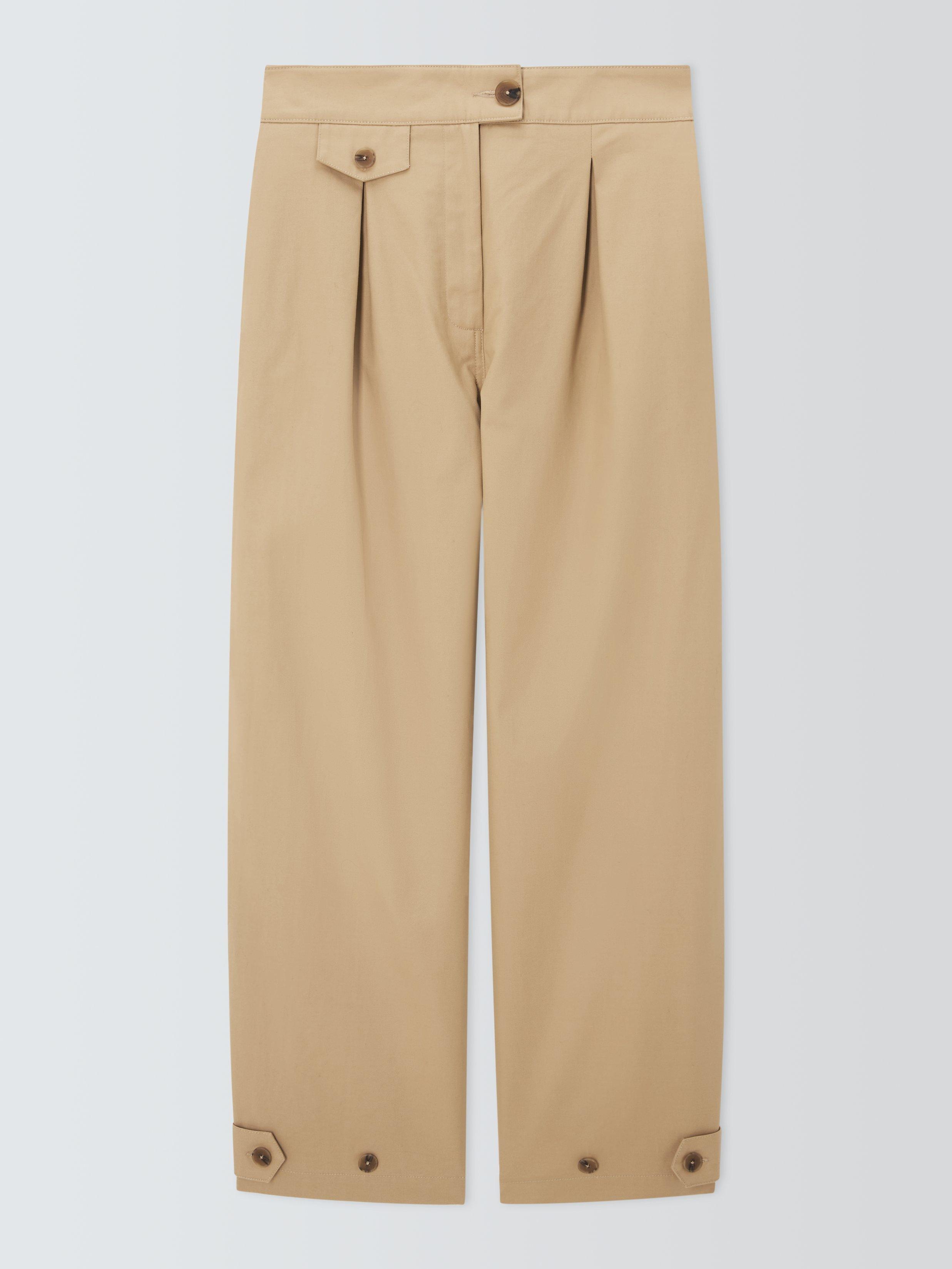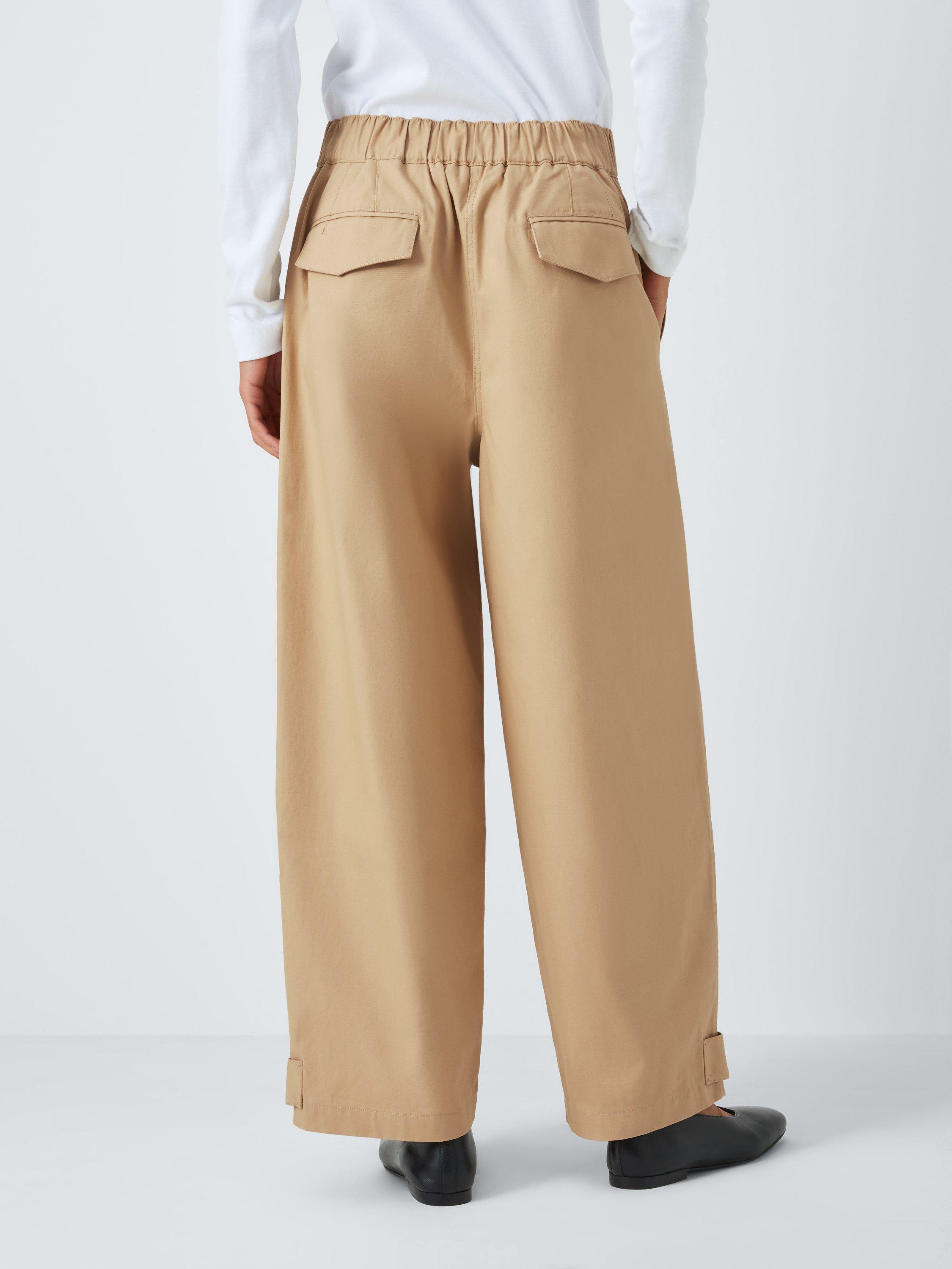 Our elevated chinos are made of breathable cotton with gathers and button details on the cuffs. Wear them with the wide-leg look or use the buttons for a tapered leg.