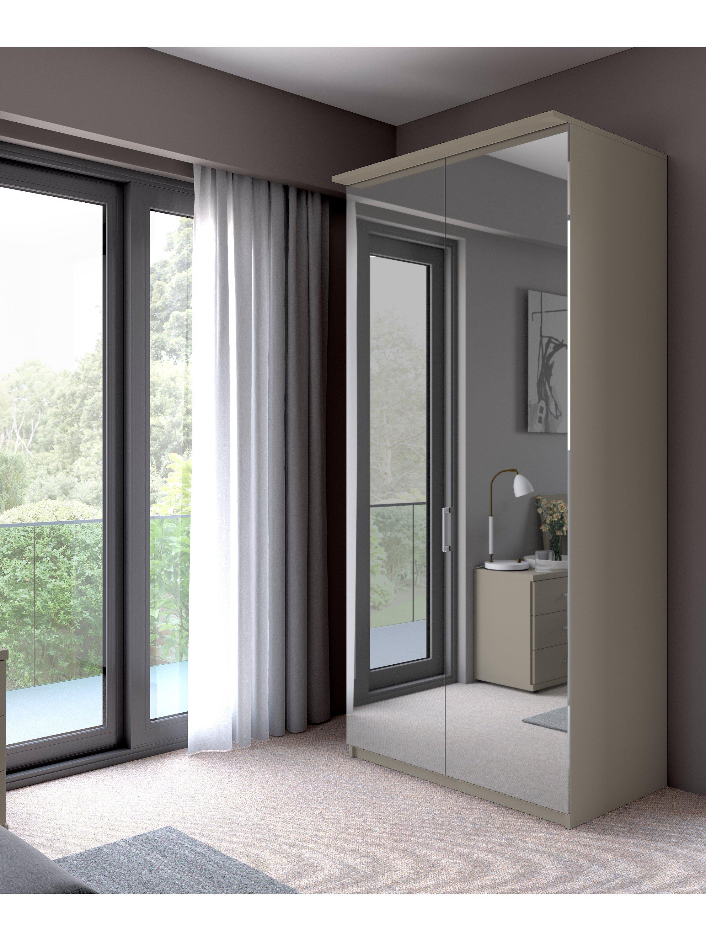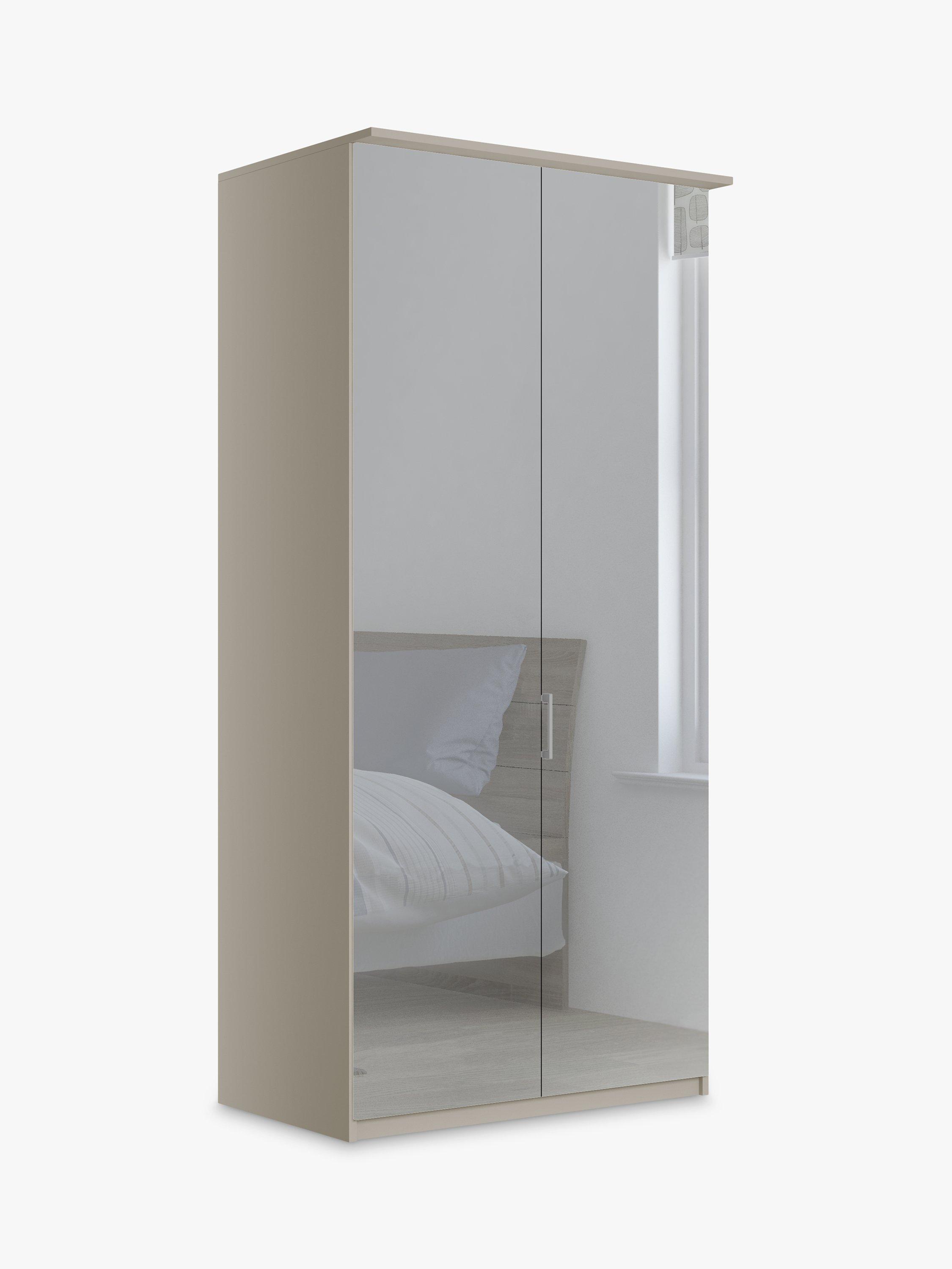 The mirrored hinged doors, featuring a single silver-tone handle, lead to a single compartment. The compartment is completed with two shelves and a hanging rail, all of which are fully adjustable for your convenience. This piece will bring bedroom interiors up-to-date, whilst offering ample storage space for clothing, accessories and bed linen.