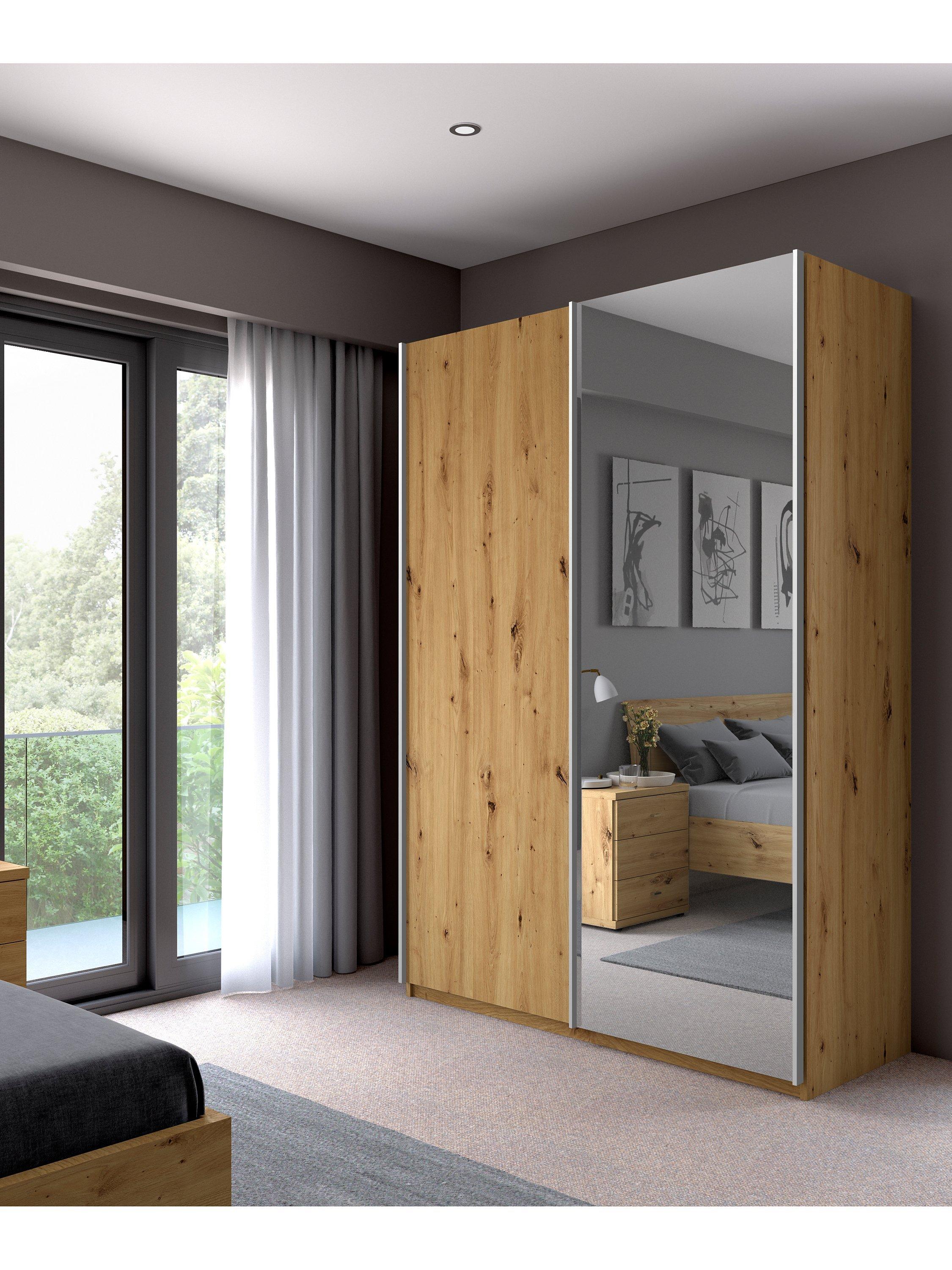 Combining style and functionality, this Elstra 150cm wardrobe has clean lines and is available in a choice of Rustic Oak or Off White finishes with a contrasting mirrored door. Its contemporary appearance brings any bedroom up to date, while soft-close sliding doors ensure versatile and discreet use even in the smallest of bedrooms.