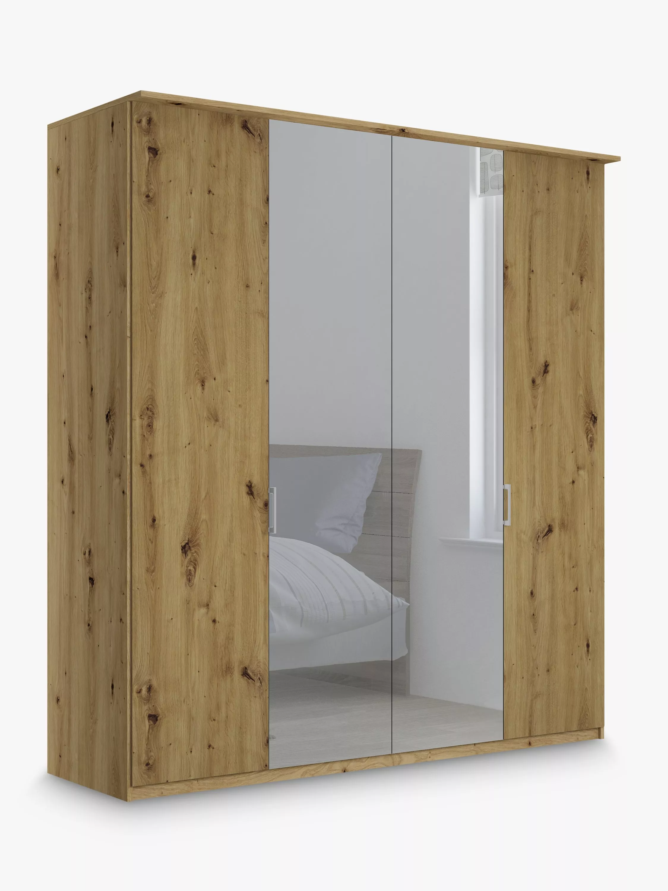Combining style and functionality, this Elstra 200cm four-door wardrobe has clean lines and an exterior complemented with an attractive cornice detail. It's available in a choice of Rustic Oak or Off White finishes with contrasting mirrored middle doors.