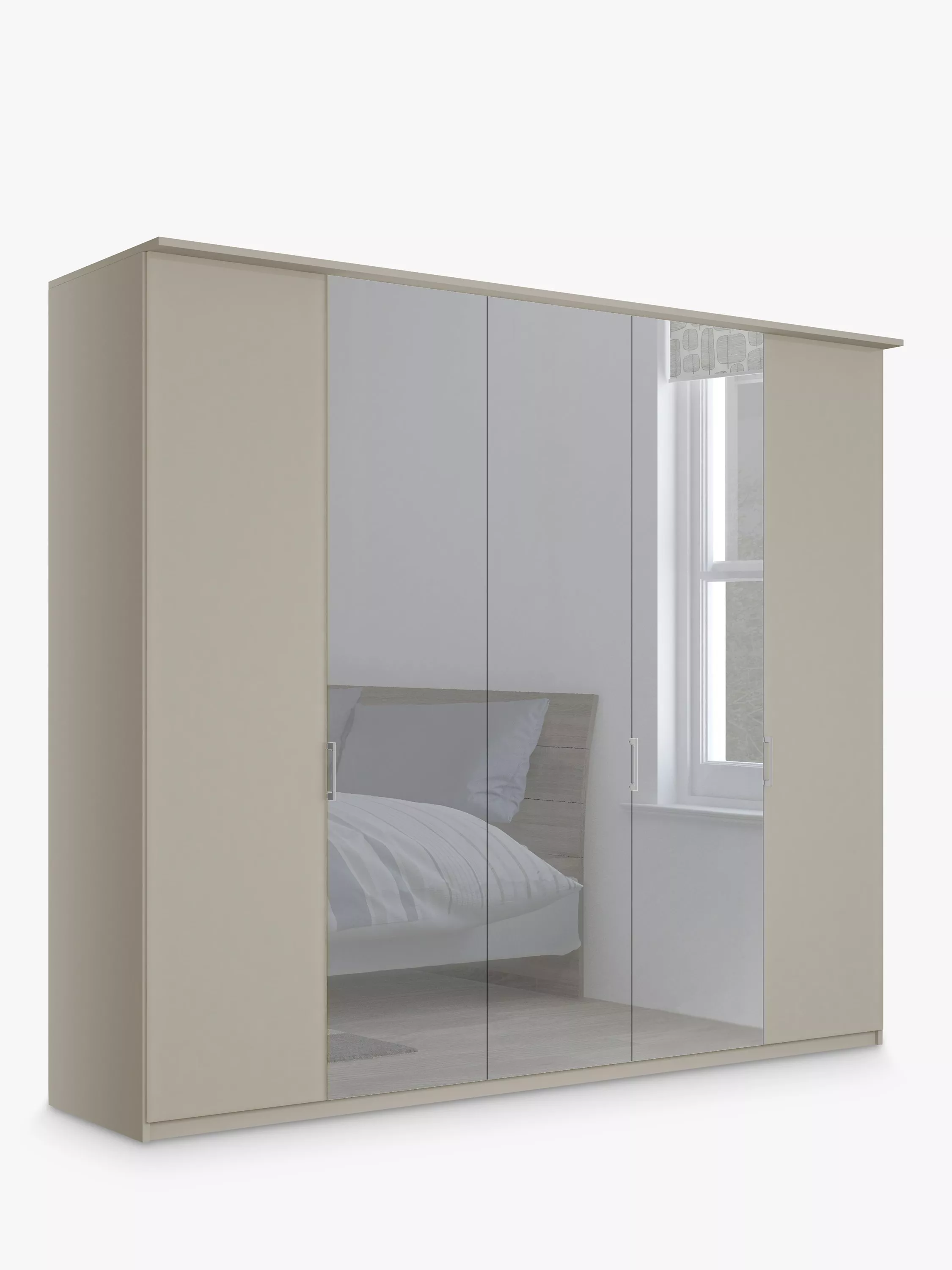 Combining style and functionality, this Elstra 250cm five-door wardrobe has clean lines and an exterior complemented with an attractive cornice detail. It's available in a choice of Rustic Oak or Off White finishes with contrasting mirrored middle doors.
